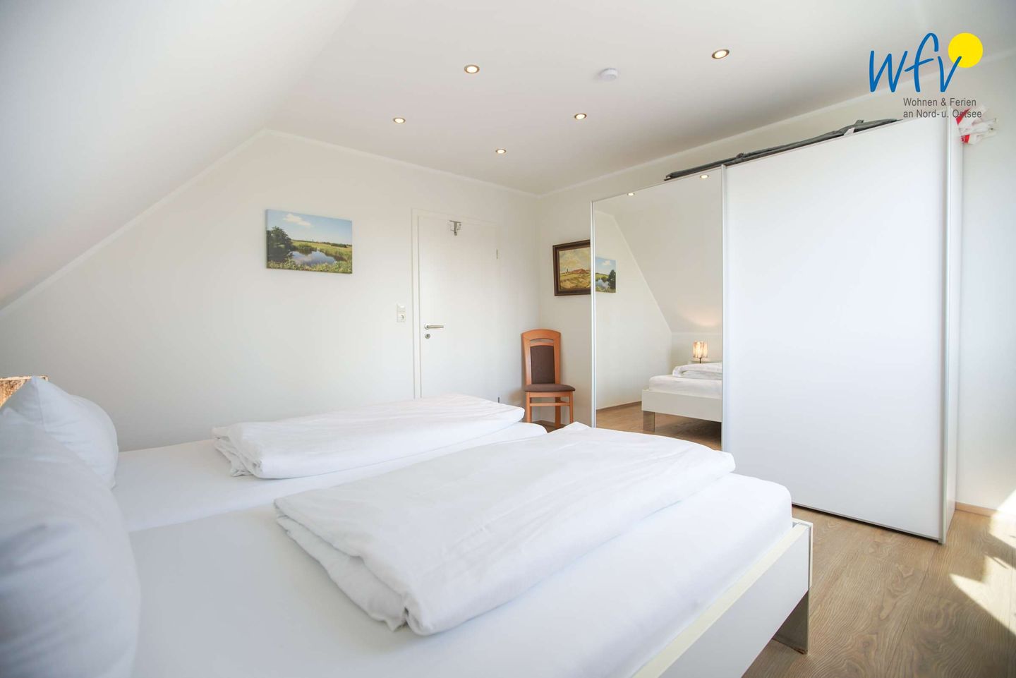 Das separate Schlafzimmer ist mit einem bequemen Komfortbett (200 cm x 200 cm) ausgestattet. Ein geräumiger Kleiderschrank bietet Platz für Ihre Urlaubsgarderobe.