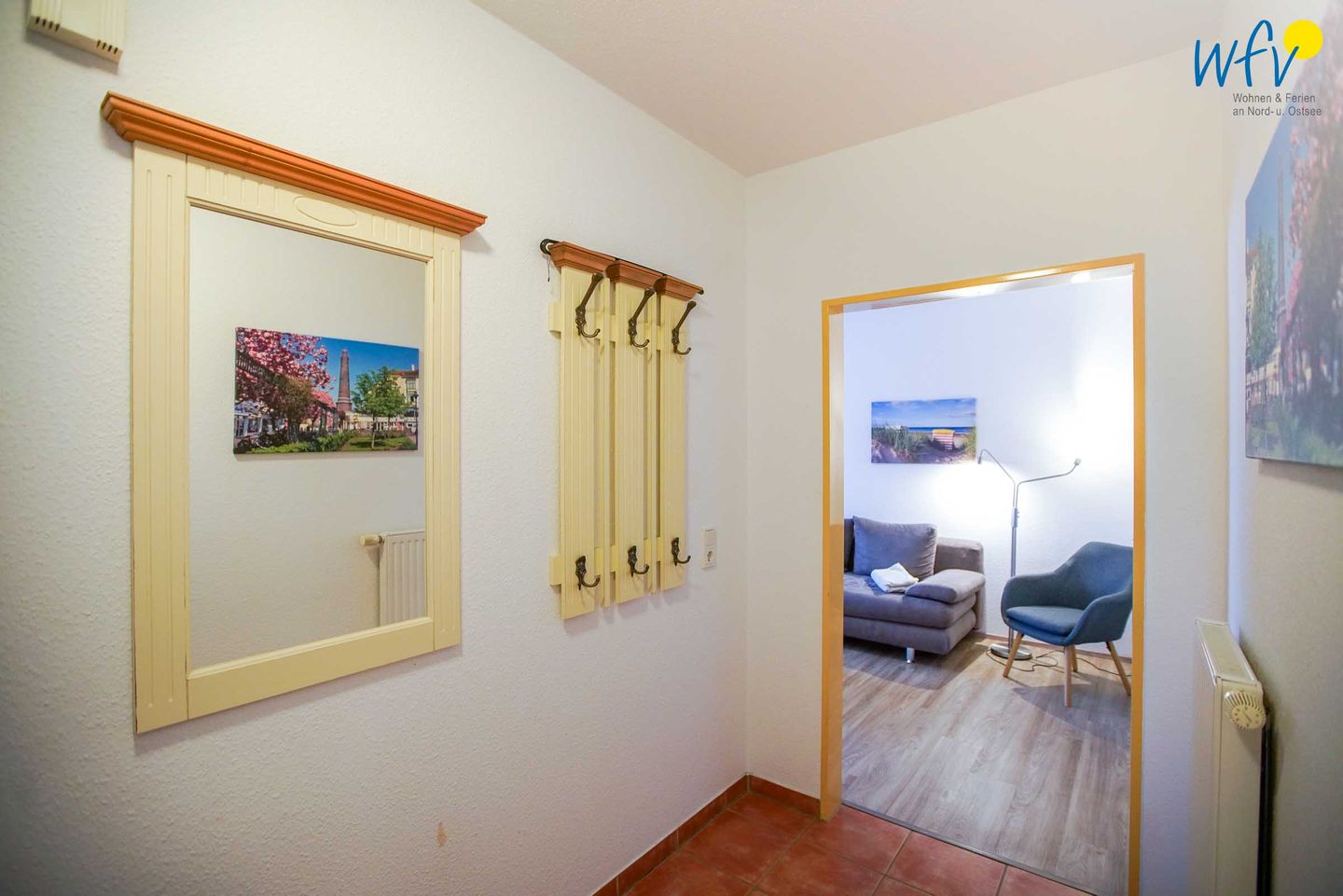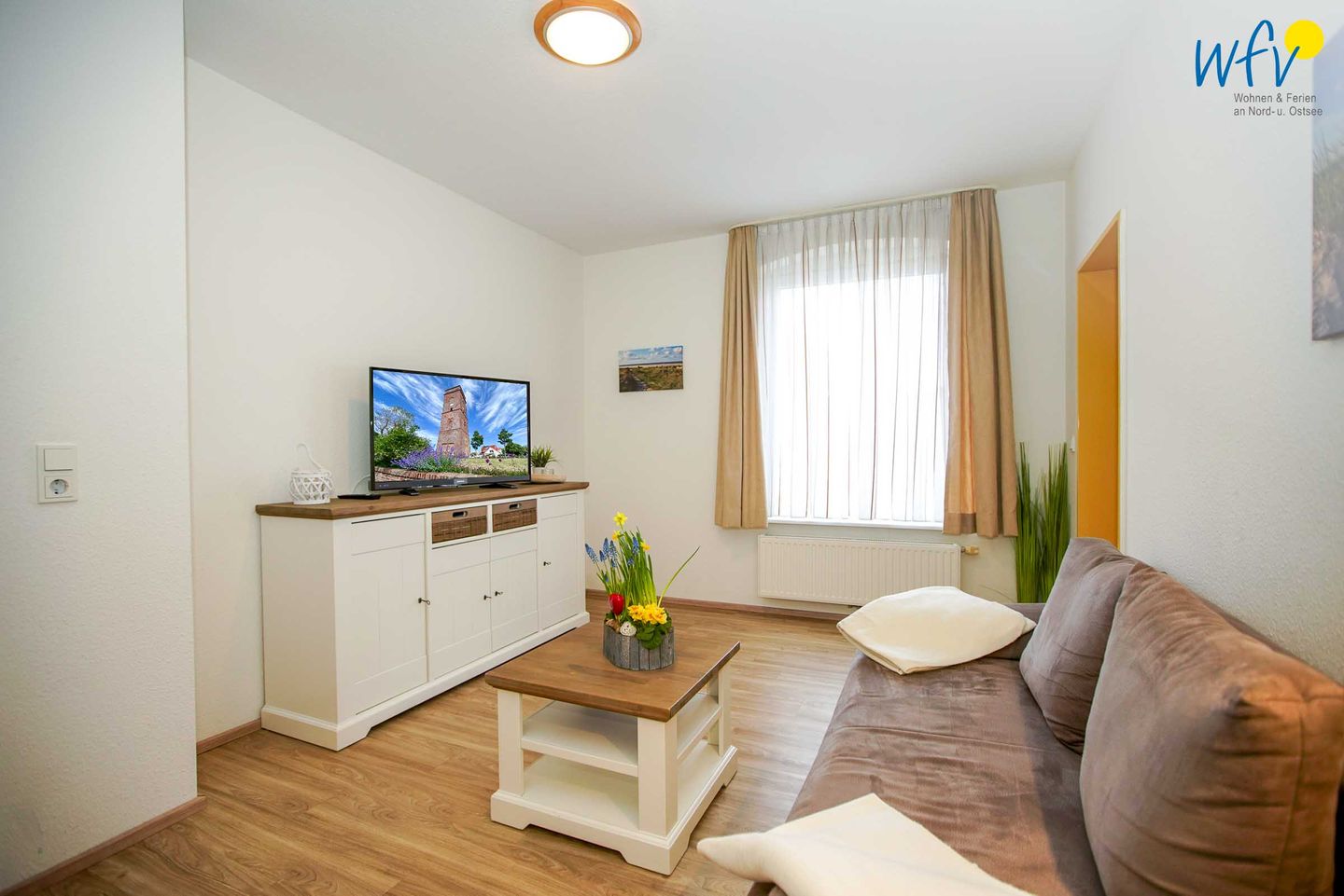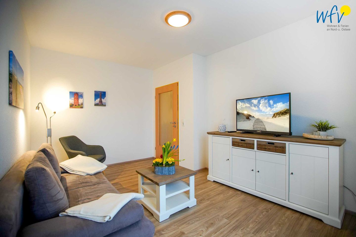 Nach dem Badetag oder der Fahrradtour können Sie im Wohnraum mit Sofa, Sesseln und TV den Urlaubstag entspannt ausklingen lassen. Zum Surfen vom Smartphone empfangen Sie freies WLAN.