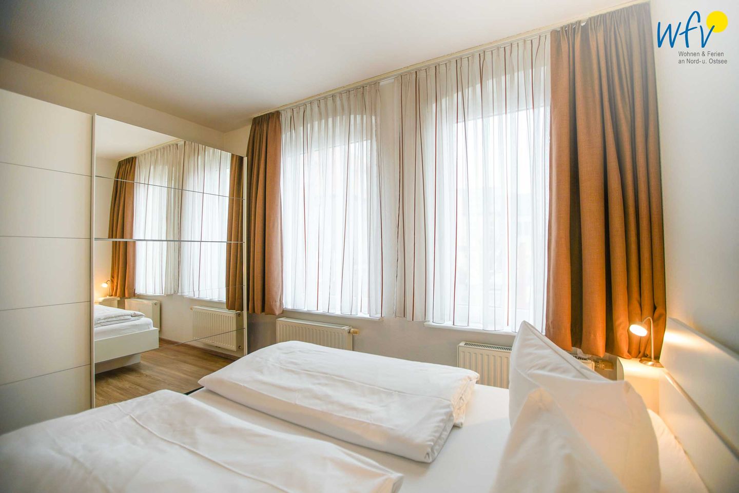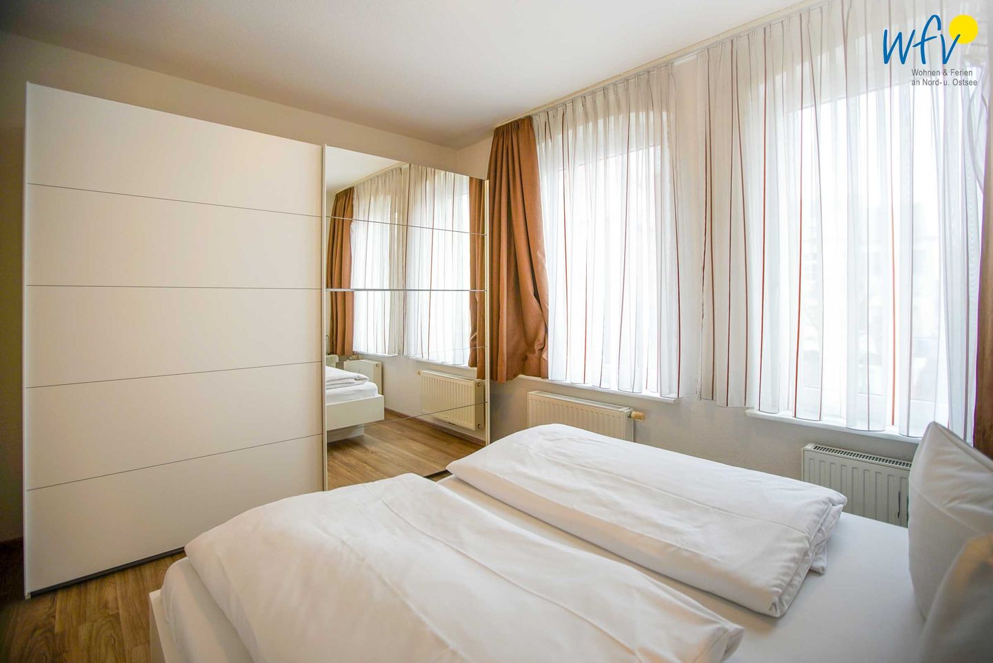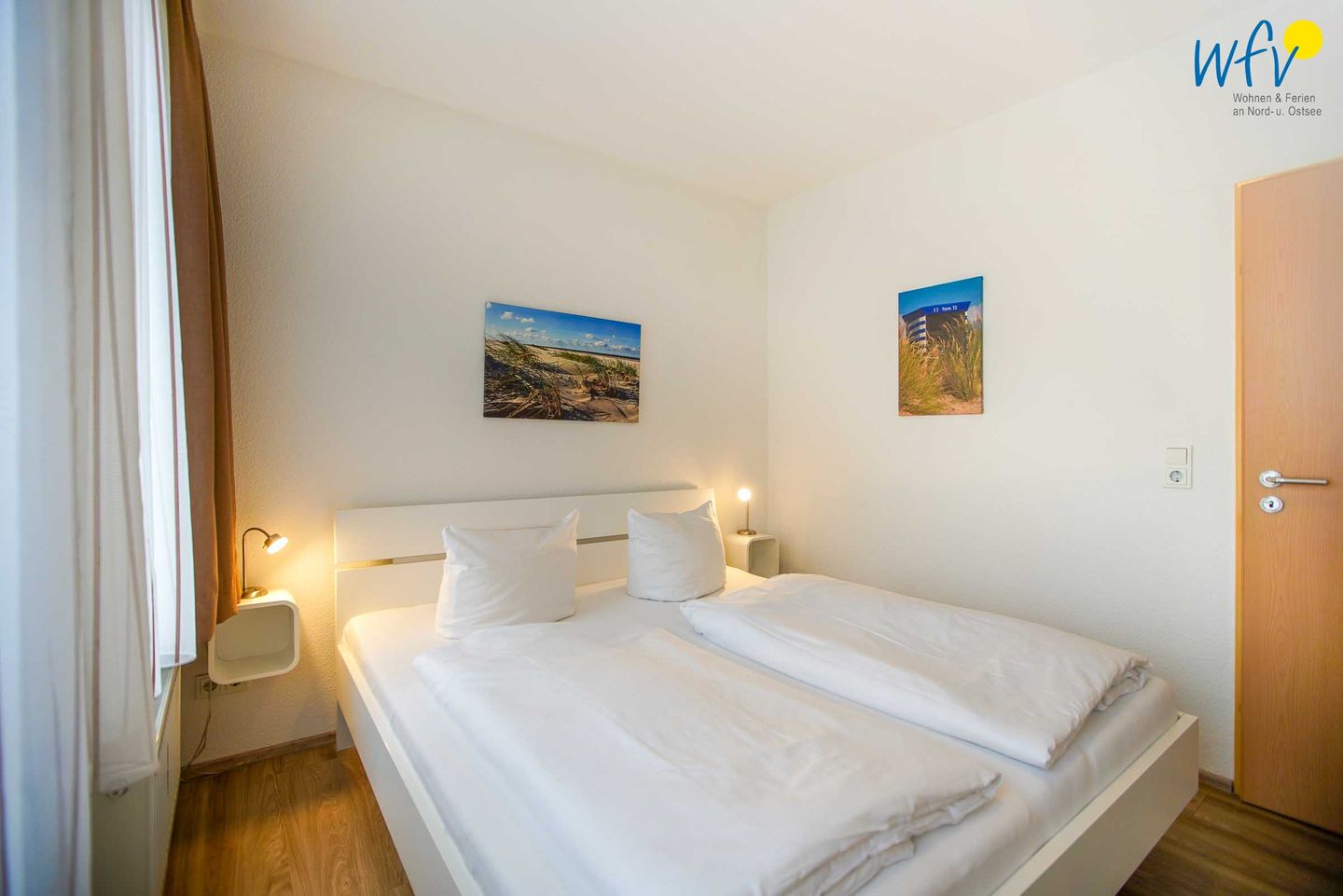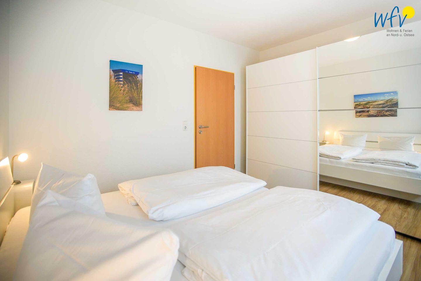 Das separate Schlafzimmer ist mit einem Doppelbett (200 x 200 cm) und einem geräumigen Kleiderschrank für Ihre Urlaubsgarderobe eingerichtet.