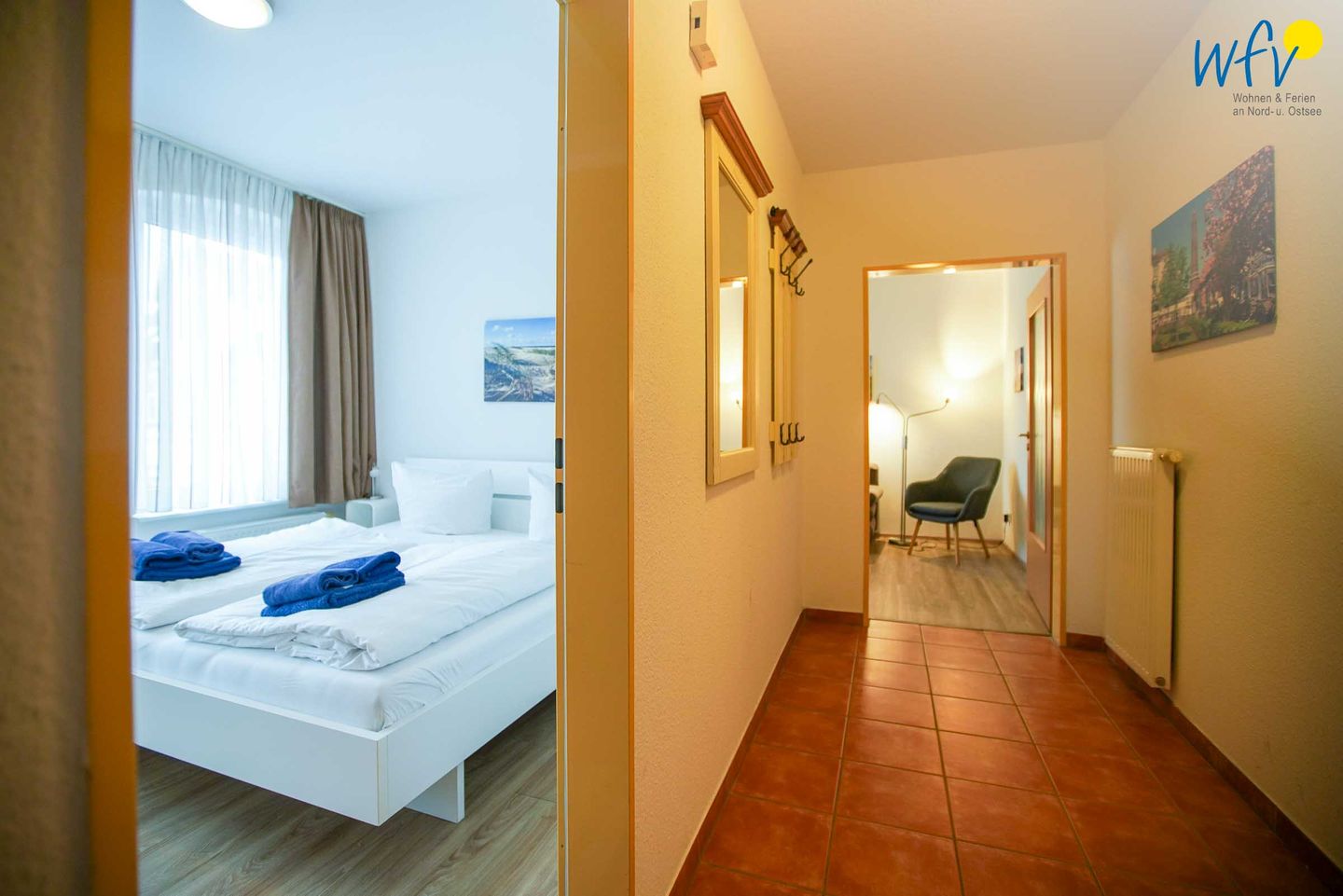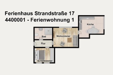 Die "Ferienwohnung 1" verfügt über insgesamt drei Zimmer, darunter ein separates Schlafzimmer, ein gemütliches Wohnzimmer und eine separate Küche sowie ein gepflegtes Duschbad. Große Fenster sorgen für viel Tageslicht, moderne Möbel für Gemütlichkeit und schöne Inselbilder für das entsprechende Nordseeflair.
