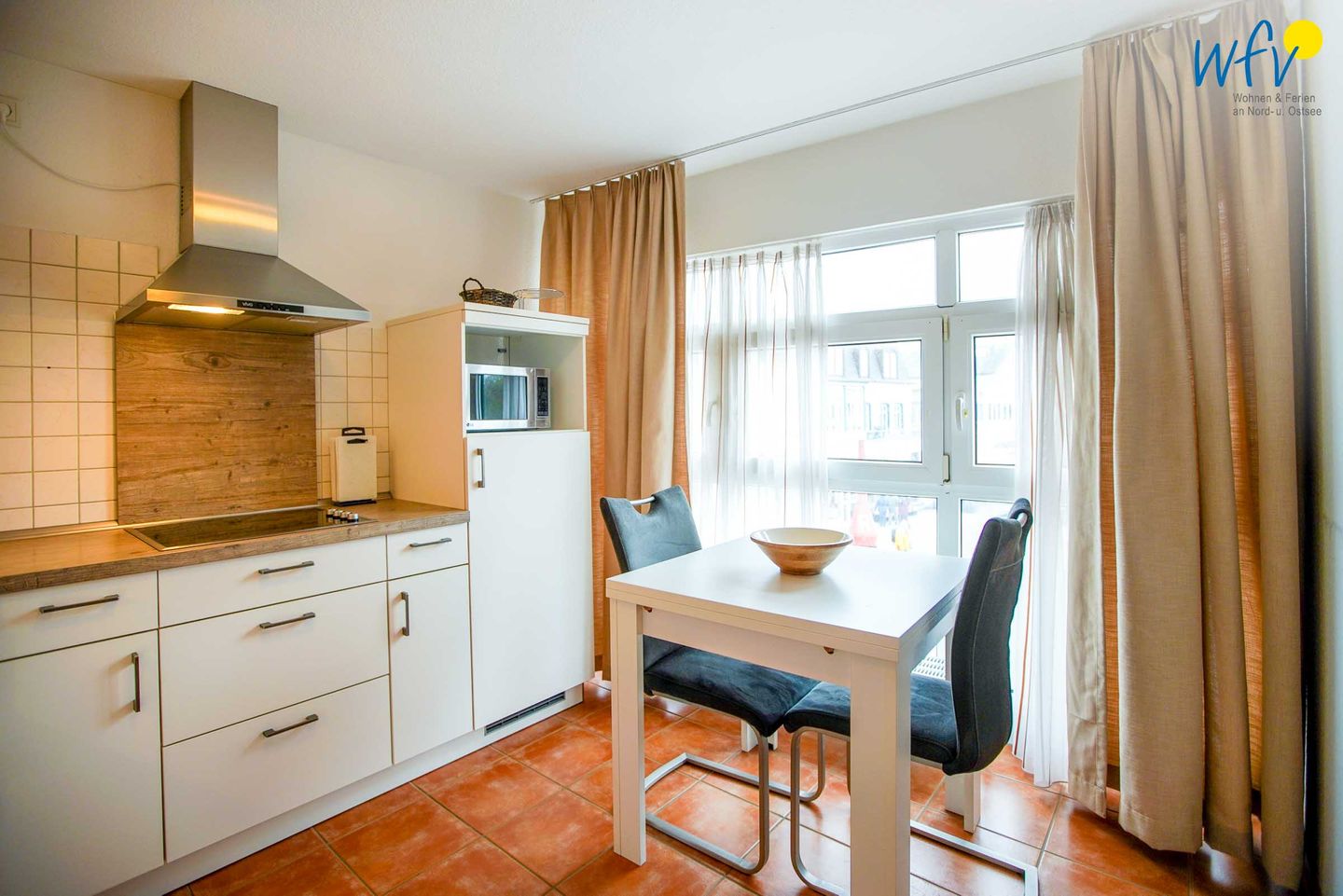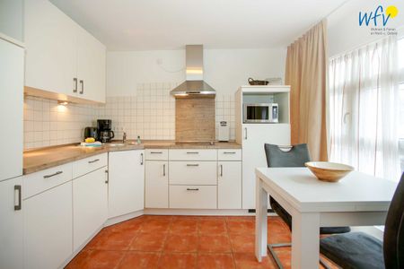 Für eine bequeme Selbstverpflegung steht Ihnen eine geschlossene vollausgestattete Küche zur Verfügung - u.a. mit Herd, Backofen, Mikrowelle und Spülmaschine sowie diversen Kleingeräten. So lassen sich schnell und einfach Snacks für den Ausflug oder leckere Gerichte zubereiten. Ein Esstisch bietet Platz zum Klönen, für das Urlaubsfrühstück oder das gemeinsame Abendessen.