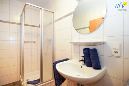 Das gepflegte Badezimmer mit Dusche, WC, Waschbecken, Haartrockner und einem Spiegel sorgt für weiteren Komfort.
