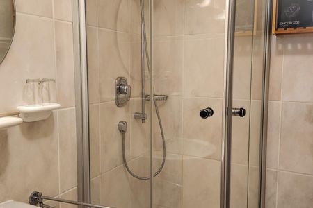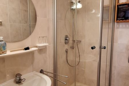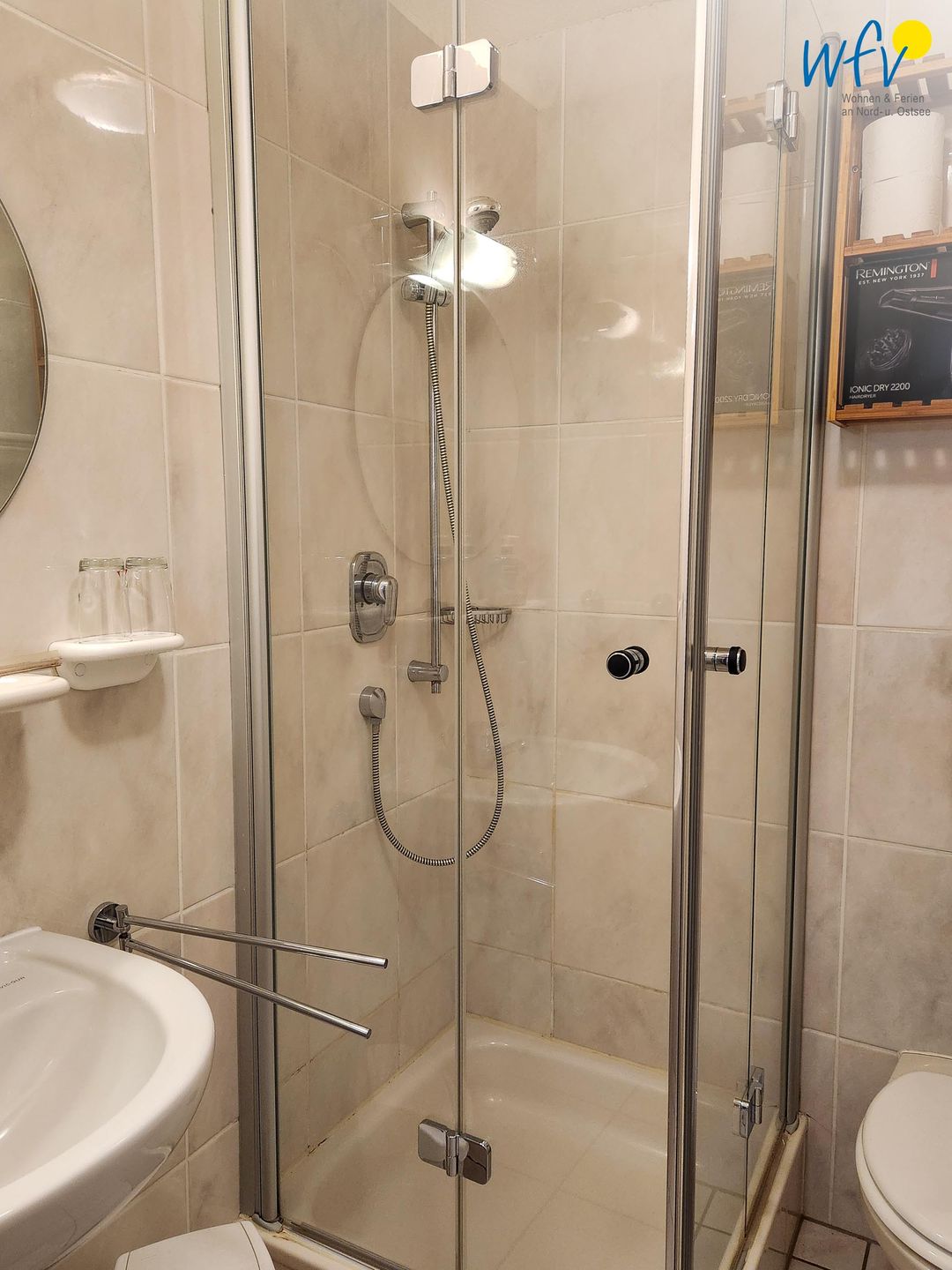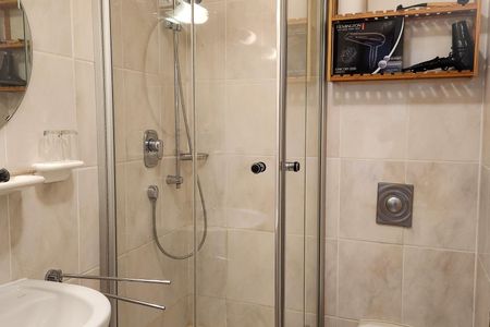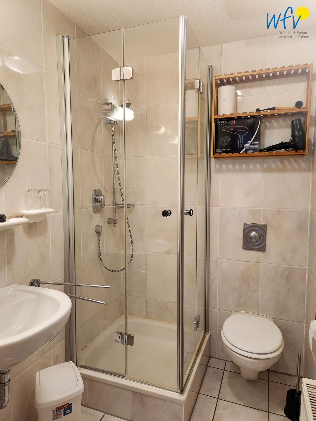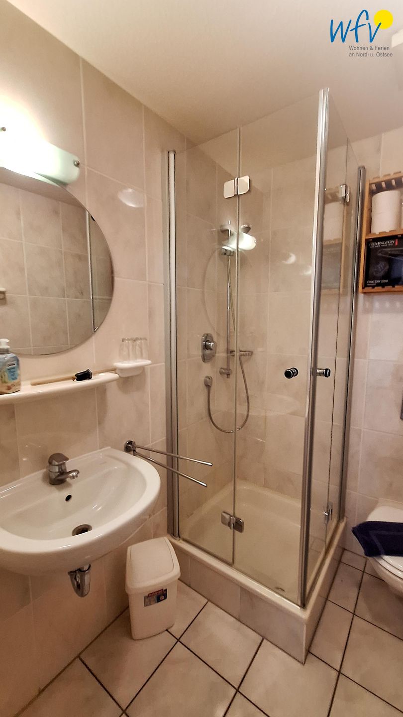Das moderne Badezimmer mit Dusche, WC, Waschbecken mit Spiegel und Föhn ergänzt den Wohnkomfort.