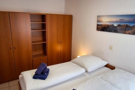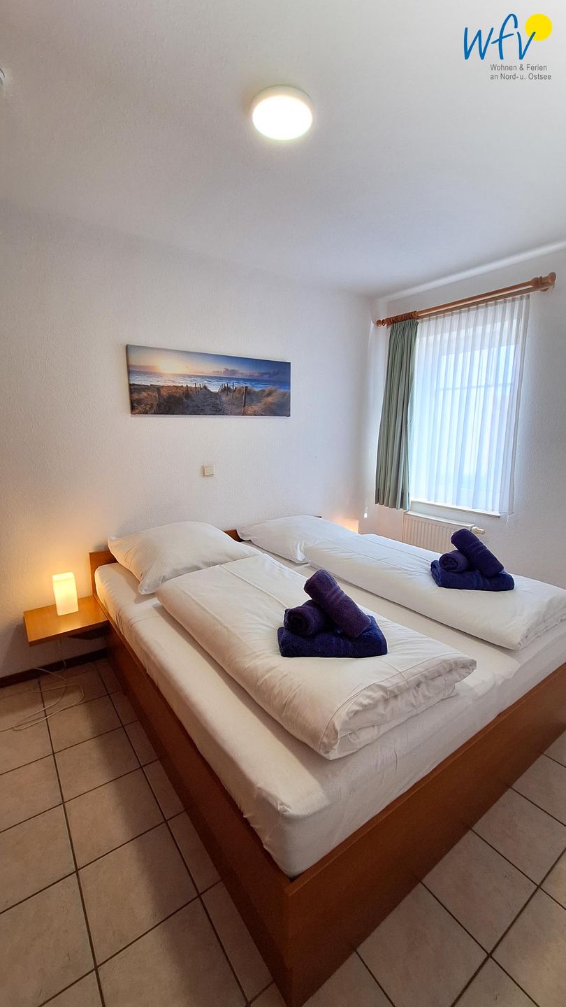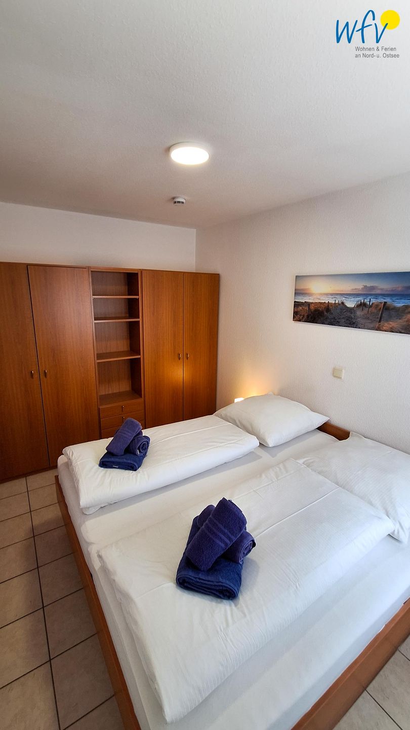 Das separate Schlafzimmer ist mit einem Doppelbett (2 x 90 x 200 cm) und einem geräumigen Kleiderschrank eingerichtet. Eine Garderobe im Flur ermöglicht eine weitere Ablage von Kleidung und Schuhen.