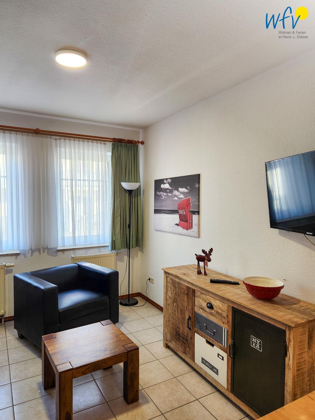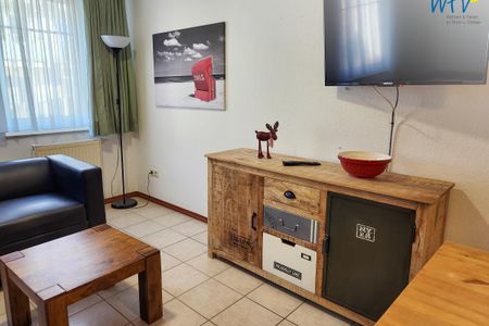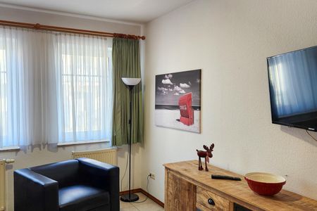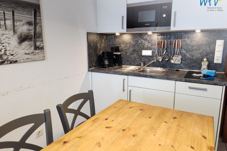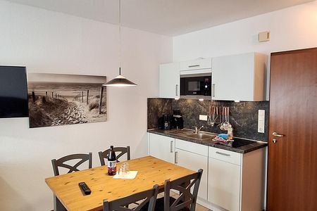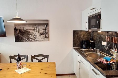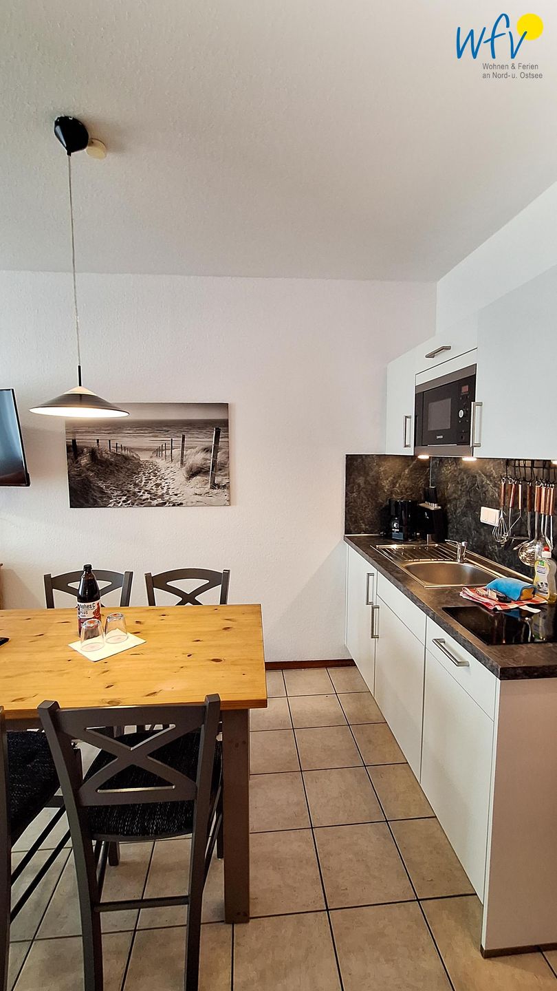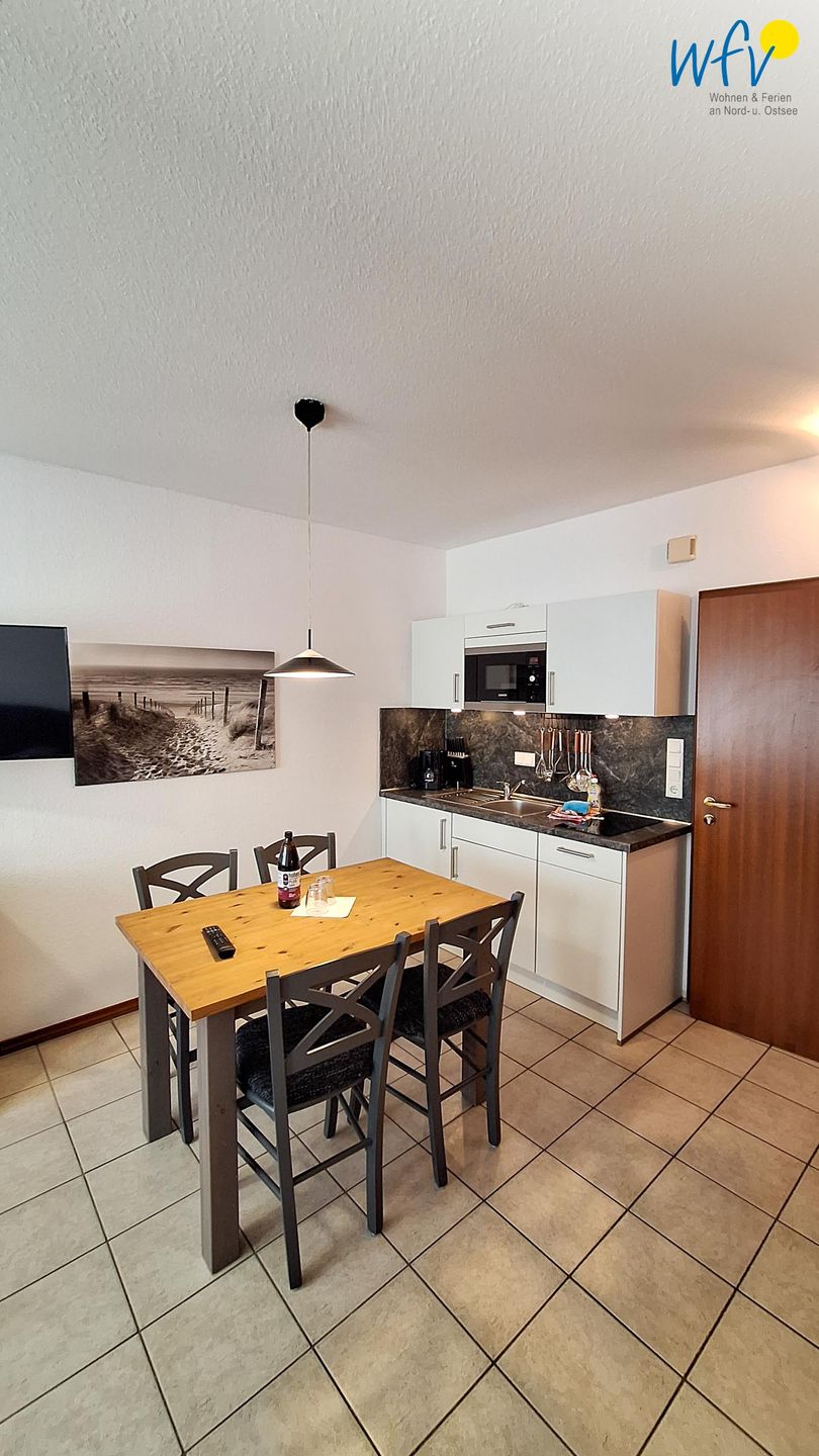 Nach dem Badetag oder der Fahrradtour lädt der Wohnraum mit Sofa, Sessel und TV zu gemütlichen Stunden ein - perfekt, um entspannt den Urlaubstag ausklingen zu lassen. Zum Surfen vom Smartphone empfangen Sie freies WLAN. Ein Esstisch bietet Platz zum Klönen, für das Urlaubsfrühstück oder das gemeinsame Abendessen.