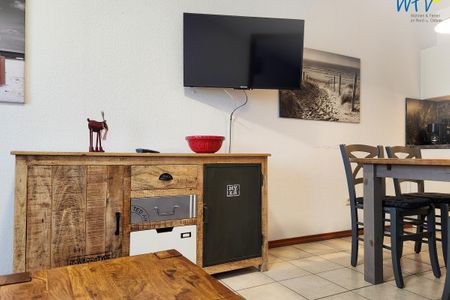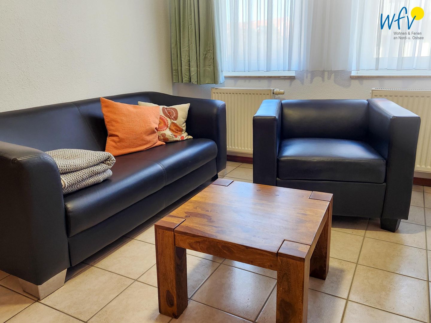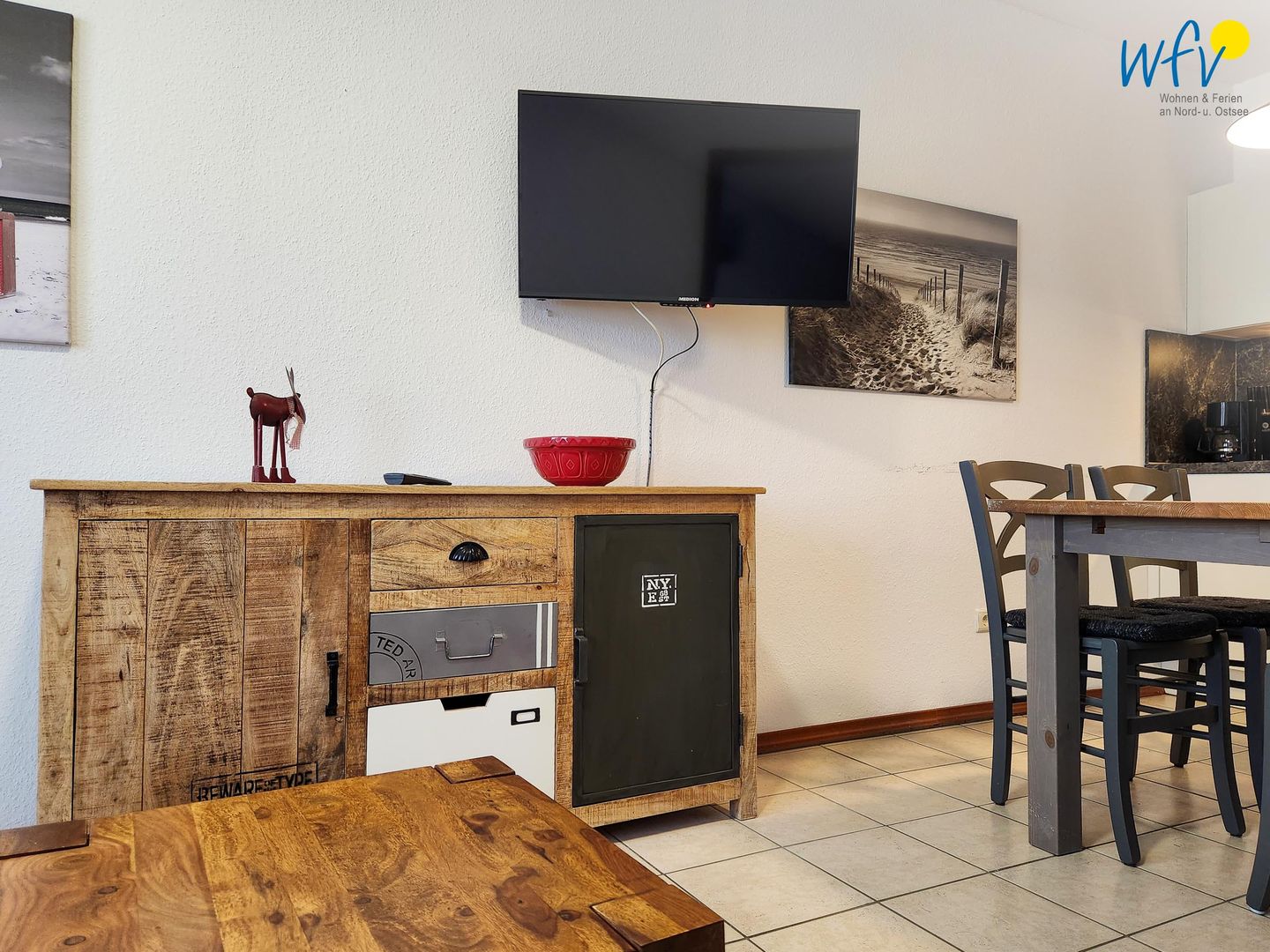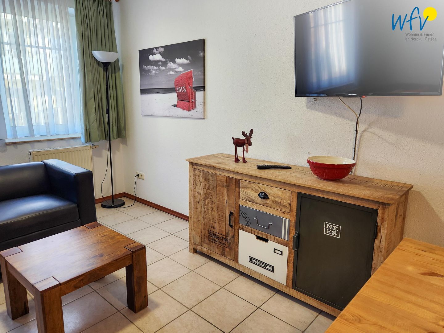 Nach dem Badetag oder der Fahrradtour lädt der Wohnraum mit Sofa, Sessel und TV zu gemütlichen Stunden ein - perfekt, um entspannt den Urlaubstag ausklingen zu lassen. Zum Surfen vom Smartphone empfangen Sie freies WLAN. Ein Esstisch bietet Platz zum Klönen, für das Urlaubsfrühstück oder das gemeinsame Abendessen.