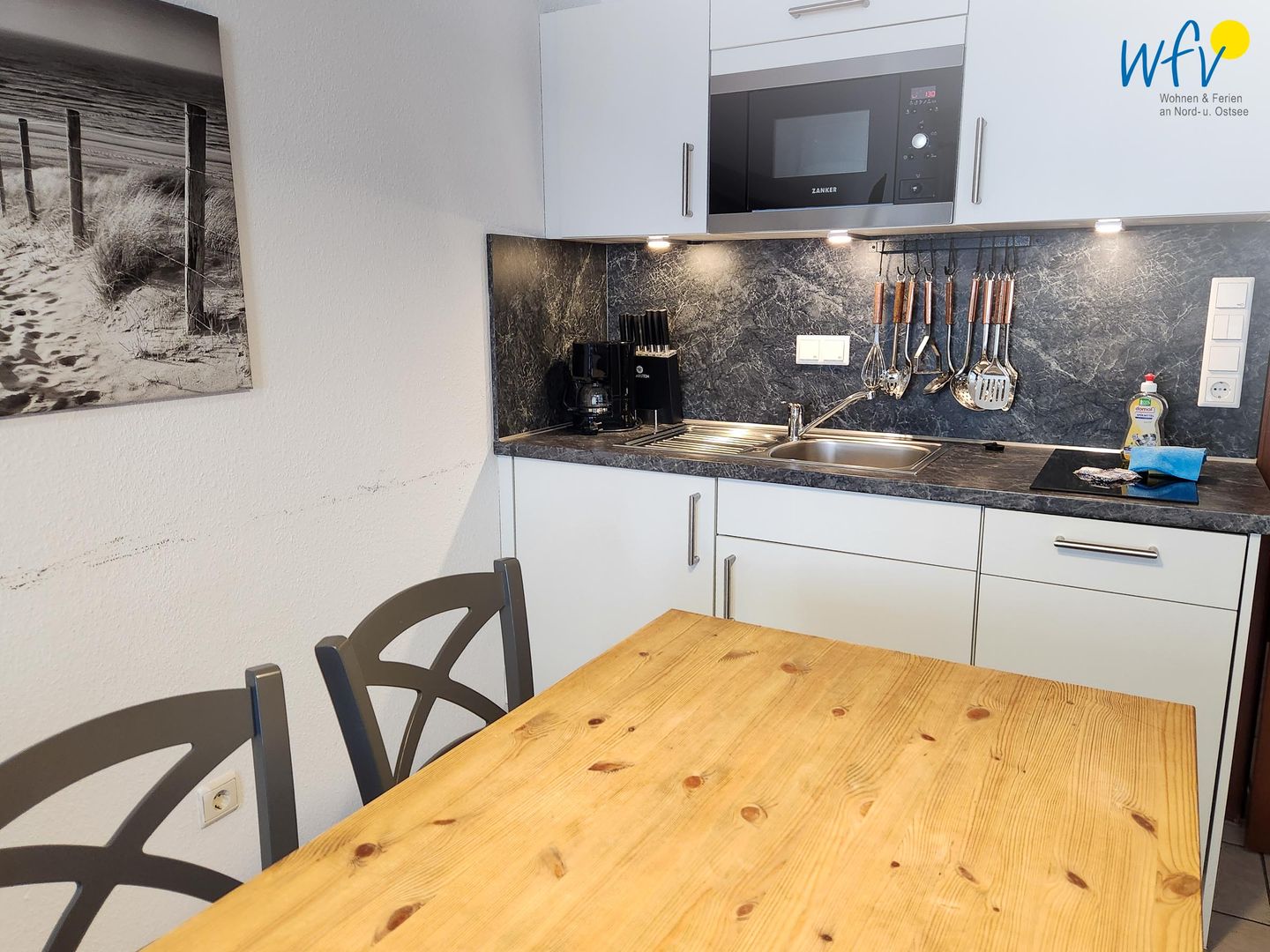In der modernen offenen Küche lassen sich schnell und einfach Snacks für den Ausflug oder leckere Gerichte zubereiten. Ausgestattet ist sie u.a. mit einem 2-Platten-Ceranherd, Mikrowelle und Spülmaschine sowie diversen Kleingeräten.