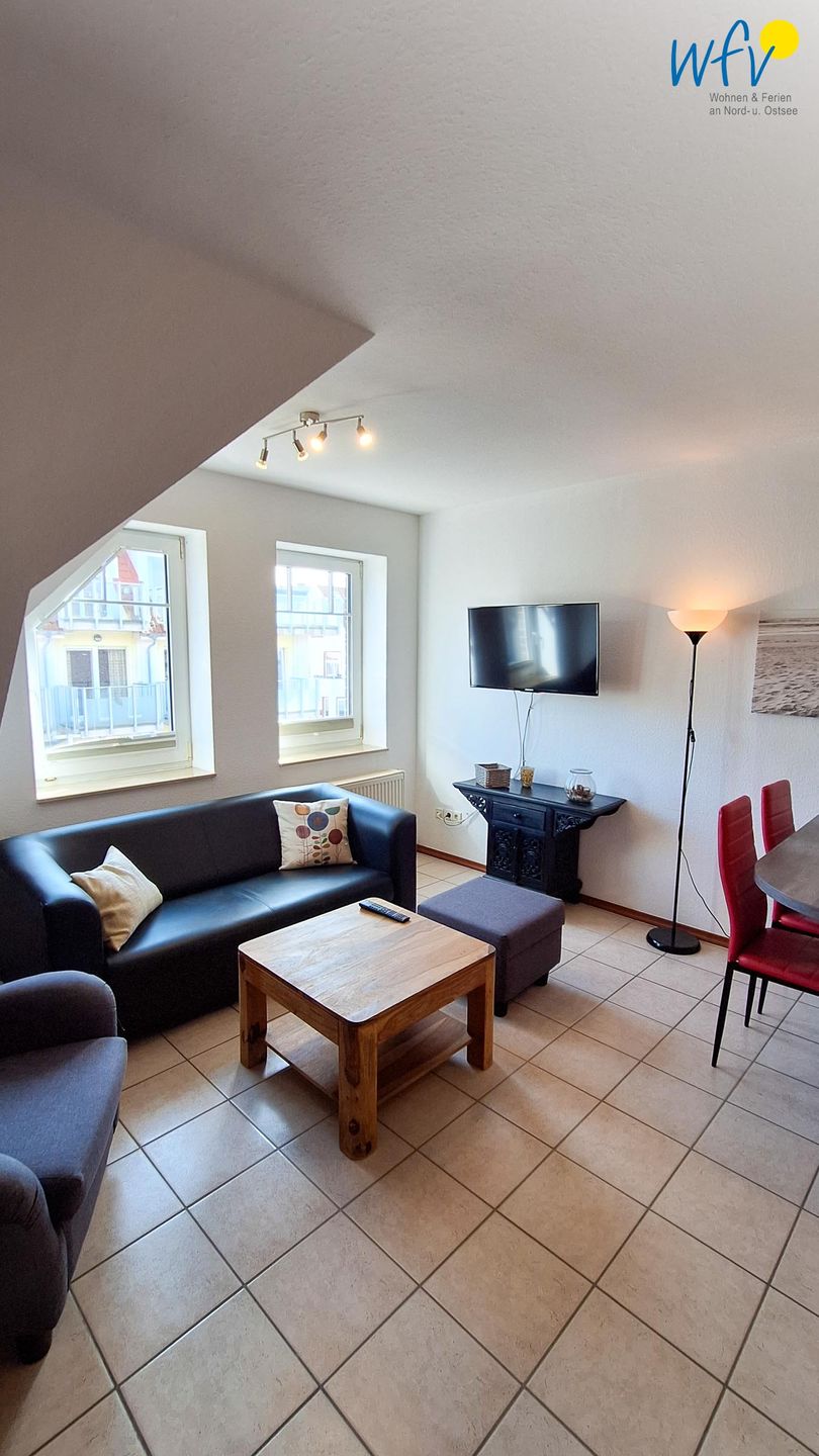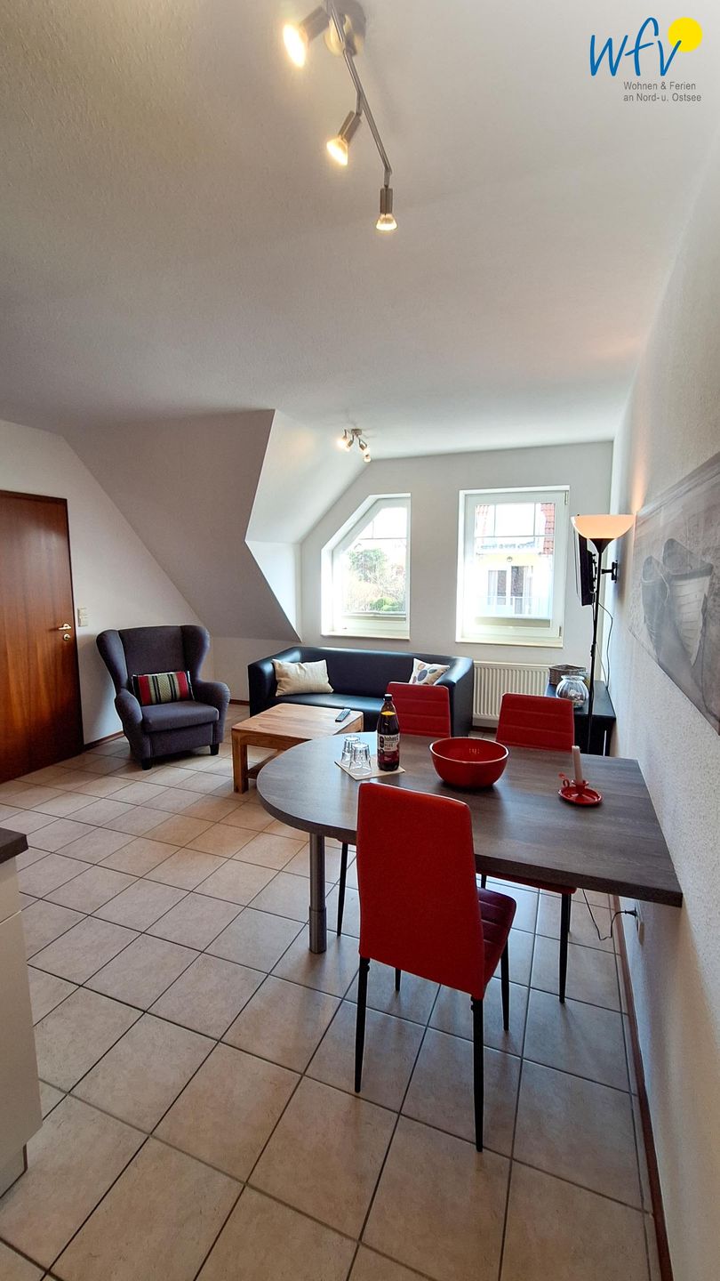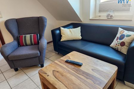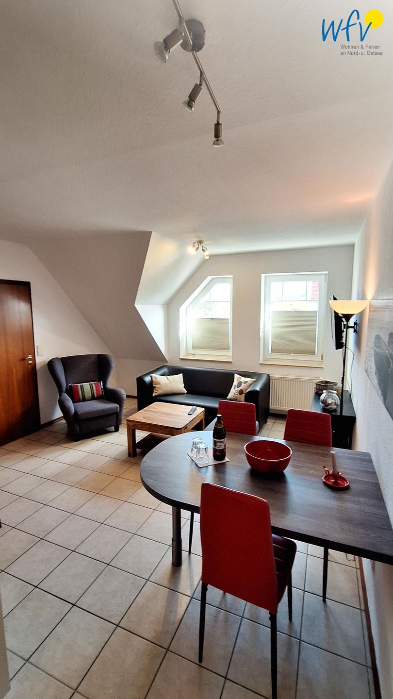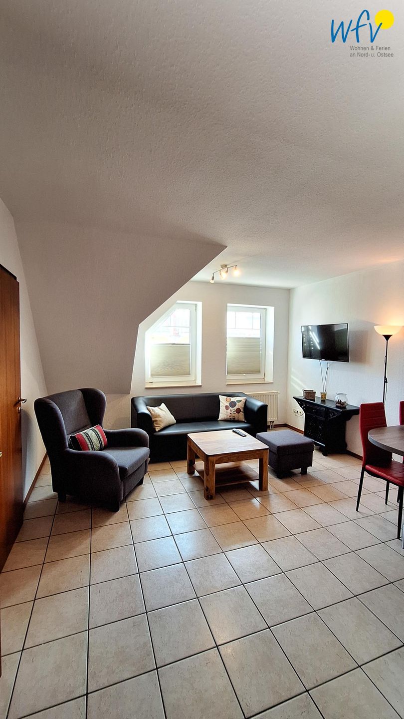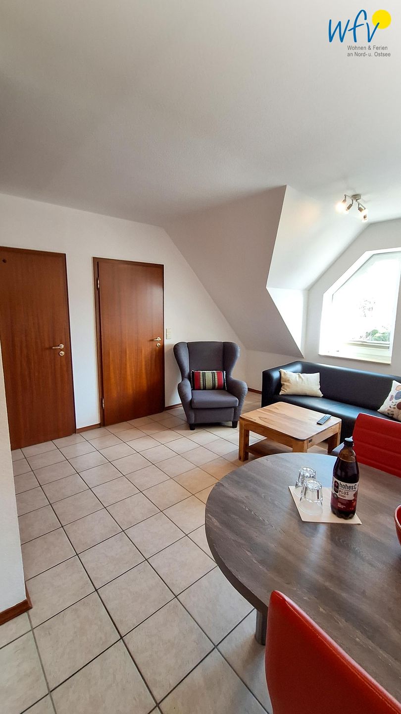Nach dem Badetag oder der Fahrradtour lädt der Wohnraum mit Sofa, Sessel und TV zu gemütlichen Stunden ein - perfekt, um entspannt den Urlaubstag ausklingen zu lassen. Zum Surfen vom Smartphone empfangen Sie freies WLAN. Ein Esstisch bietet Platz zum Klönen, für das Urlaubsfrühstück oder das gemeinsame Abendessen.
