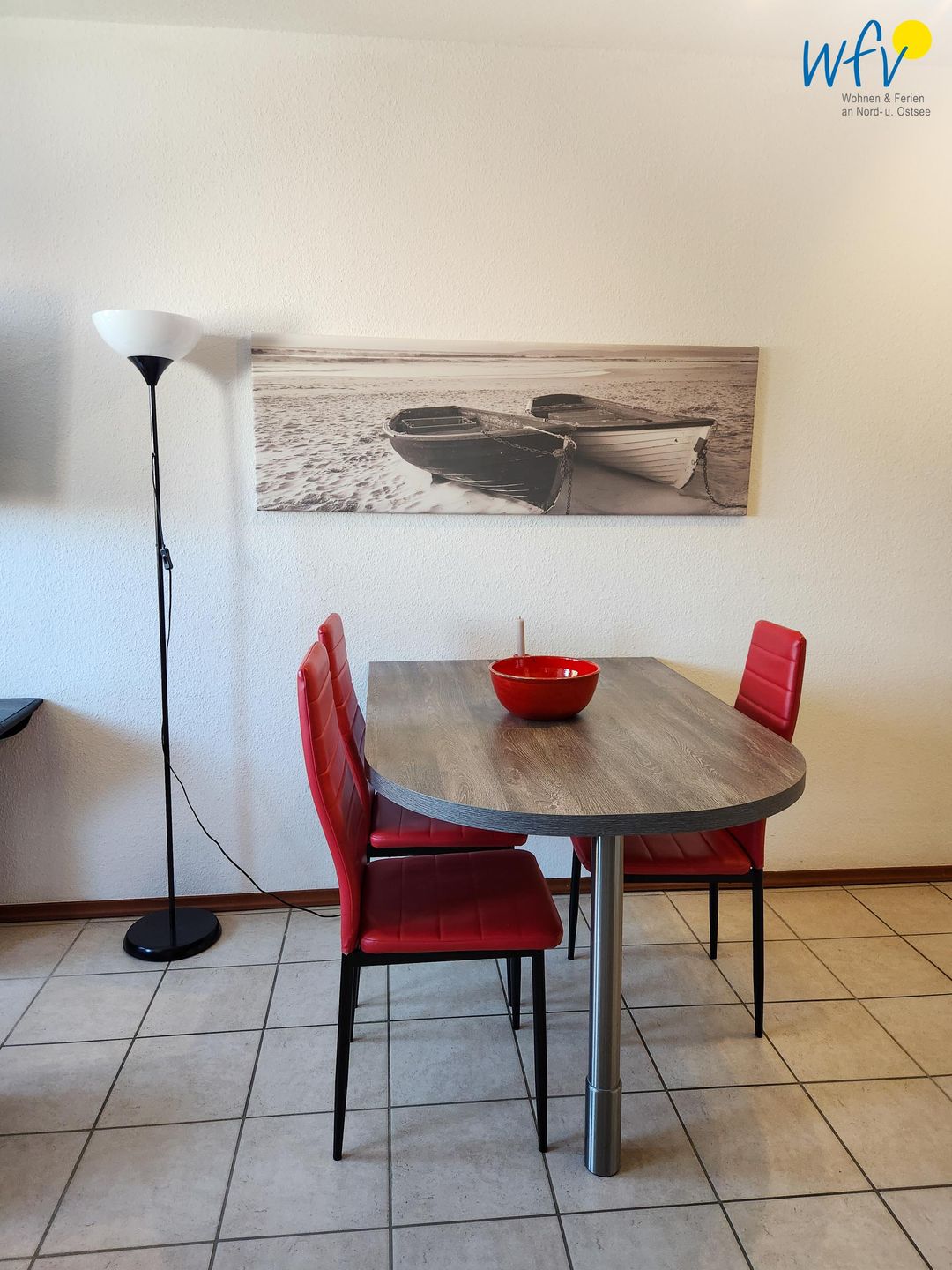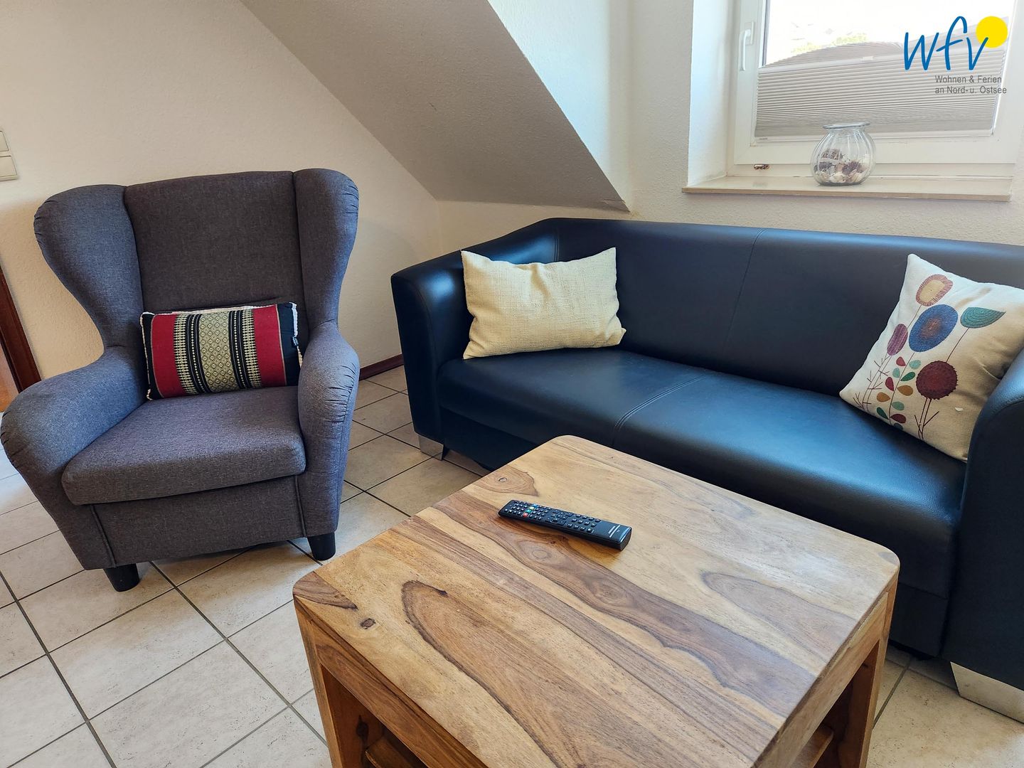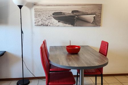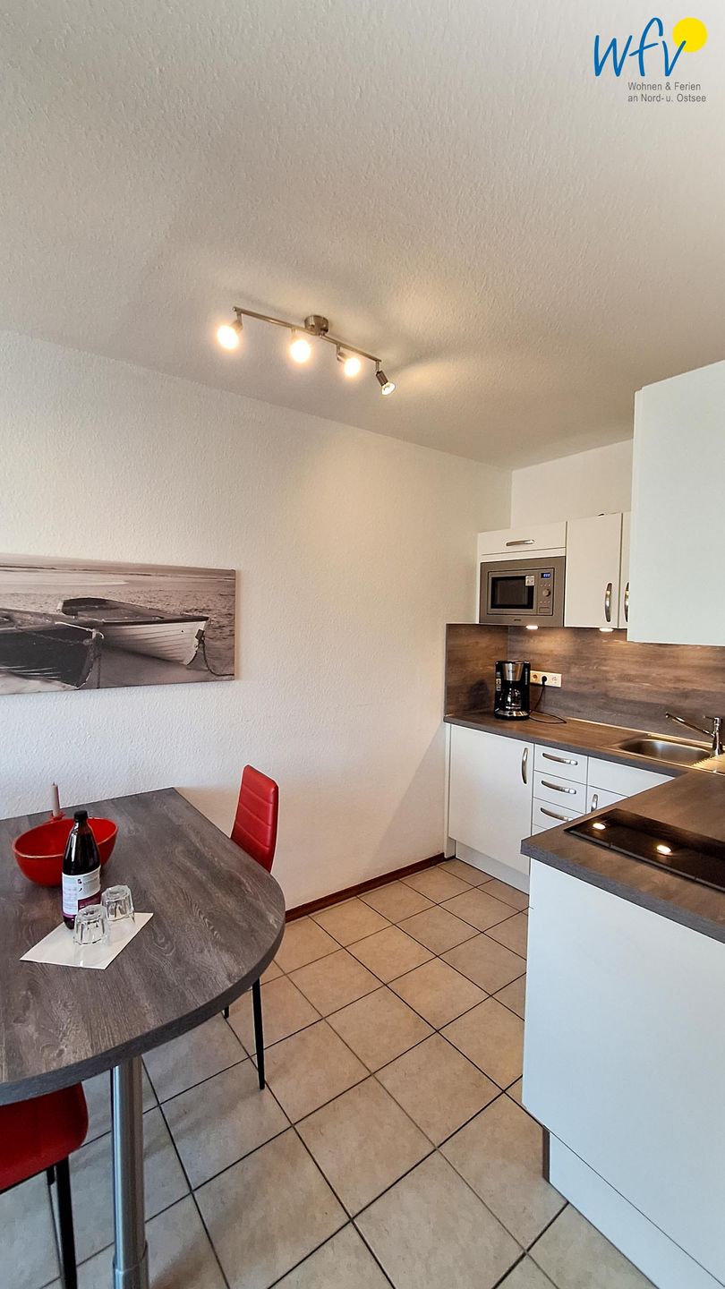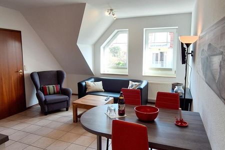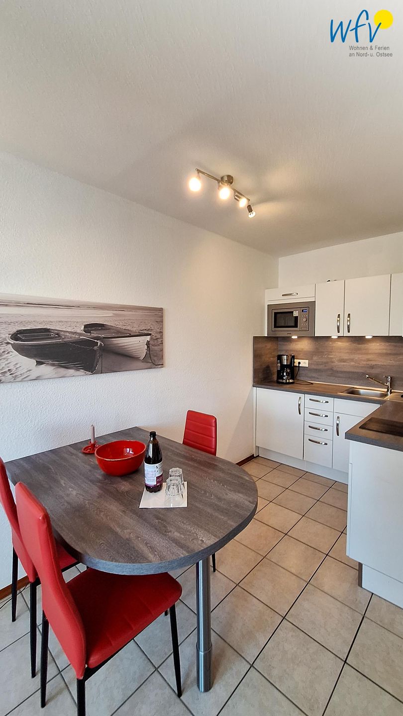 Nach dem Badetag oder der Fahrradtour lädt der Wohnraum mit Sofa, Sessel und TV zu gemütlichen Stunden ein - perfekt, um entspannt den Urlaubstag ausklingen zu lassen. Zum Surfen vom Smartphone empfangen Sie freies WLAN. Ein Esstisch bietet Platz zum Klönen, für das Urlaubsfrühstück oder das gemeinsame Abendessen.