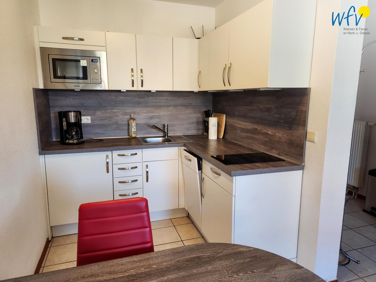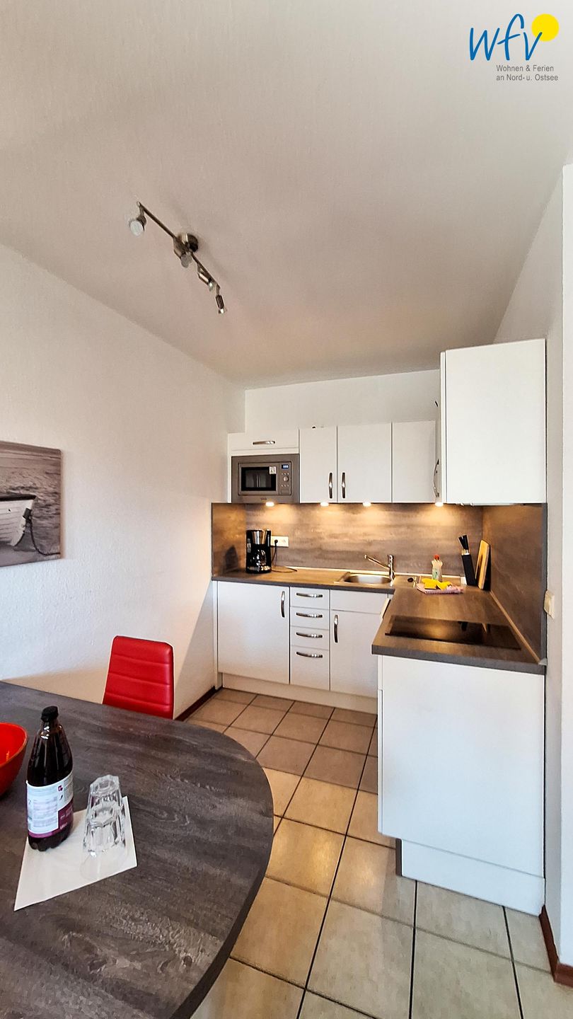 In der modernen offenen Küche lassen sich schnell und einfach Snacks für den Ausflug oder leckere Gerichte zubereiten. Ausgestattet ist sie u.a. mit einem 2-Platten-Ceranherd, Mikrowelle und Spülmaschine sowie diversen Kleingeräten.
