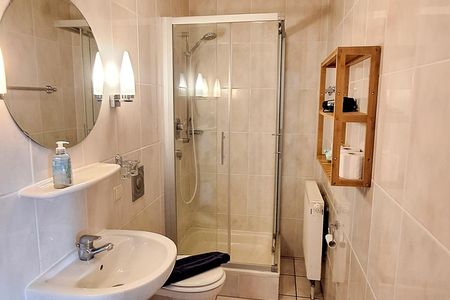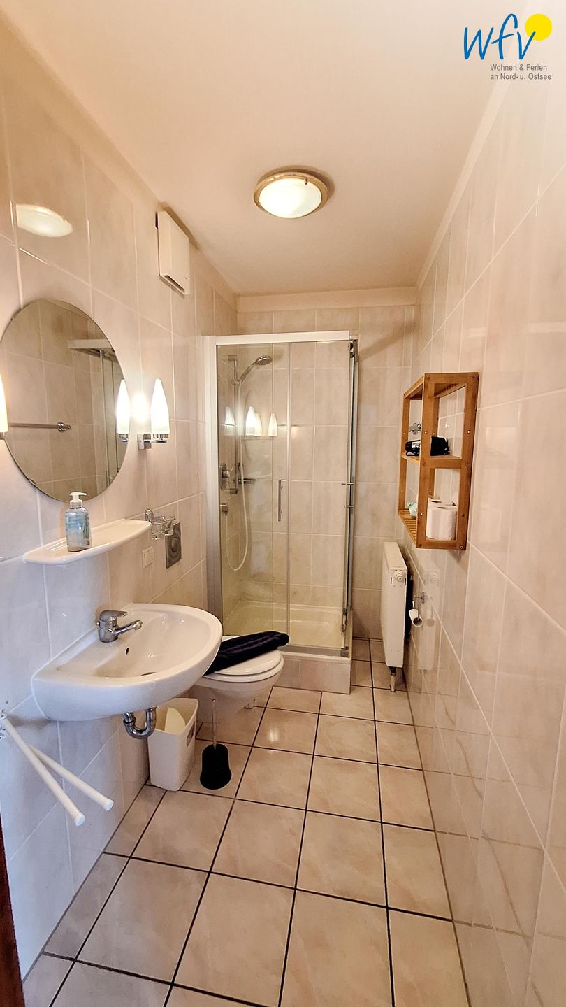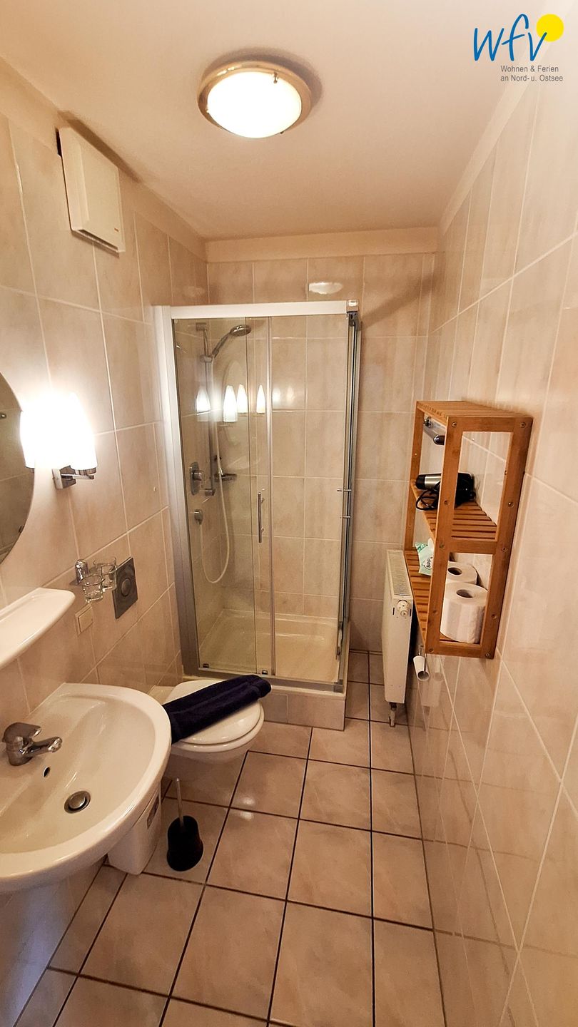 Das moderne Badezimmer mit Dusche, WC, Waschbecken mit Spiegel und Föhn ergänzt den Wohnkomfort.