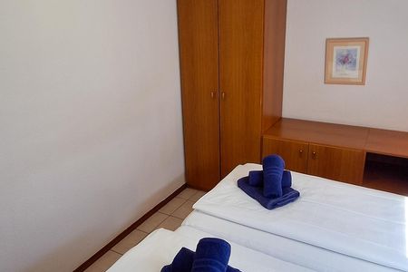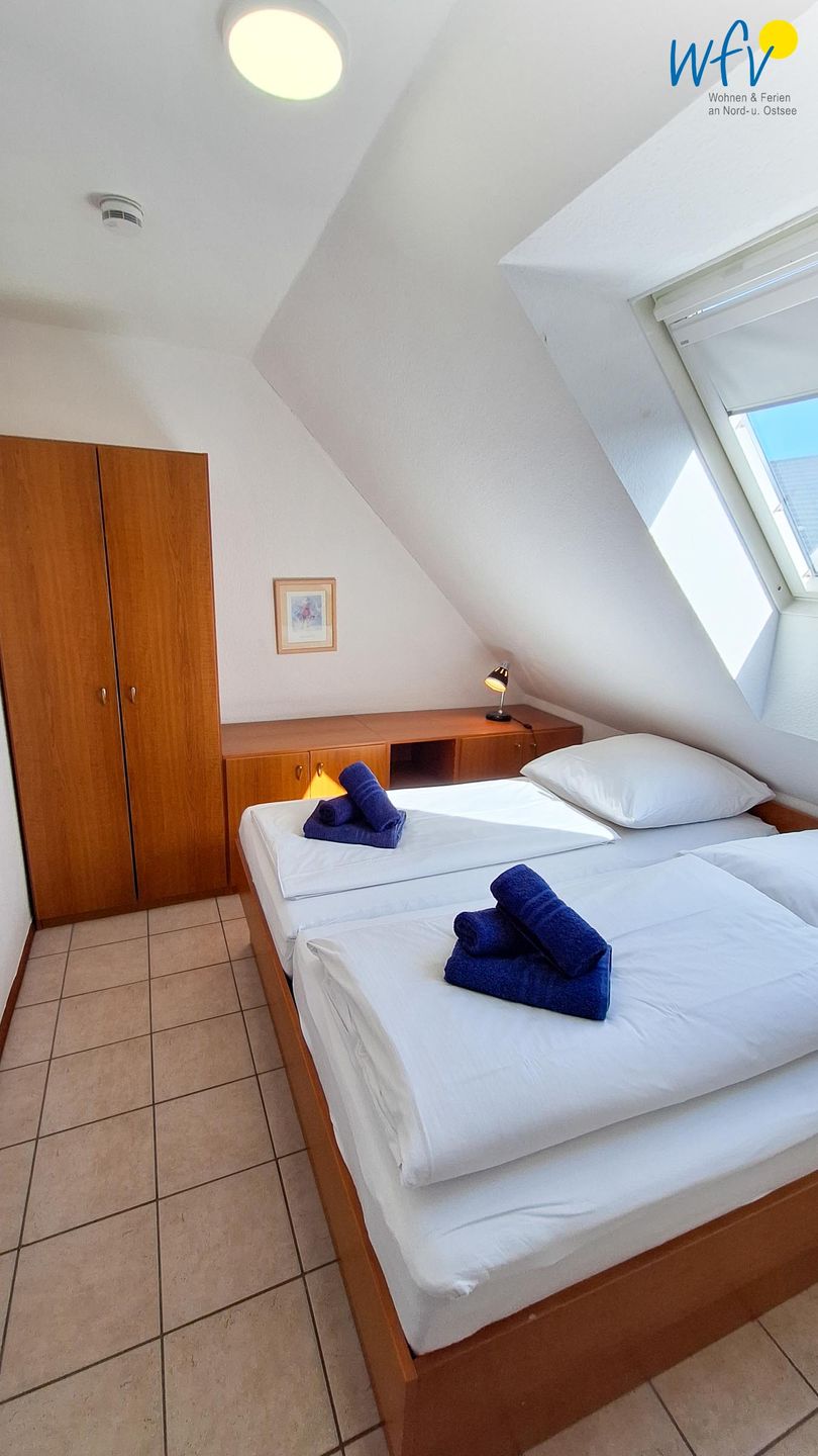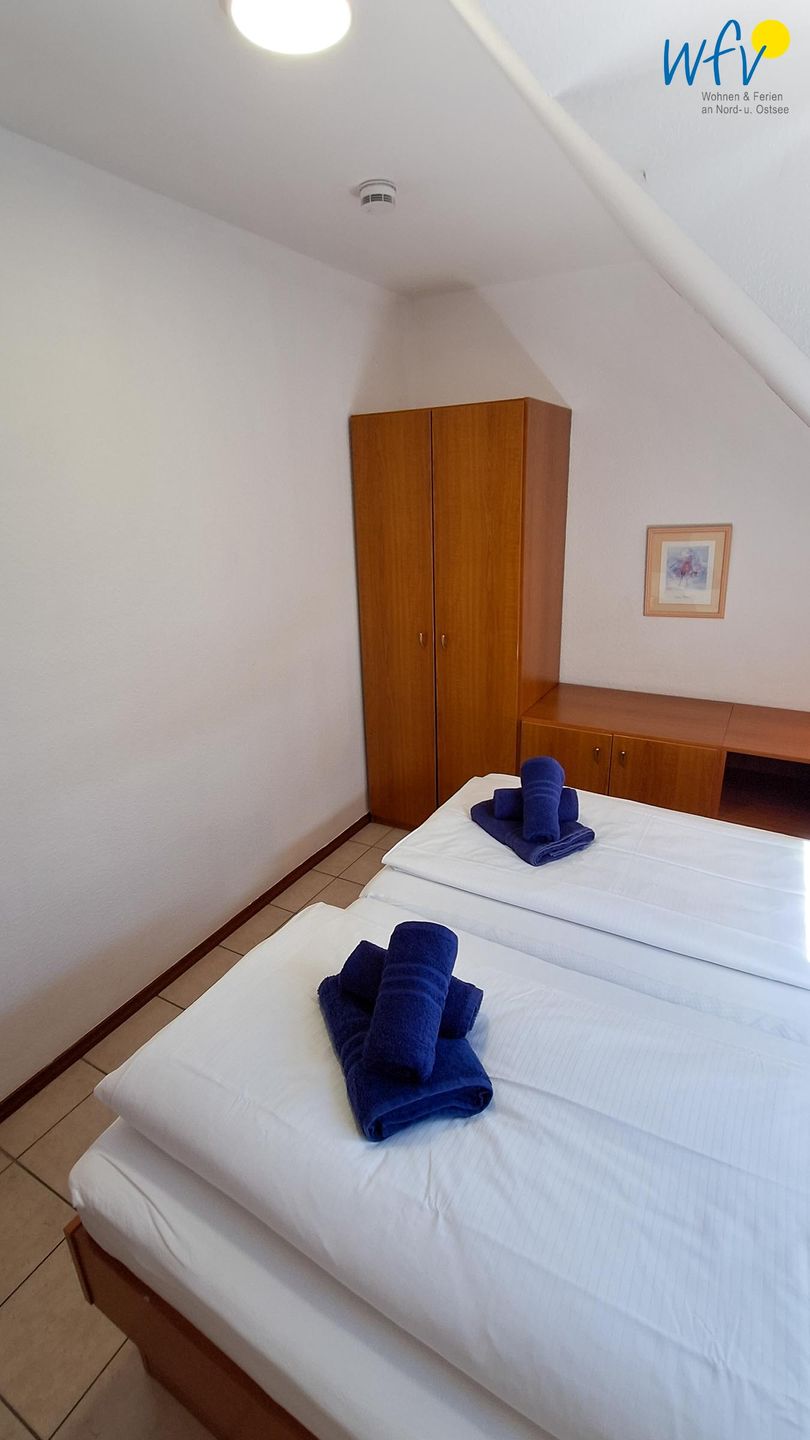 Das separate Schlafzimmer ist mit einem Doppelbett (2 x 90 x 200 cm) und einem Kleiderschrank eingerichtet. Eine Garderobe im Flur ermöglicht eine weitere Ablage von Kleidung und Schuhen.
