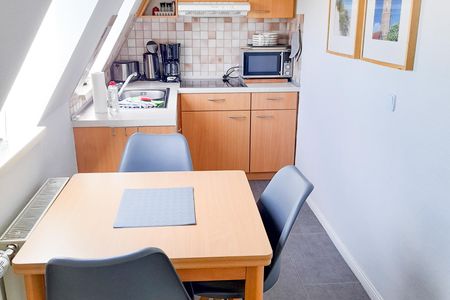 Starten Sie Ihren Urlaubstag mit einem gemütlichen Morgenkaffee am hellen Essplatz. Aus beiden Küchenfenster sehen Sie bereits die Nordsee (im Stehen) - im Herbst sehr intensiv, im Sommer weit weg, aber ebenfalls sehr malerisch, wenn die Wellen Schaumkronen bilden. Das Ferienfrühstück lässt sich bequem in der gut ausgestatteten Kochnische mit Kaffeemaschine, Wasserkocher, Eierkocher und Toaster zubereiten. Für Ausflugs-Snacks oder leckere Mahlzeiten stehen Ihnen ein Herd und eine Mikrowelle zur Verfügung.