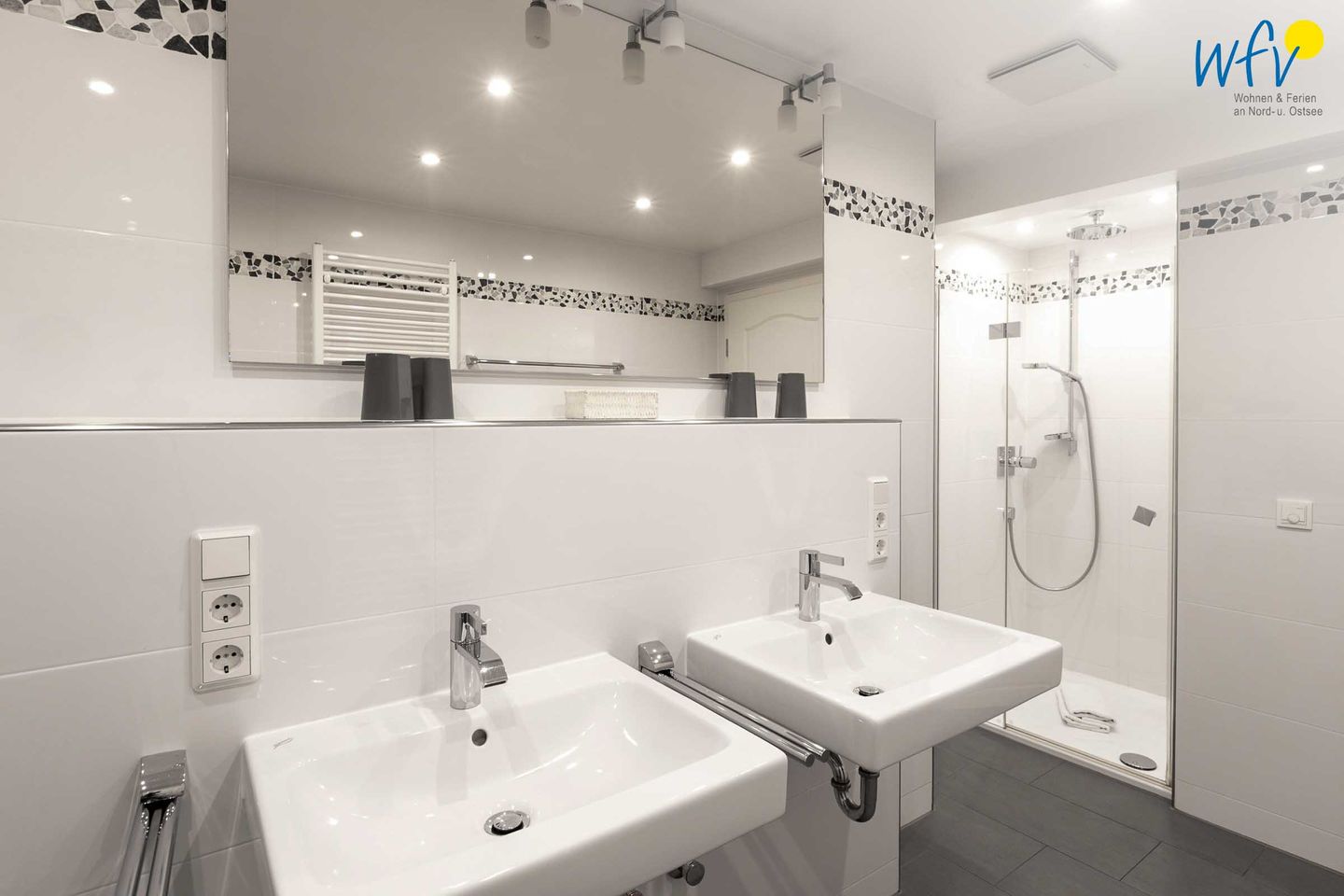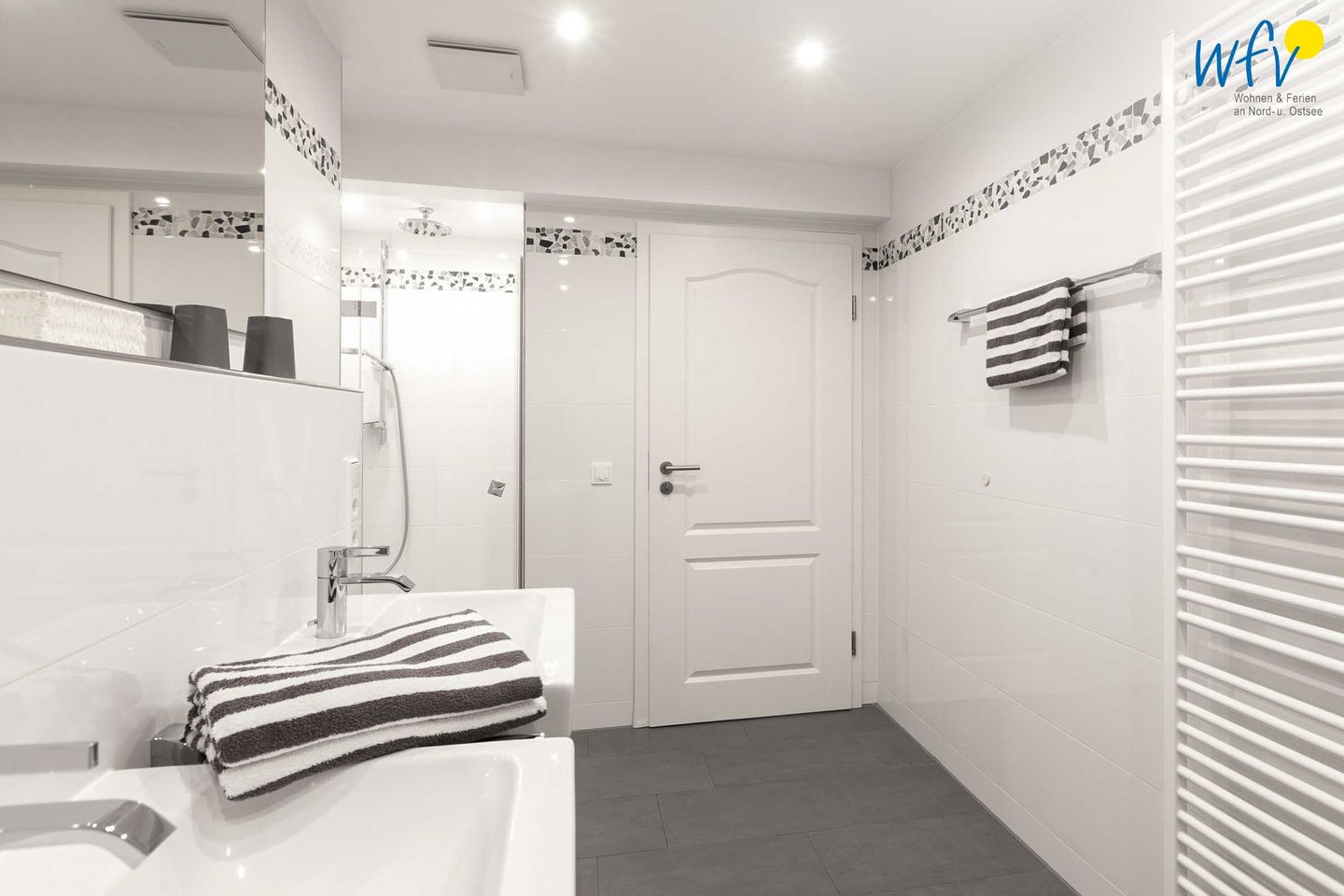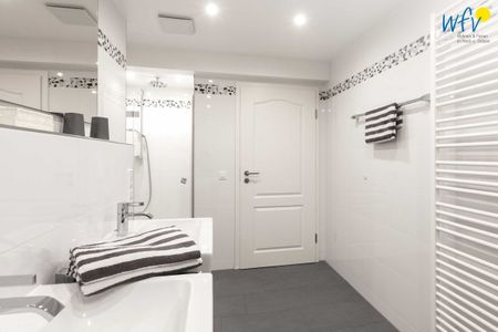 Weiterer Wohnkomfort erwartet Sie im eleganten Badezimmer, das u.a. mit einer bodengleichen Dusche, Handtuchheizung und doppeltem Waschtisch ausgestattet ist.