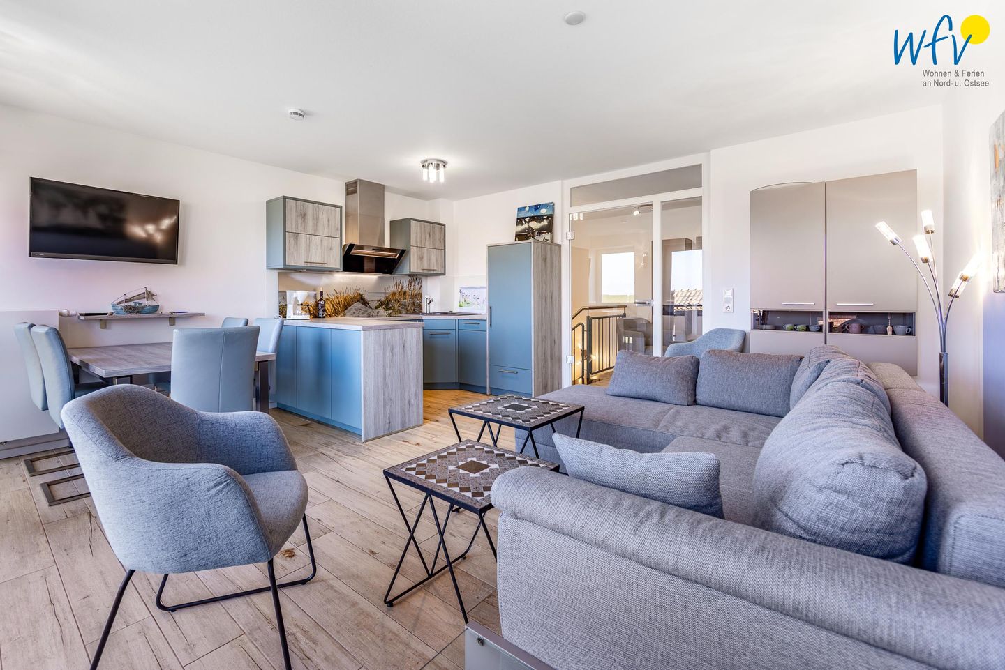 Wunderbar relaxen können Sie vor allem im großzügigen Wohnraum der Juister Ferienwohnung, der u.a. mit einer gemütlichen Couchecke mit Flachbildfernseher und HiFi-Anlage ausgestattet ist.