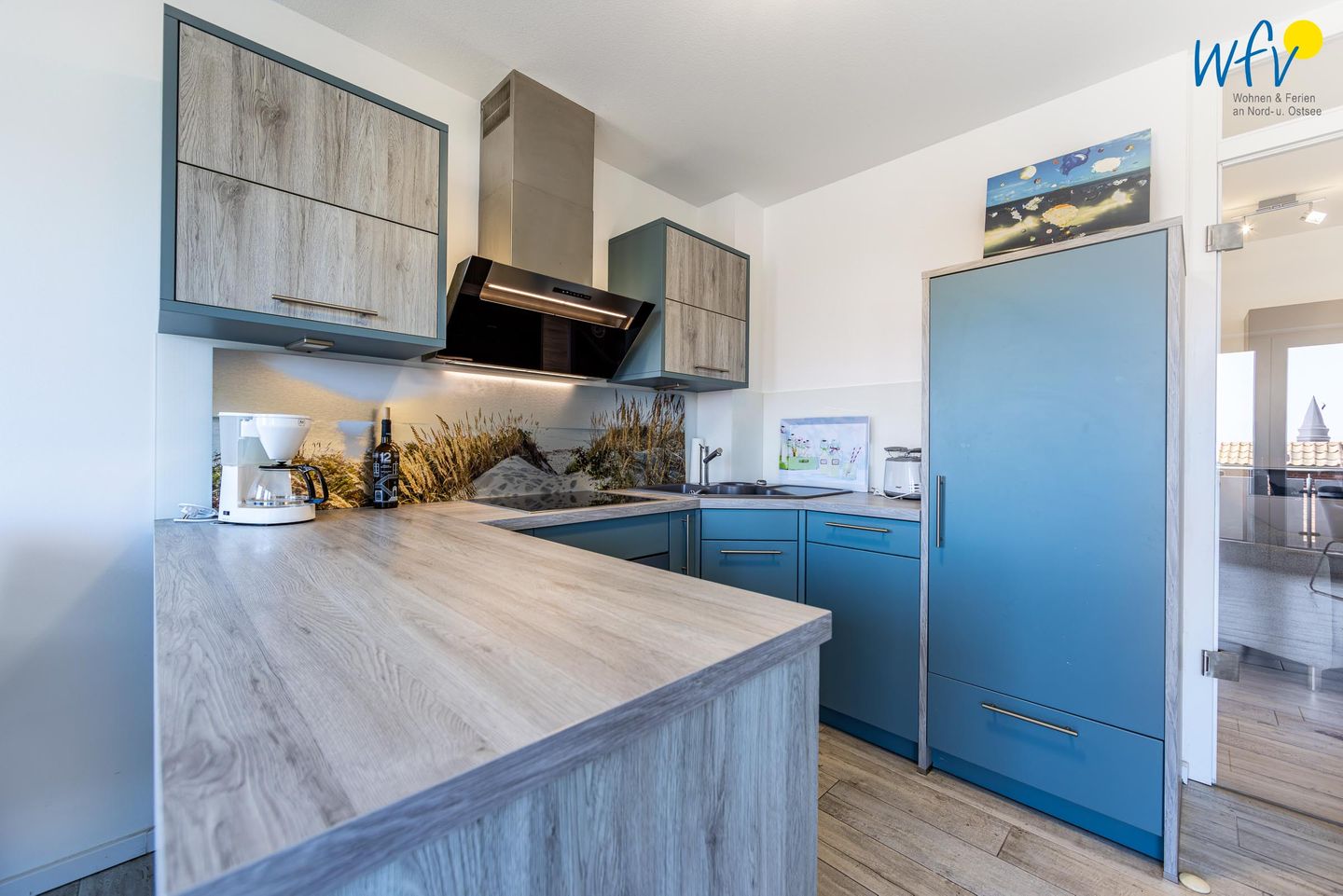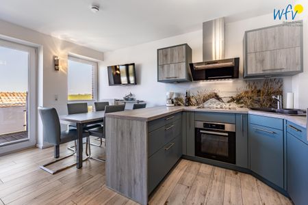 Damit Sie sich in Ihrem Juist-Urlaub bequem selbstverpflegen können, verfügt die Ferienwohnung auf Juist über eine moderne Einbauküche - u.a. mit Ceranherd, Backofen, Kühlschrank mit Gefrierfach, Mikrowelle und Geschirrspüler sowie Kaffeemaschine und Toaster.