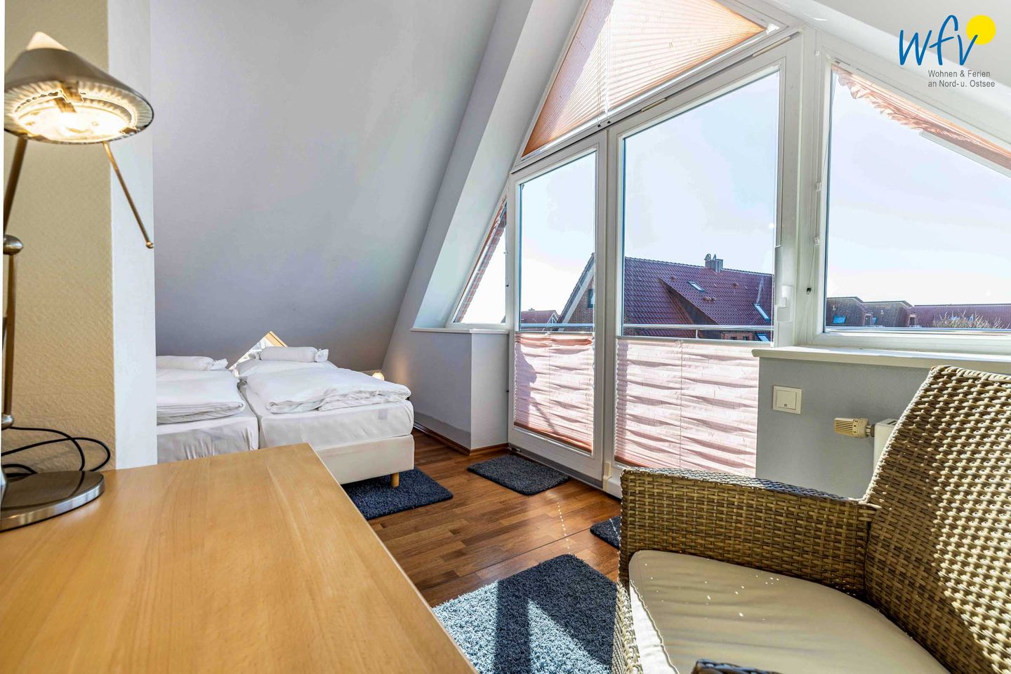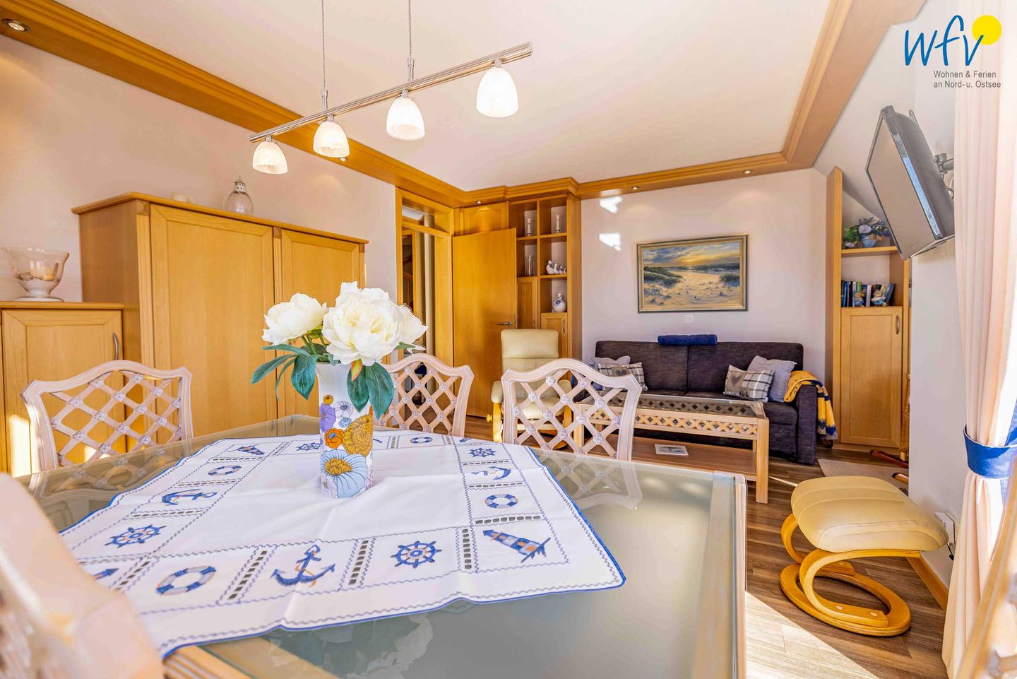 Die komfortable Ferienwohnung befindet sich im Obergeschoss des Hauses, helle Räume mit großen Fenstern vermitteln direkt ein freundliches Wohngefühl. Die liebevolle und gemütliche Einrichtung lädt zum Wohlfühlen ein; maritime Accessoires sorgen für das entsprechende Nordseeflair. Vom Balkon aus haben Sie einen wunderschönen Blick auf das Wattenmeer.