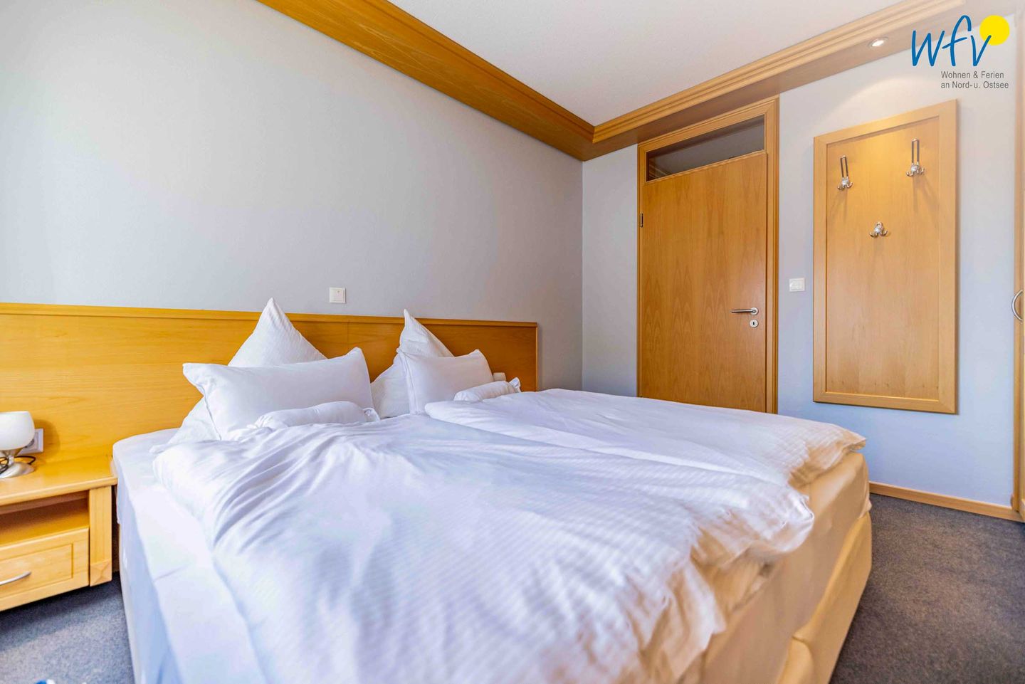 Das separate Schlafzimmer ist mit einem komfortablen Doppelbett ausgestattet. Eine geräumige Schrankwand bietet Platz für Ihre Urlaubsgarderobe. Für zwei weitere Personen kann die Couch im Wohnzimmer zu einem Doppelbett umfunktioniert werden.