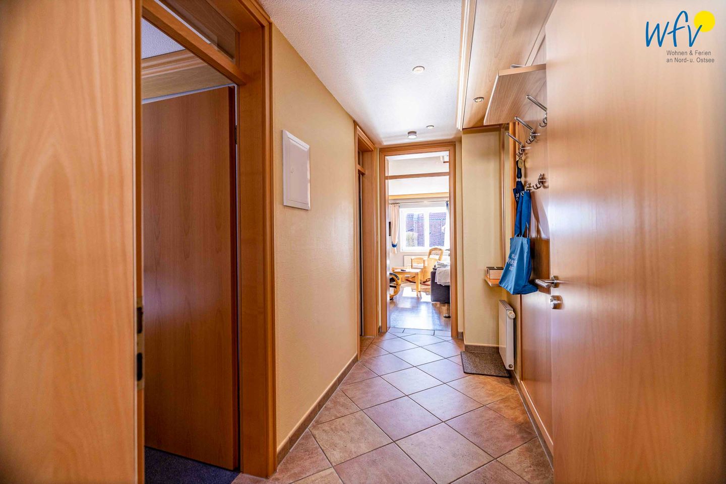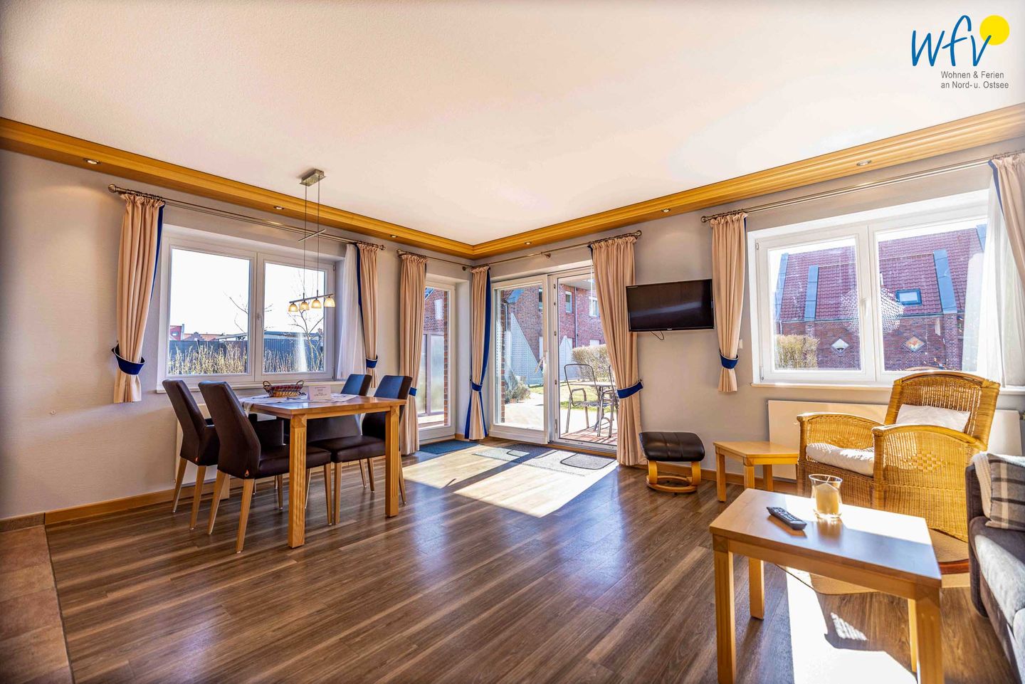 Die komfortable Ferienwohnung befindet sich im Erdgeschoss des Hauses, helle Räume mit großen Fenstern vermitteln direkt ein freundliches Wohngefühl. Die liebevolle und gemütliche Einrichtung lädt zum Wohlfühlen ein; maritime Accessoires sorgen für das entsprechende Nordseeflair. Von der Terrasse aus haben Sie einen wunderschönen Blick auf die umliegenden Weiden und den Deich.