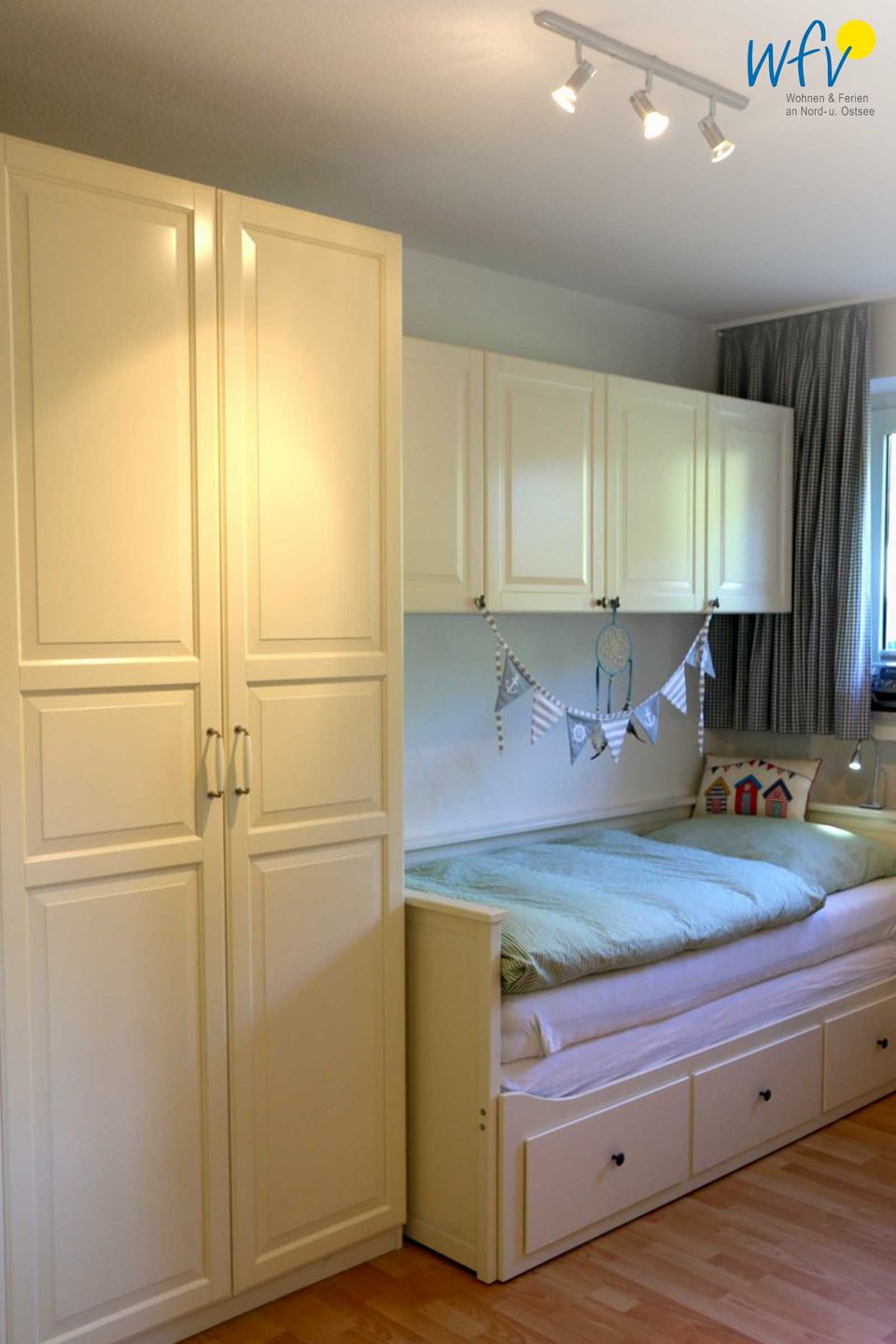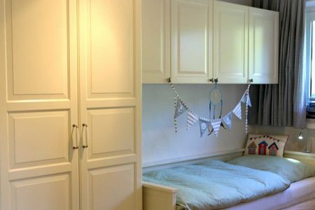 Zwei separate Schlafzimmer bieten Ihnen angenehme Rückzugsmöglichkeiten. Während das Elternschlafzimmer mit einem Doppelbett eingerichtet ist (180 x 200 cm), befindet sich im Kinderzimmer ein Einzelbett (90 x 200 cm; ausziehbar für eine zweite Person). Für Ihre Urlaubsgarderobe sind jeweils Kleiderschränke vorhanden. Zwei weitere Personen können auf der Schlafcouch im Wohnraum übernachten.