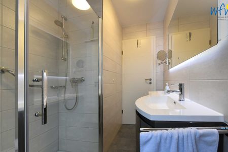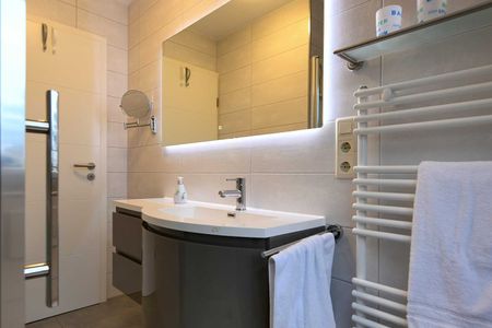 Weiterer Wohnkomfort erwartet Sie in dem eleganten Tageslichtbad mit ebenerdiger Dusche, breitem Waschtisch, Spiegel und Kosmetikspiegel sowie Handtuchheizung und Föhn.