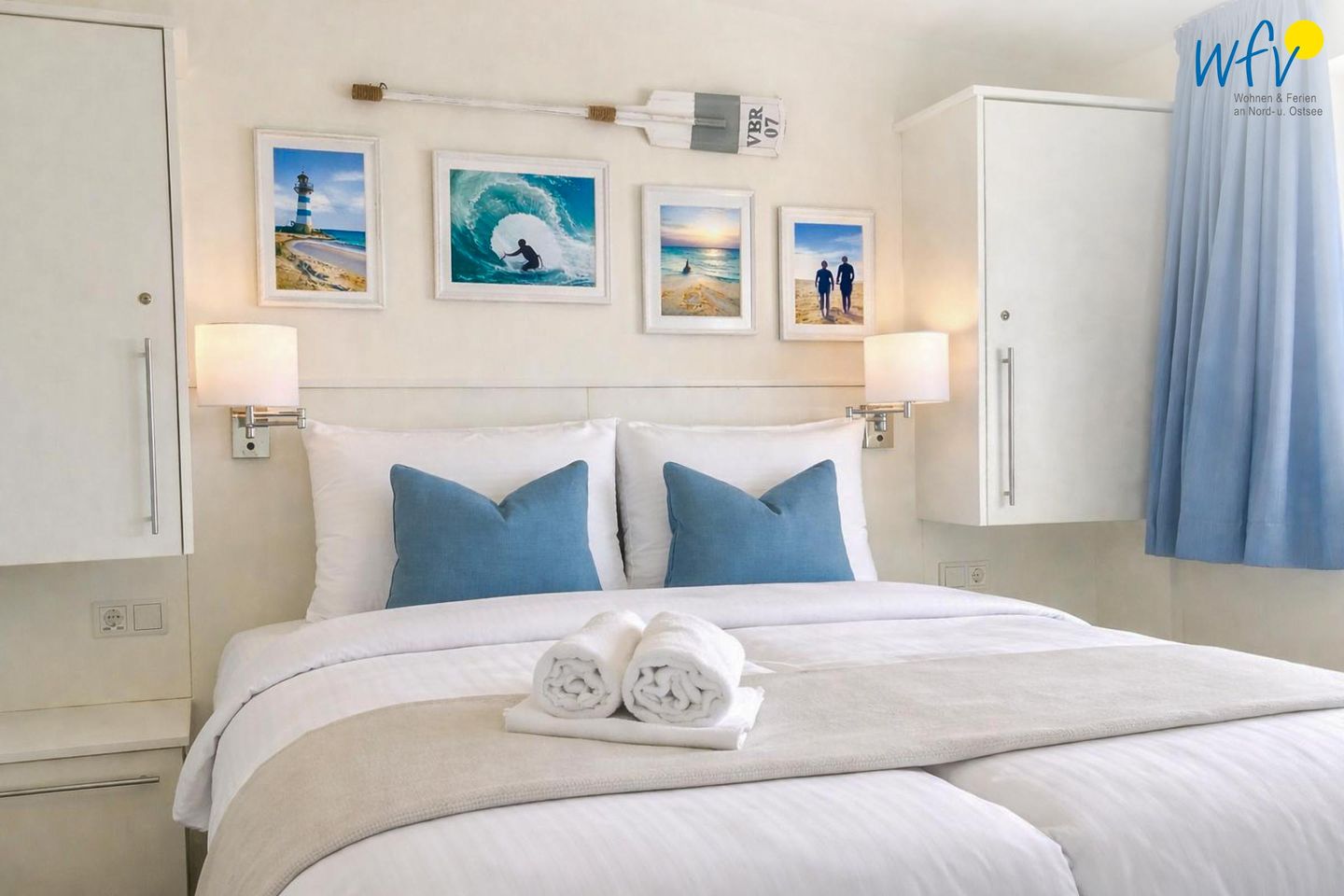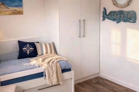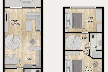 Eine Wendeltreppe führt zu den zwei separaten Schlafzimmern im Obergeschoss. Beide Zimmer sind mit einem komfortablen Doppelbett ausgestattet (180 x 200 cm) und Kleiderschränken für die Urlaubsgarderobe. Von einem Raum aus haben Sie einen traumhaften Blick in die Langeooger Dünenwelt, ebenso von dem angrenzenden möblierten Ost-Balkon - sogar das Meer hören Sie hier rauschen! Das andere Schlafzimmer liegt zur Gartenseite hin und verspricht ebenfalls eine angenehme Nachtruhe. Hier befindet sich neben dem Doppelbett ein eingebautes Kinderbett (160 x 80 cm) und ein kleiner Schreibtisch. Die Couch im Wohnzimmer kann zu einem komfortablen kleinen Doppelbett umfunktioniert werden und bietet eine weitere Schlafmöglichkeit (160 x 200 cm).