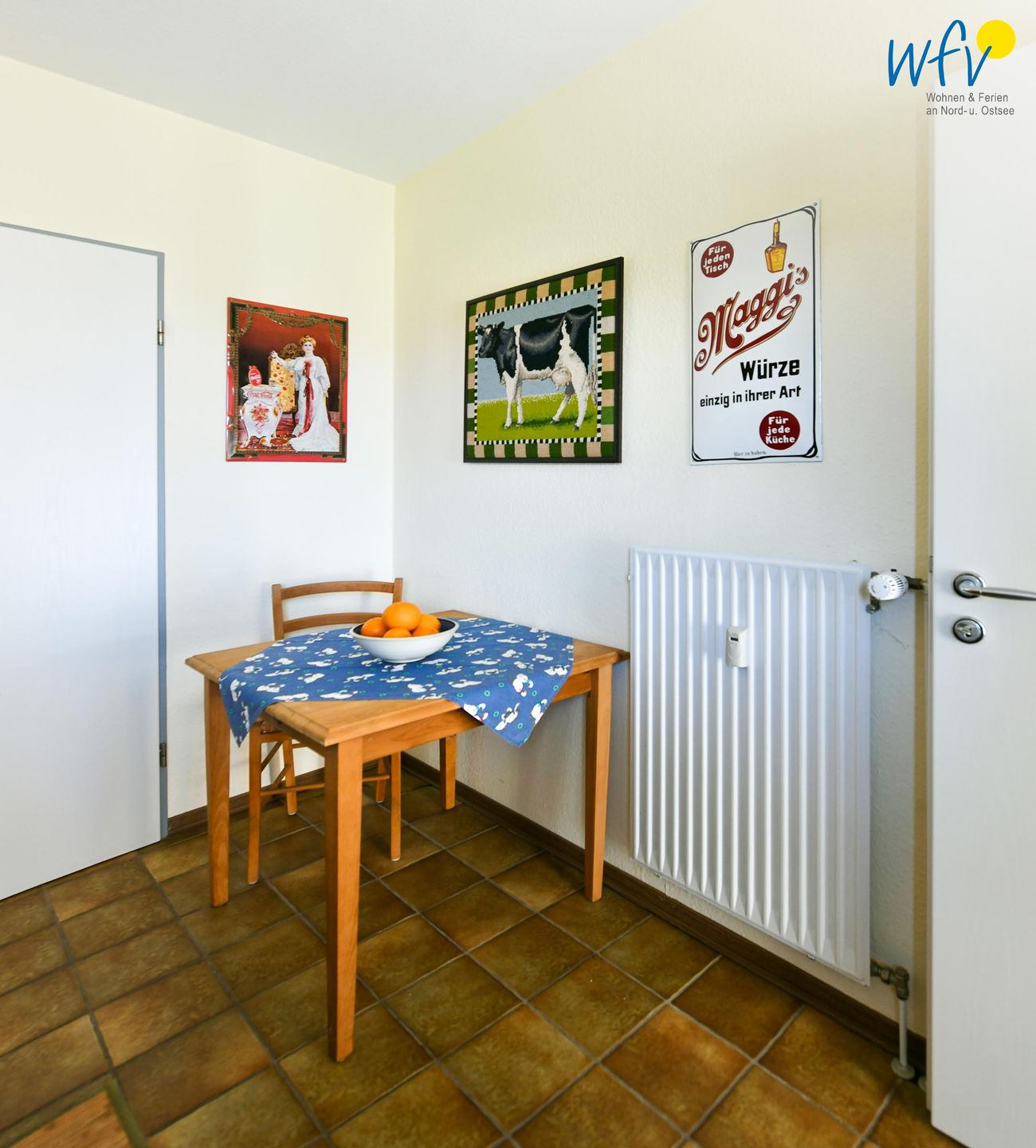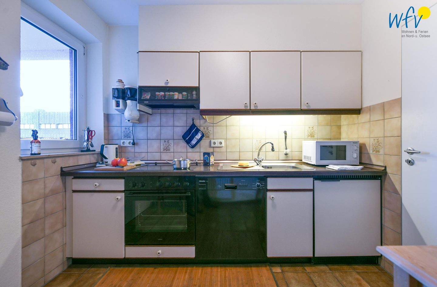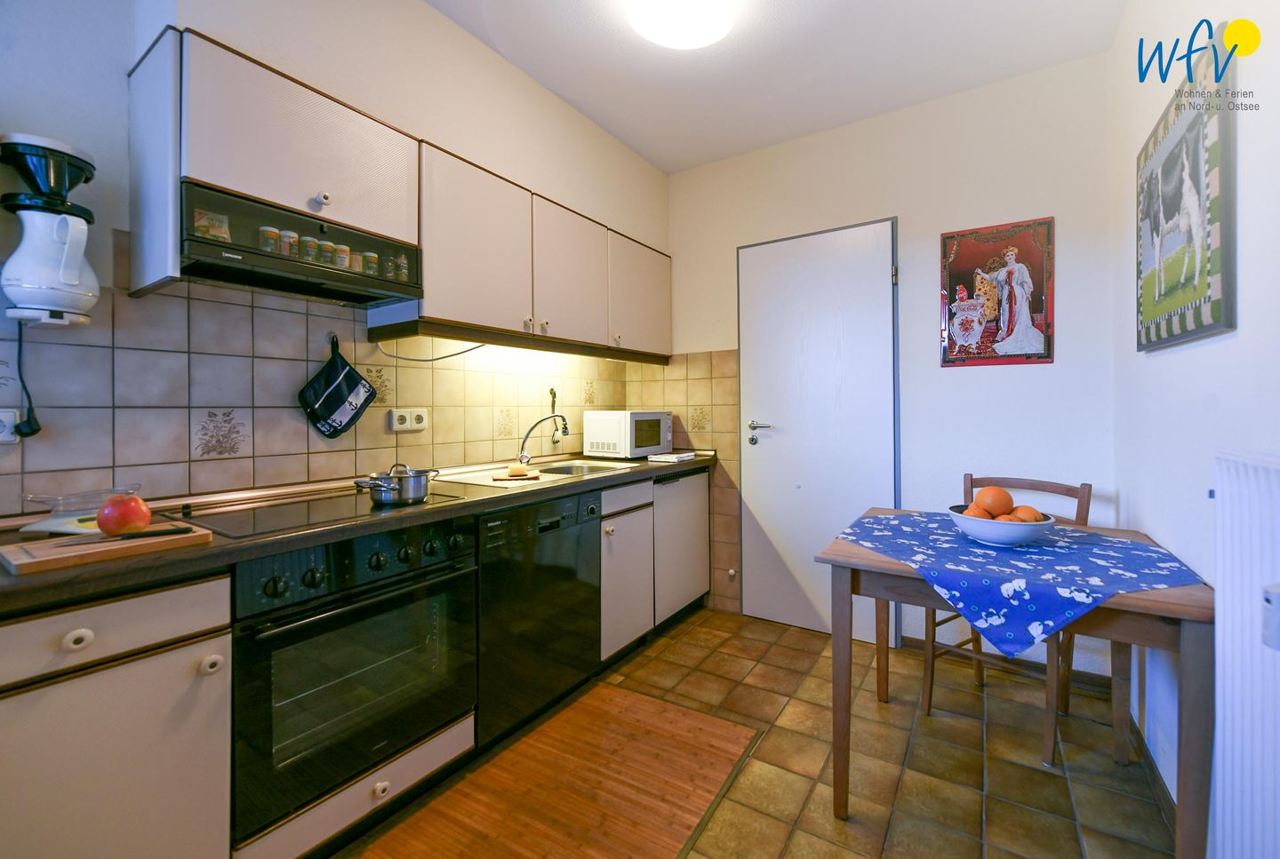 Ihr Ferienfrühstück, Snacks für den Strand oder das Dinner lassen sich bequem in der separaten Küche zubereiten. Sie verfügt u.a. über einen 4-Platten-Ceranherd, einen Backofen, eine Mikrowelle und eine Spülmaschine sowie über eine Kaffeemaschine, einen Toaster und einen Wasserkocher. Ihren ersten Morgenkaffee können Sie an dem kleinen Esstisch genießen.