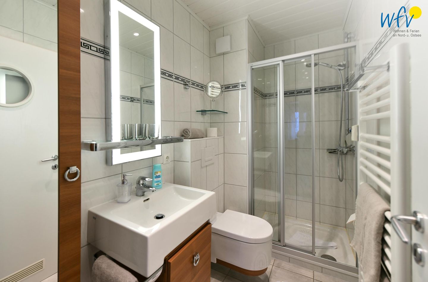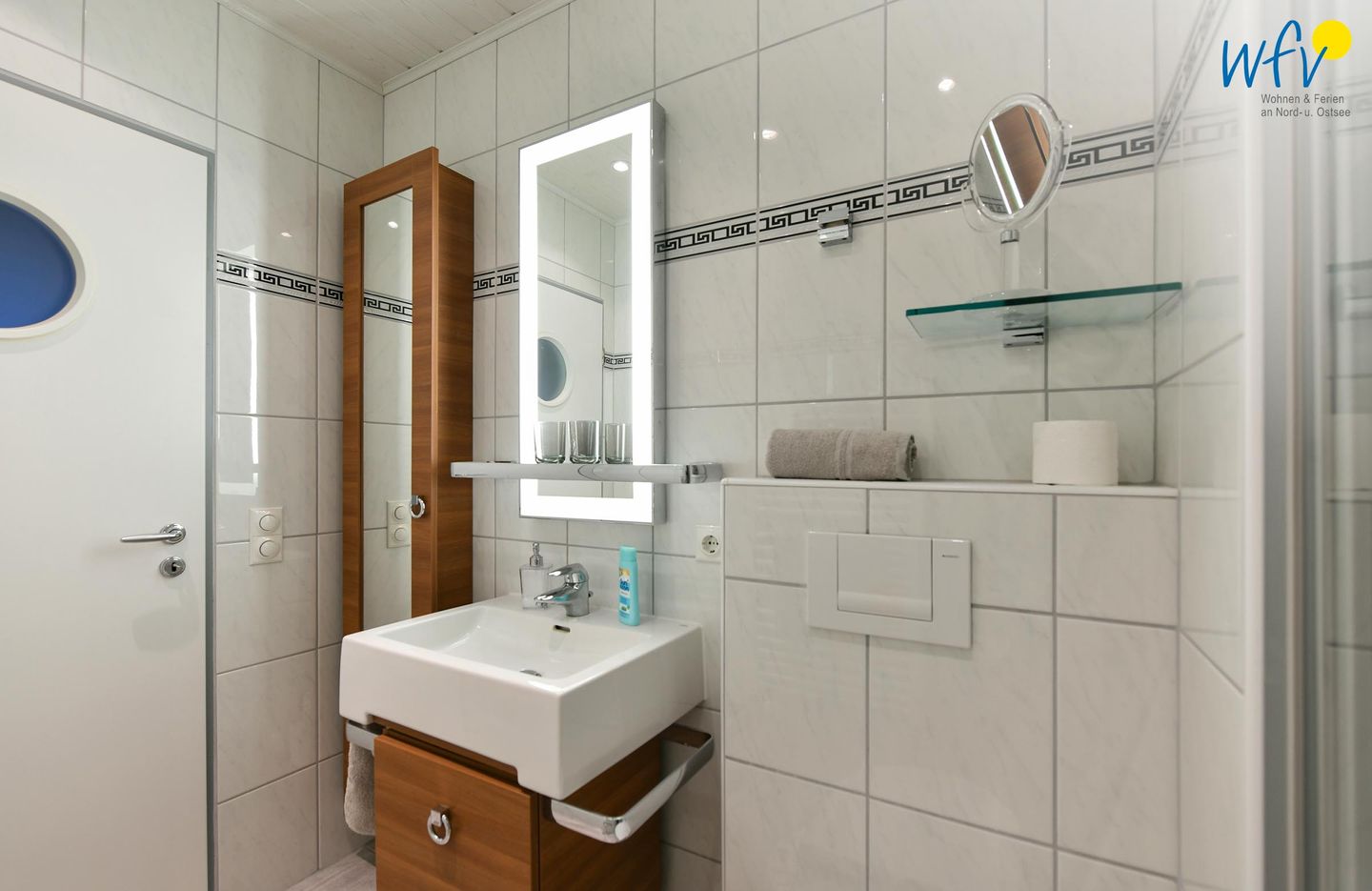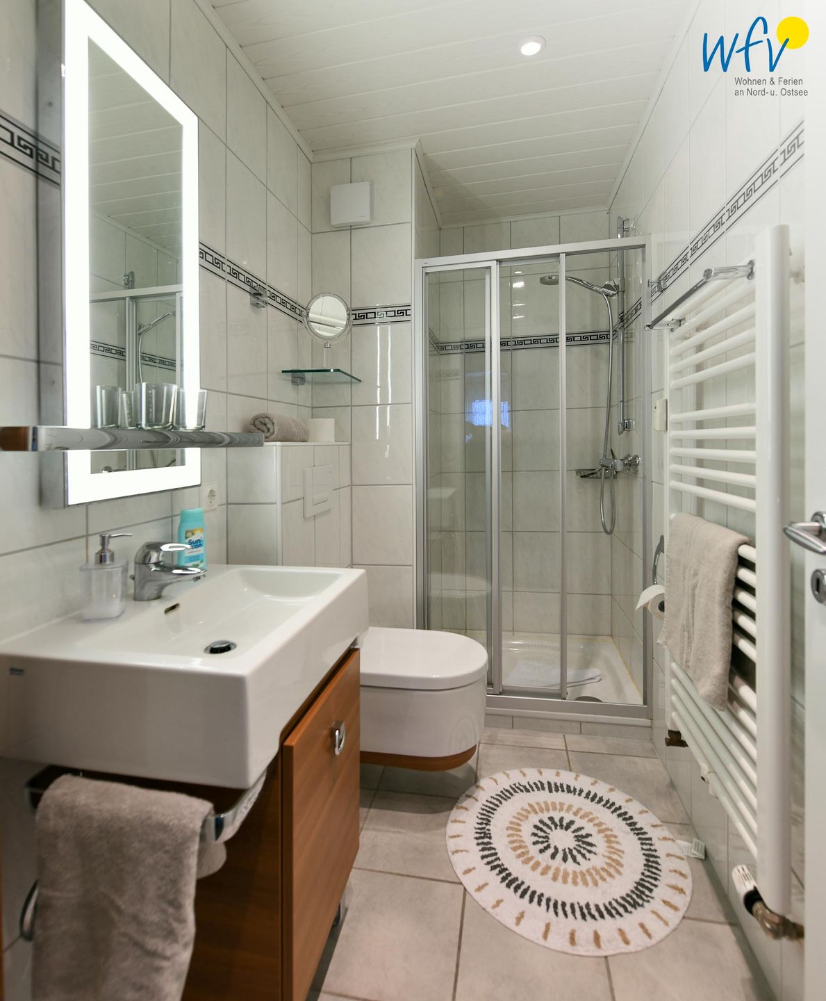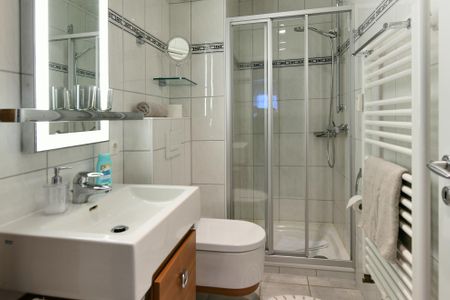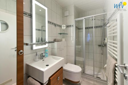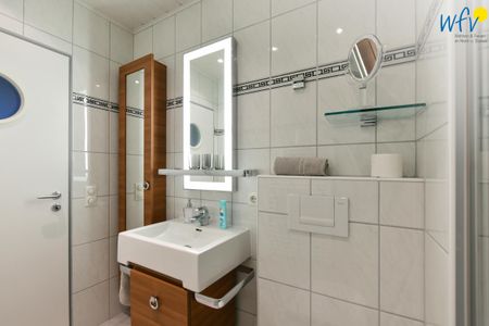 Weiterer Wohnkomfort erwartet Sie in dem modernen Badezimmer, das über eine bodengleiche Dusche, einen großen beleuchteten Spiegel und einen Handtuchheizkörper sowie über einen Kosmetikspiegel und einen Föhn verfügt.