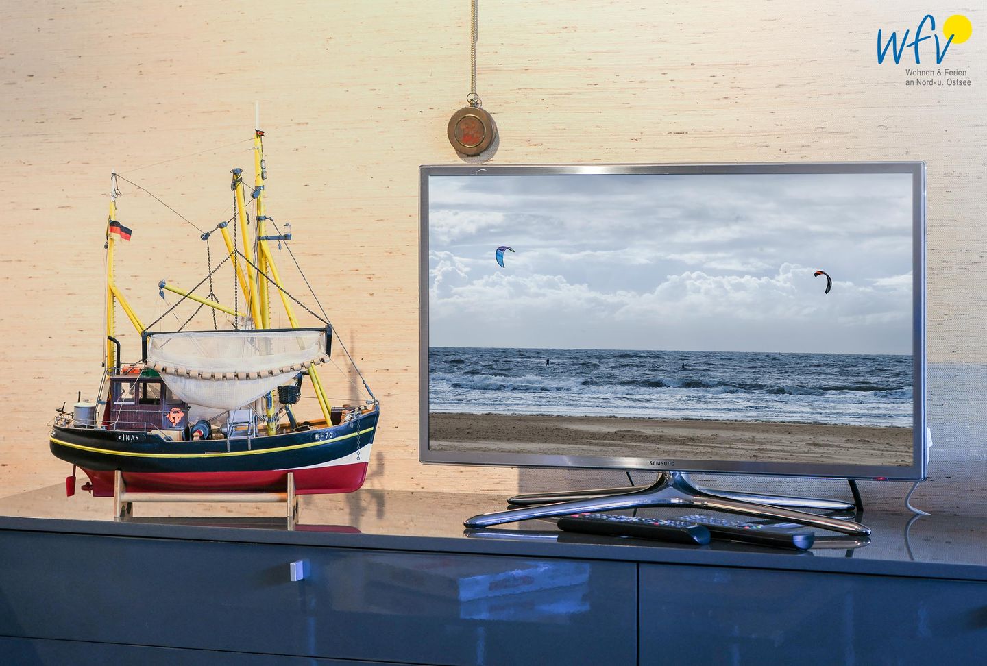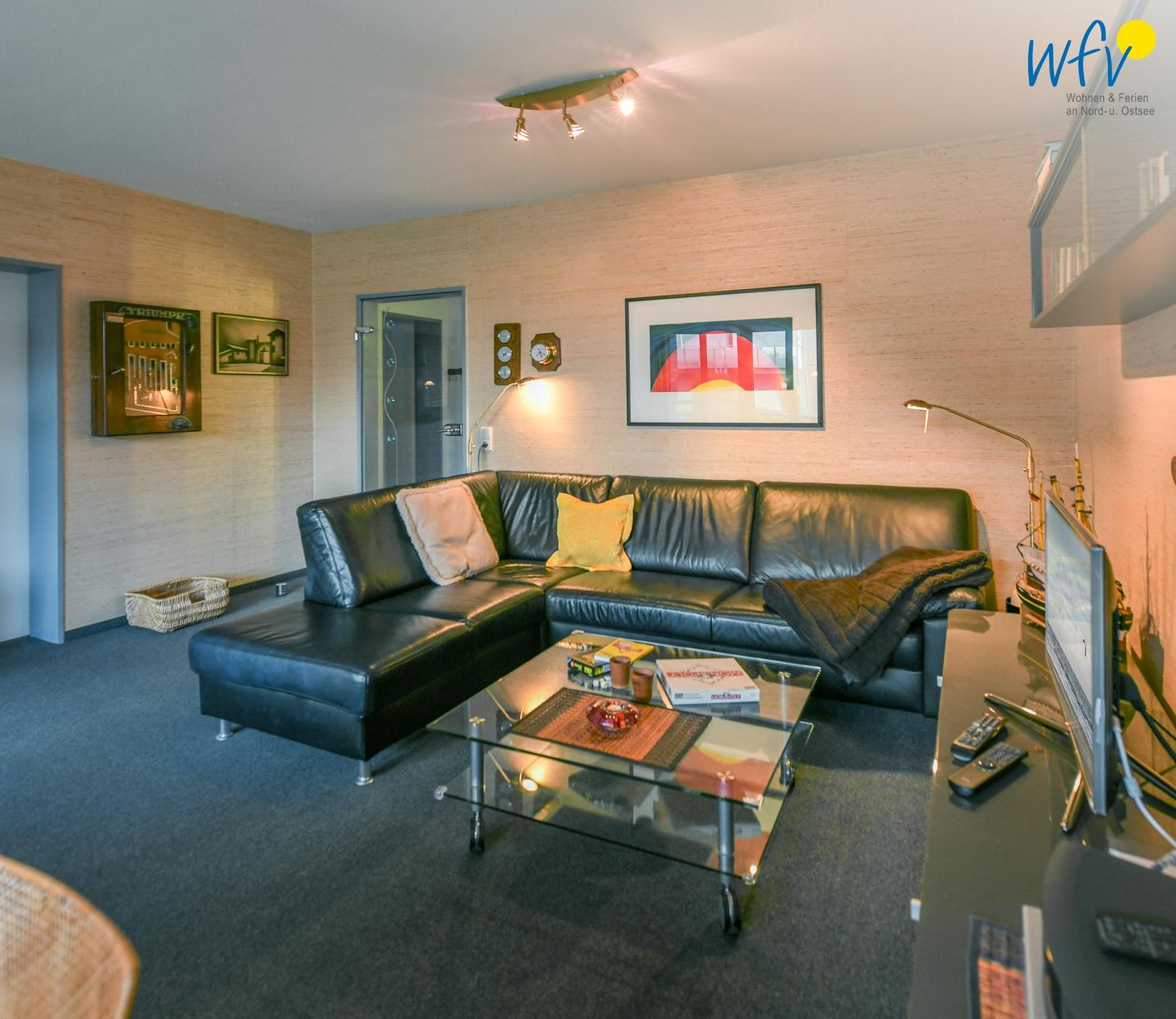 Für entspannte Stunden nach der Fahrradtour oder dem Strandtag ist der Wohnraum mit einer großen Ledercouch sowie mit TV, DVD-Player und CD-Player eingerichtet. Gemeinsame Mahlzeiten oder Spieleabende können Sie am Esstisch verbringen. Es sind sowohl einige Bücher und CDs vorhanden, als auch Spiele für Kinder und Erwachsene.