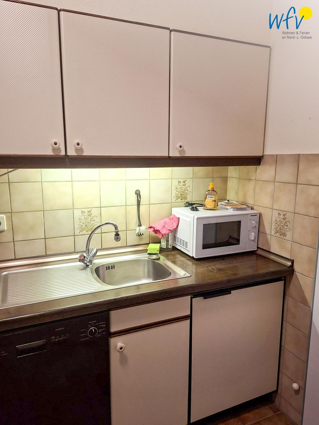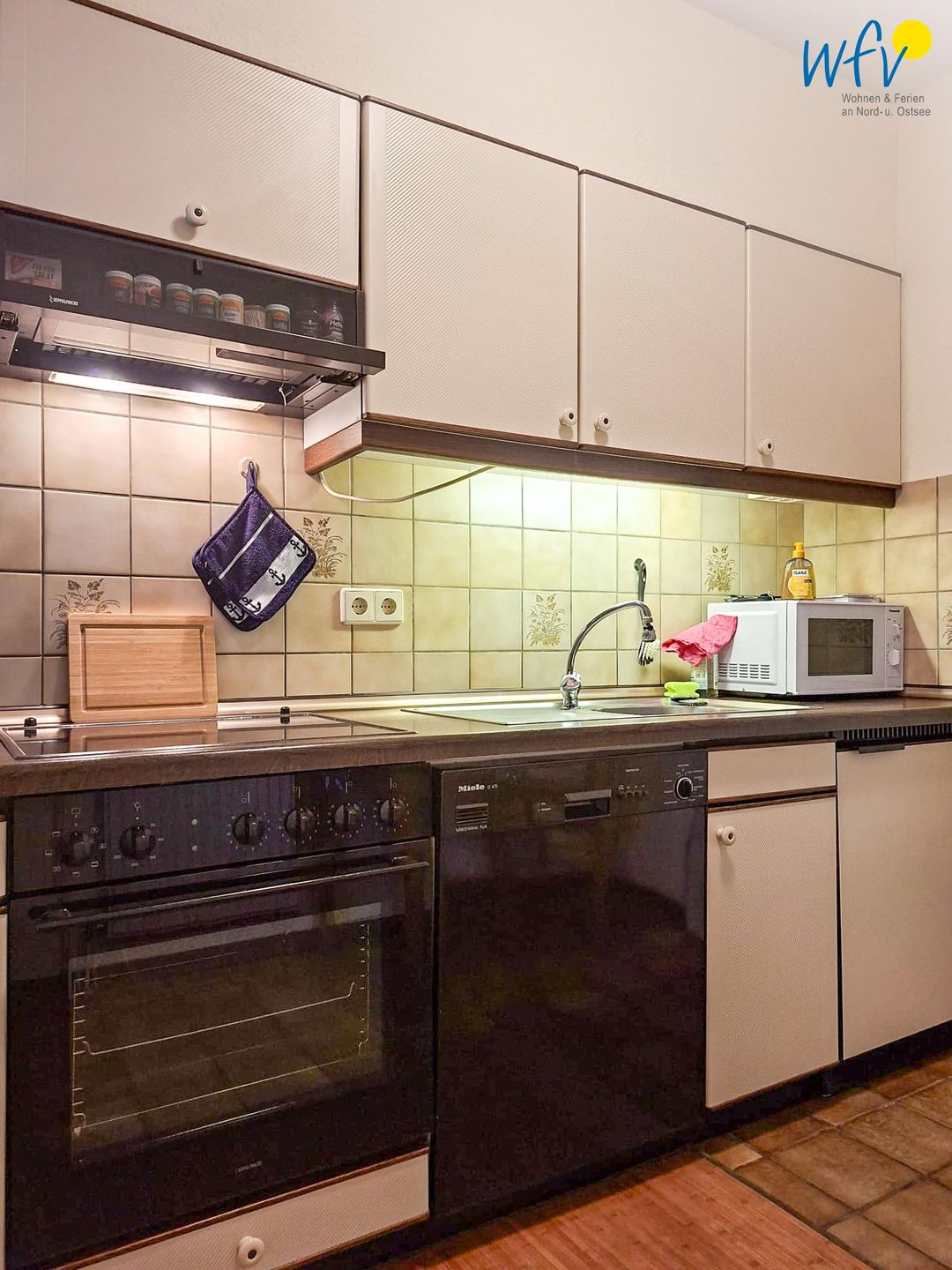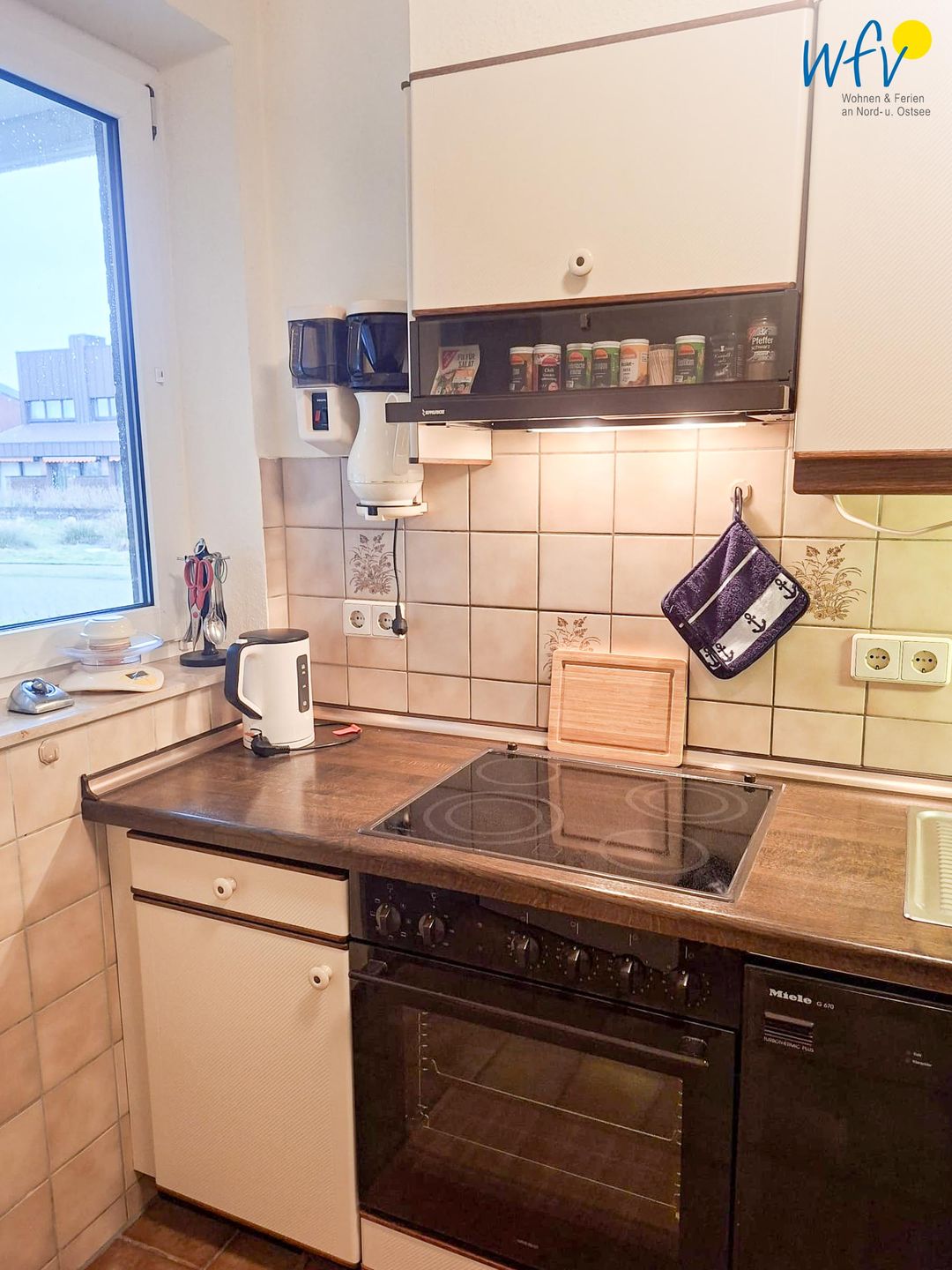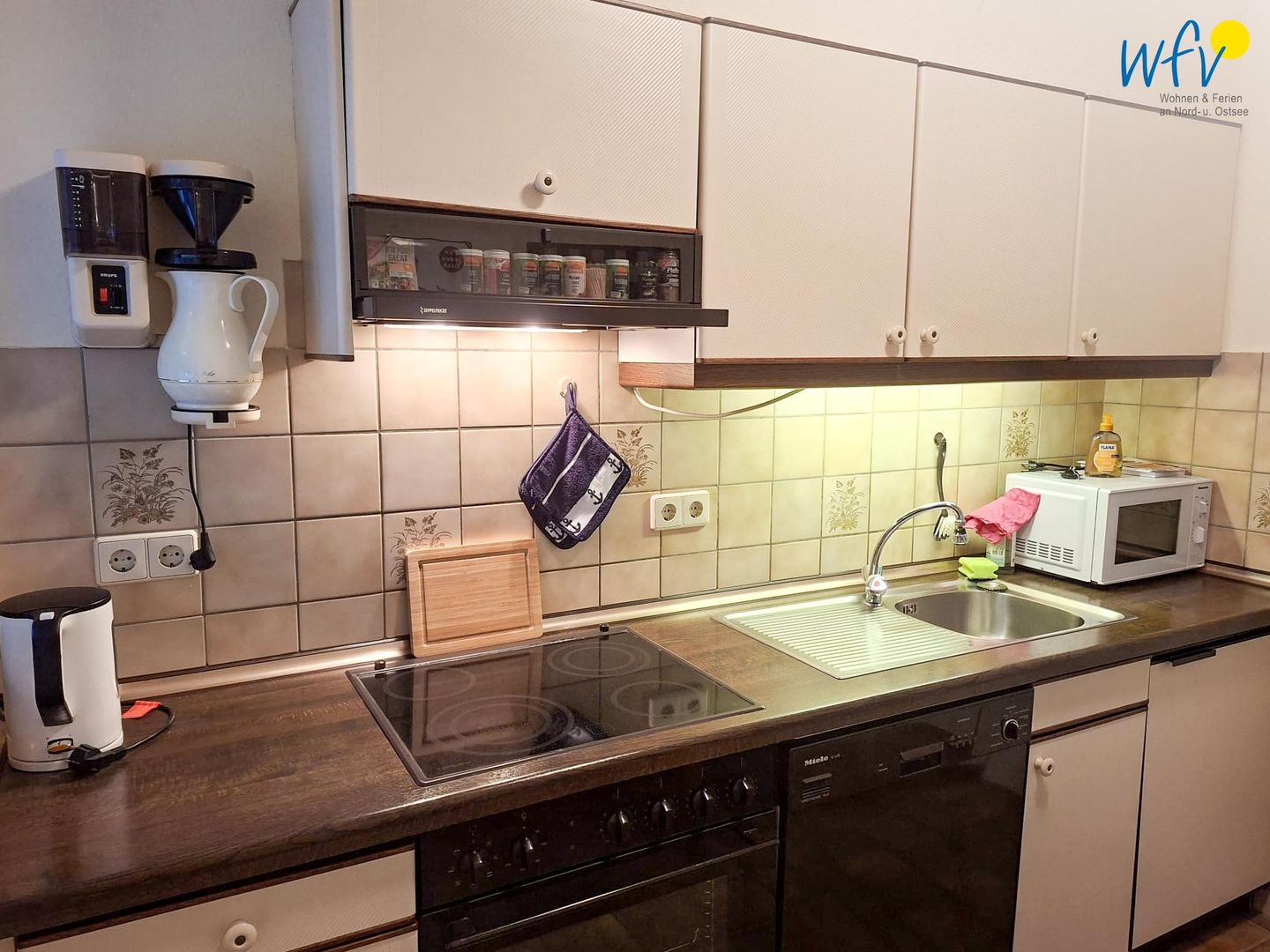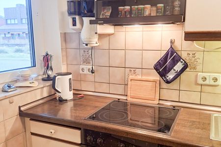 Ihr Ferienfrühstück, Snacks für den Strand oder das Dinner lassen sich bequem in der separaten Küche zubereiten. Sie verfügt u.a. über einen 4-Platten-Ceranherd, einen Backofen, eine Mikrowelle und eine Spülmaschine sowie über eine Kaffeemaschine, einen Toaster und einen Wasserkocher. Ihren ersten Morgenkaffee können Sie an dem kleinen Esstisch genießen.