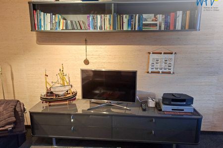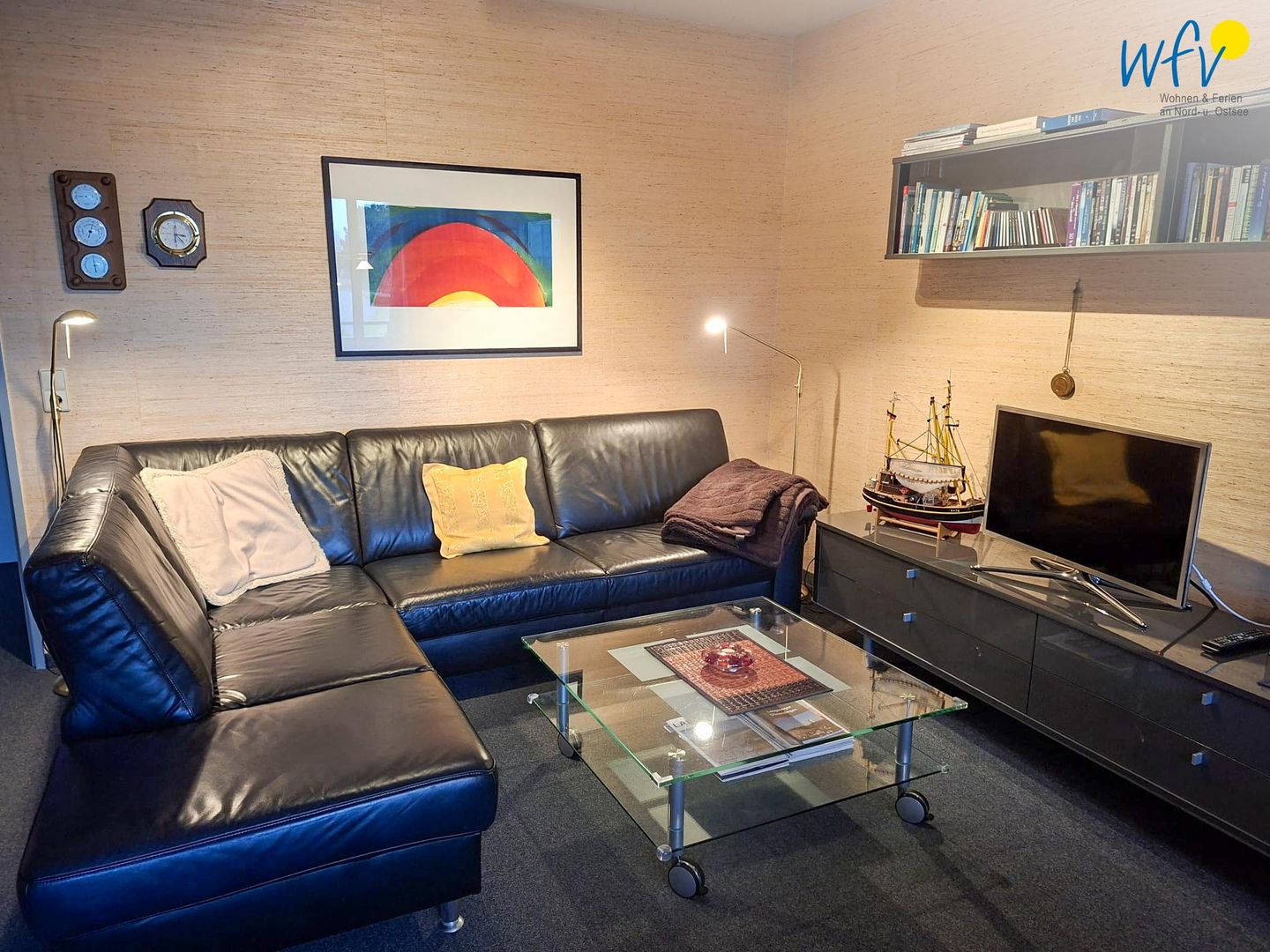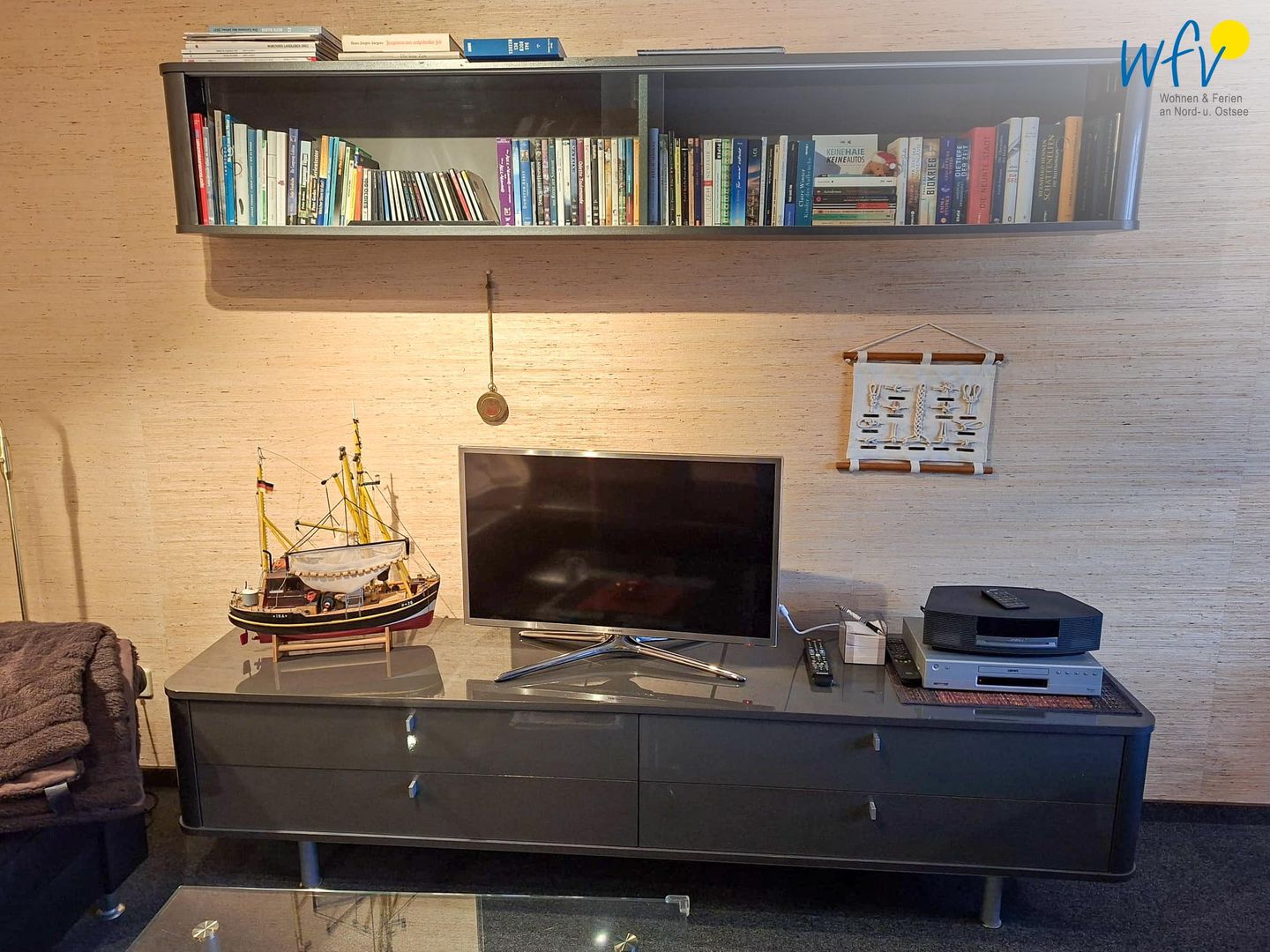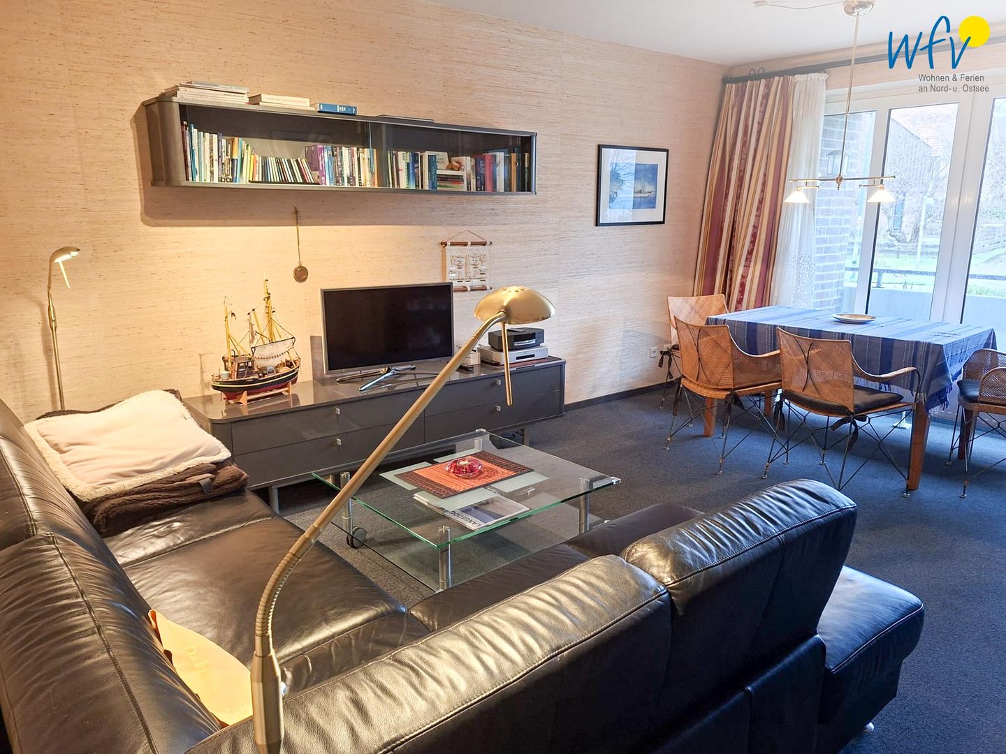 Für entspannte Stunden nach der Fahrradtour oder dem Strandtag ist der Wohnraum mit einer großen Ledercouch sowie mit TV, DVD-Player und CD-Player eingerichtet. Gemeinsame Mahlzeiten oder Spieleabende können Sie am Esstisch verbringen. Es sind sowohl einige Bücher und CDs vorhanden, als auch Spiele für Kinder und Erwachsene.