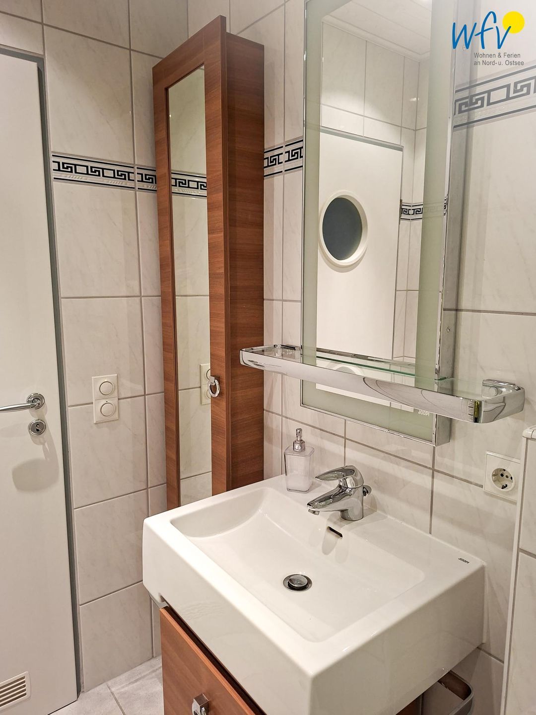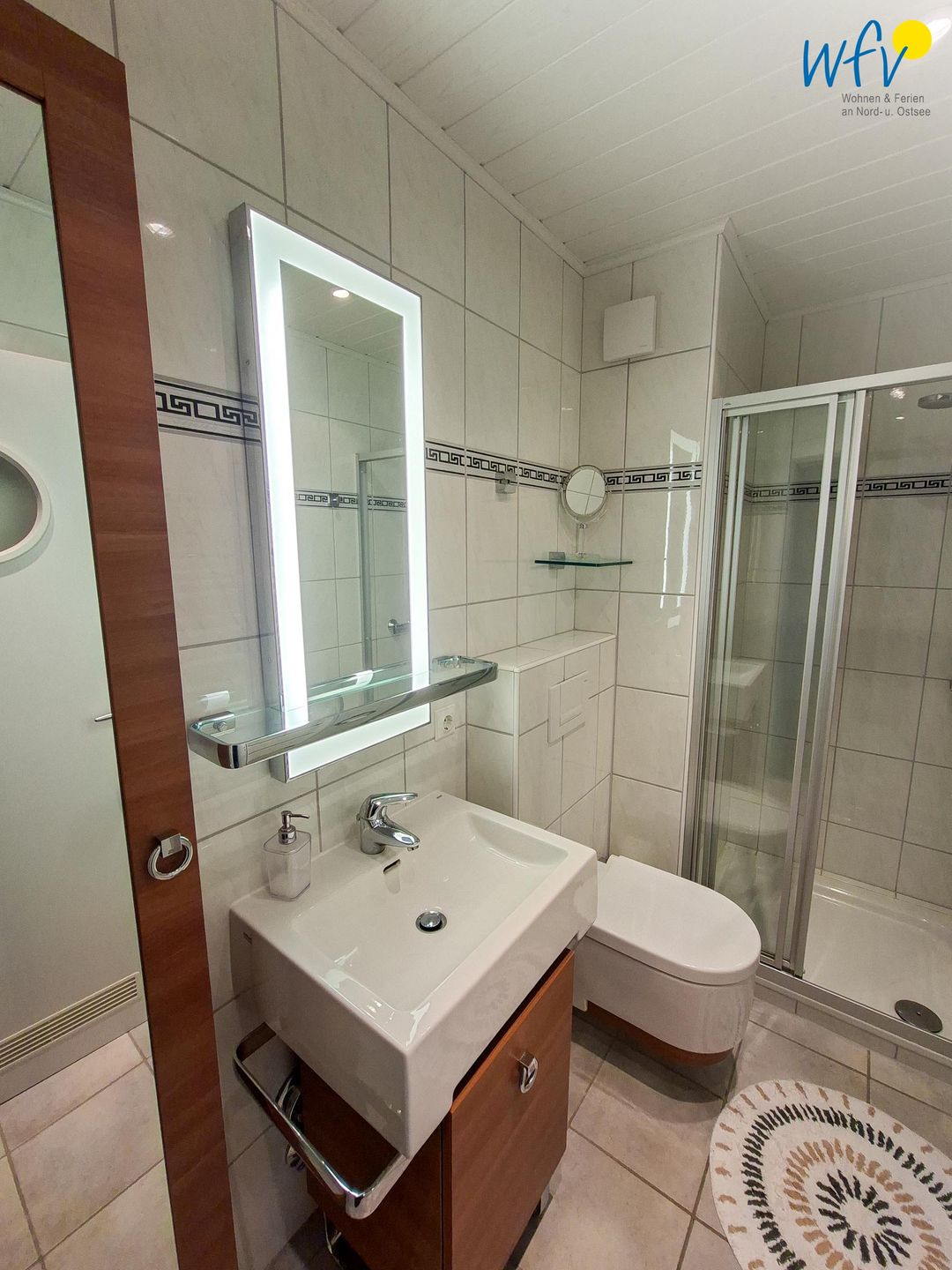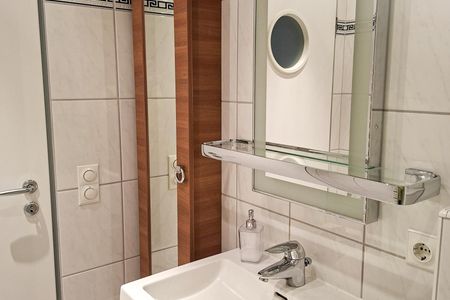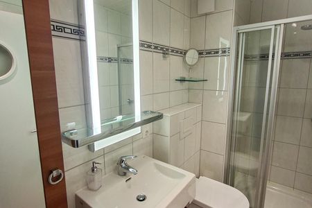 Weiterer Wohnkomfort erwartet Sie in dem modernen Badezimmer, das über eine bodengleiche Dusche, einen großen beleuchteten Spiegel und einen Handtuchheizkörper sowie über einen Kosmetikspiegel und einen Föhn verfügt.