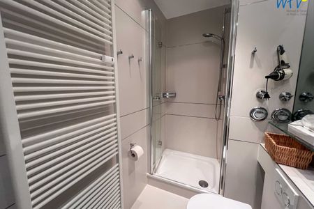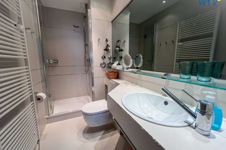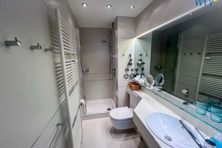Für zusätzlichen Wohnkomfort sorgt das elegante Badezimmer mit Dusche, breitem Waschtisch, großem Spiegel sowie Kosmetikspiegel, Föhn und Handtuchheizung.