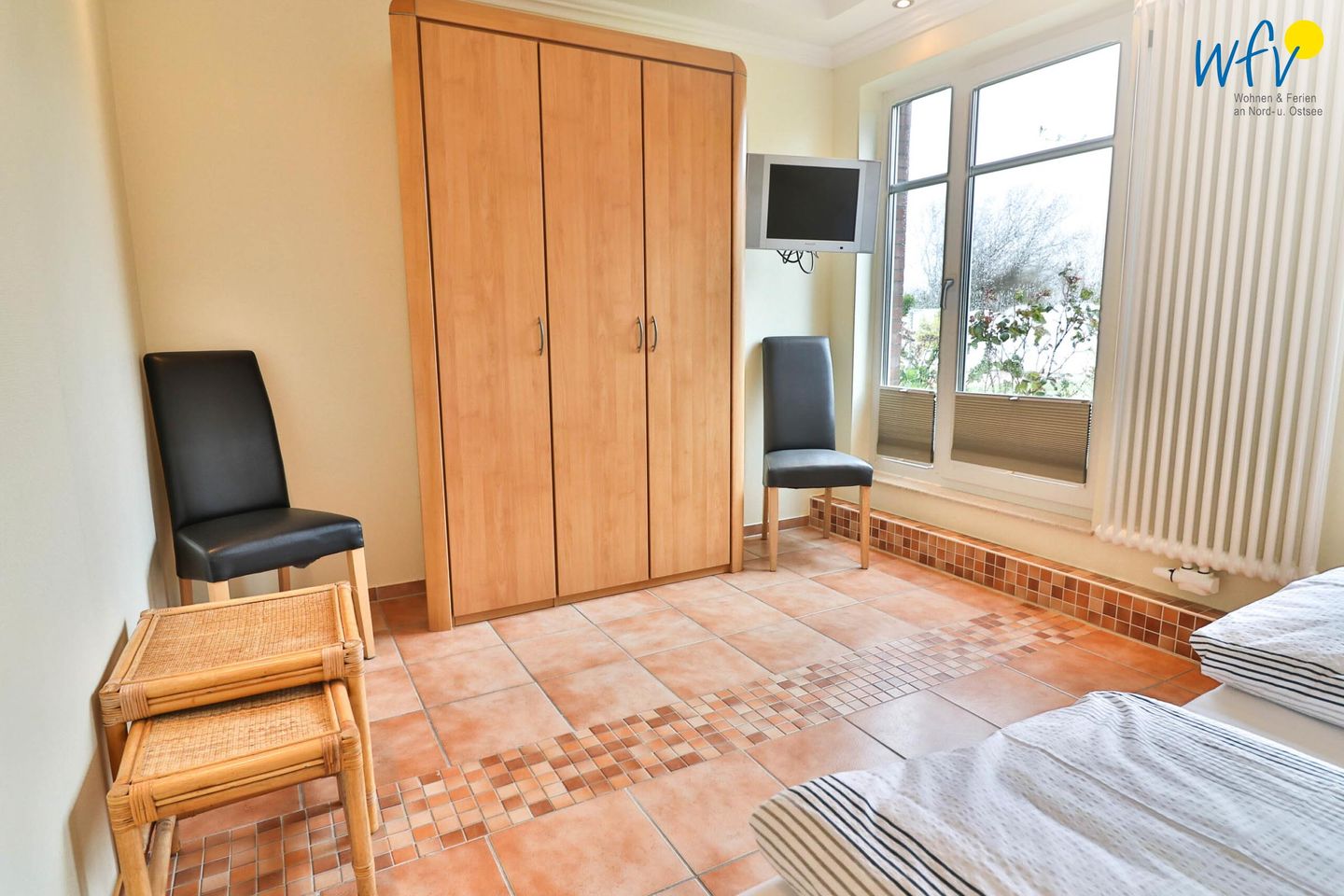 Das komfortable separate Schlafzimmer bietet Ihnen einen angenehmen Rückzugsort. Ausgestattet ist es mit einem Doppelbett (200 x 200 cm), einem geräumigen Kleiderschrank für Ihre Urlaubsgarderobe und einem TV.