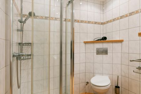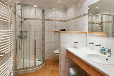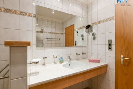 Das große moderne Badezimmer mit breitem Waschtisch, Dusche und WC sowie großem Spiegel, Handtuchheizkörper und Föhn sorgt für weiteren Wohnkomfort.