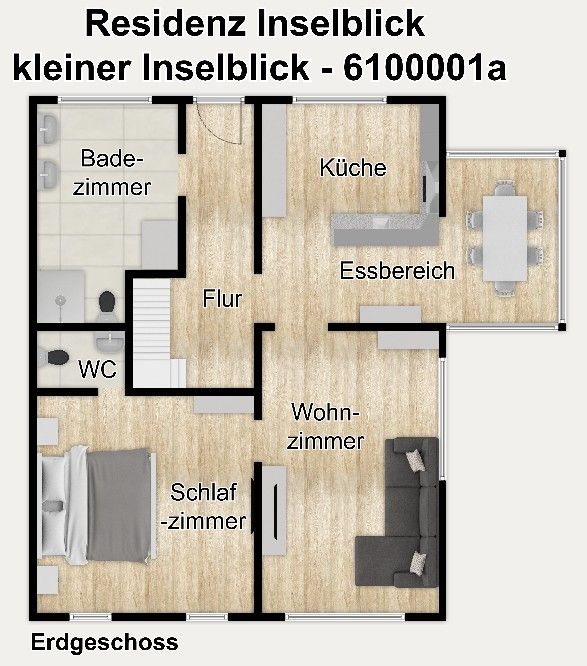Die Ferienwohnung verfügt über eine optimale Raumaufteilung - mit ansprechendem Wohnraum, offener Küche mit Essbereich (Veranda), separatem Schlafzimmer und modernem Duschbad. Wie der Name "Kleiner Inselblick" verspricht, genießen Sie von der Veranda aus einen traumhaften Blick in die Salzwiesen.