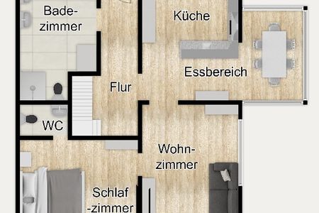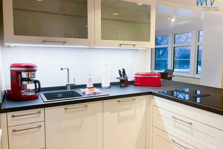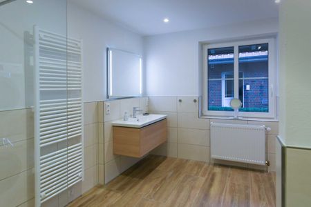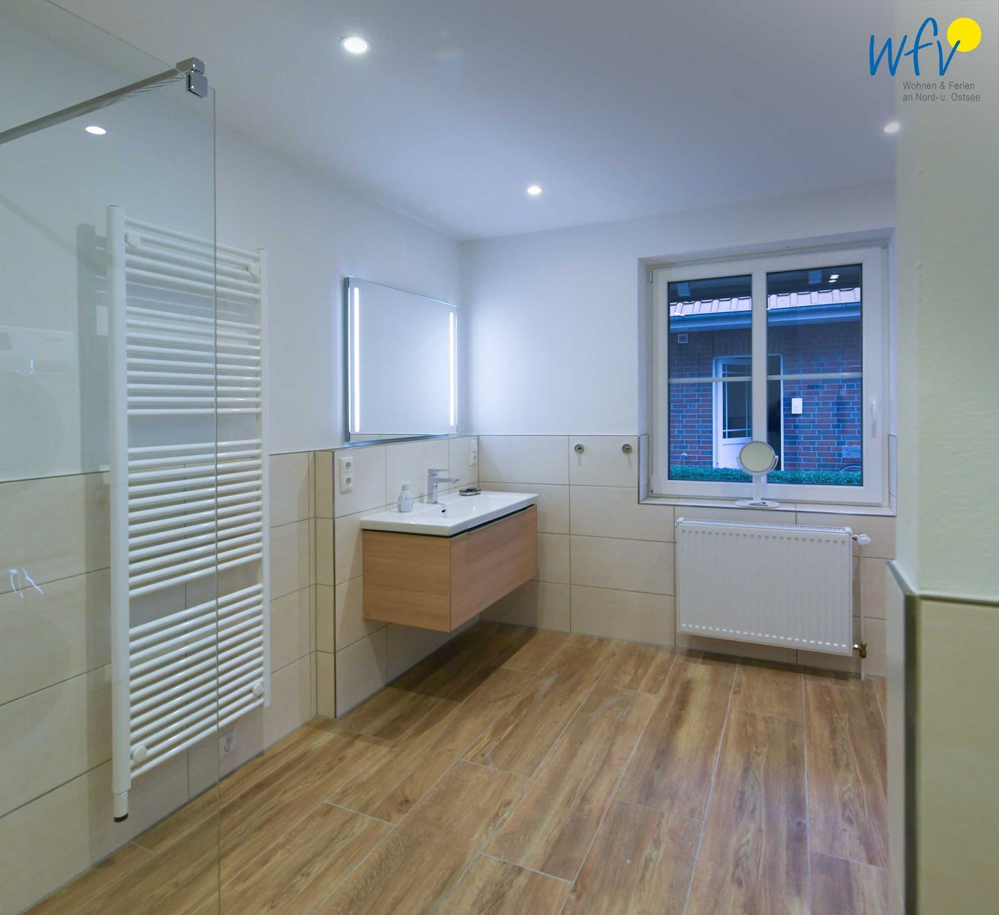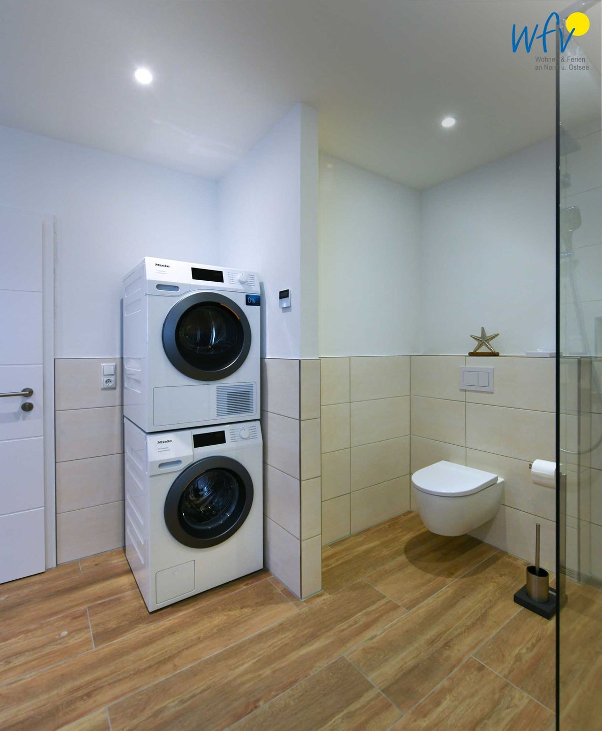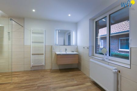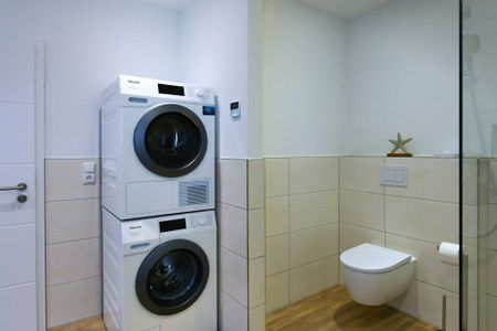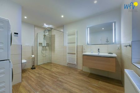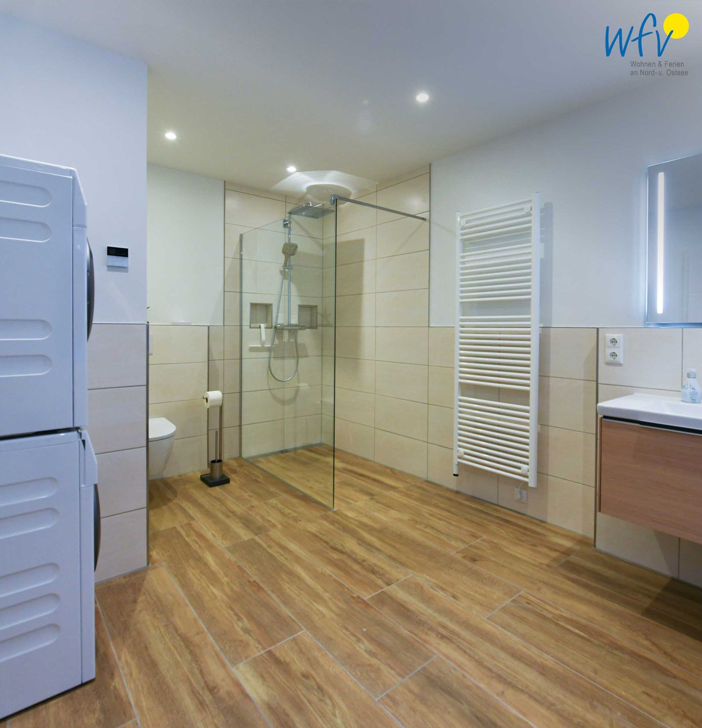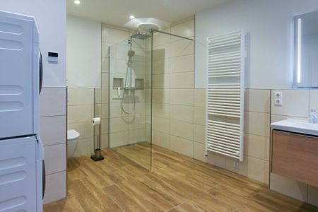 Das großzügige lichtdurchflutete Tageslichtbad mit moderner und hochwertiger Einrichtung sowie ein zusätzliches Gäste-WC sorgen für angenehme Ausweichmöglichkeiten. Eine große Regendusche (bodengleich) mit Walk-in für das ultimative Duscherlebnis, ein eleganter Waschtisch und ein Handtuchheizkörper ergänzen den Komfort. Im Bad befinden sich zudem Waschmaschine und Trockner.