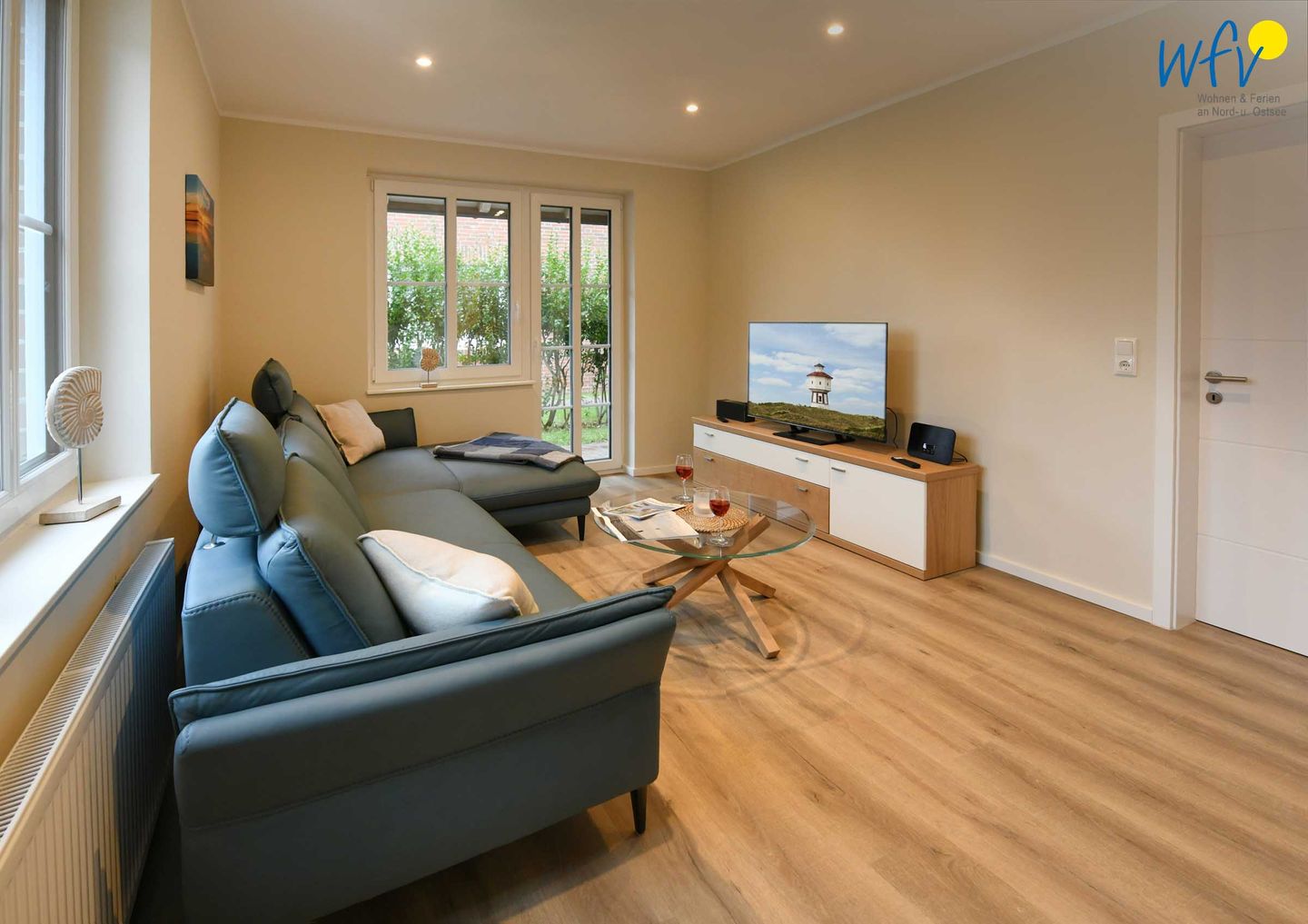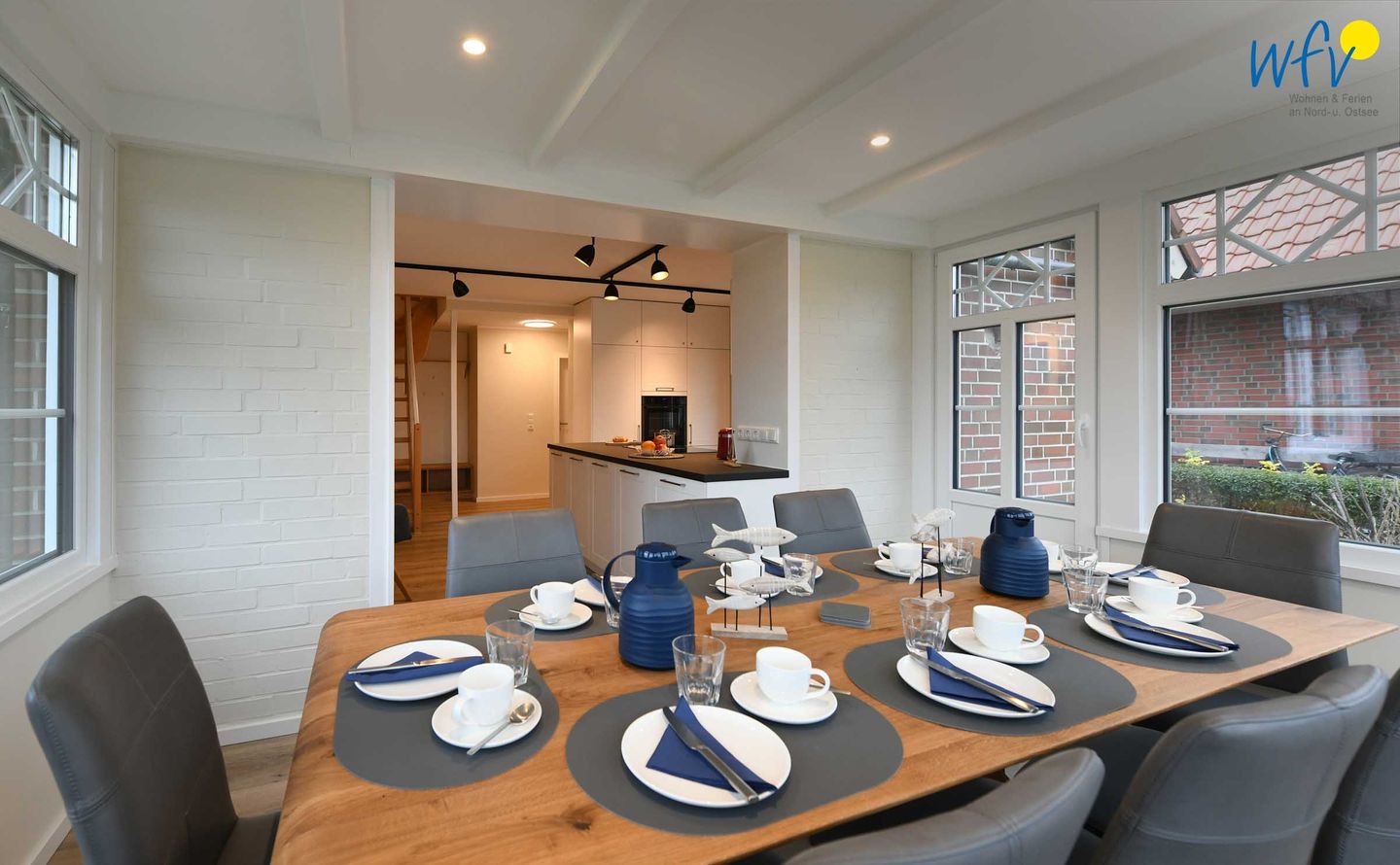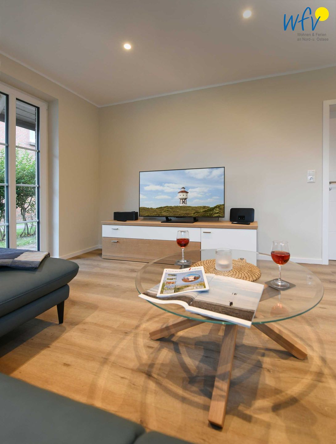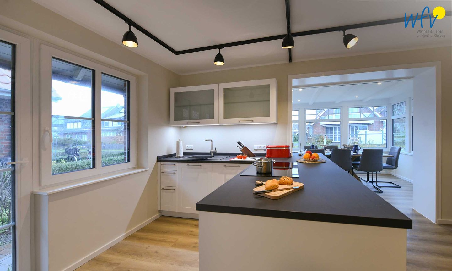Im Erdgeschoss sind Wohnbereich und Küche harmonisch miteinander verbunden und eine breite Fensterfront mit schönem Lichteinfall sorgt für ein weites Raumgefühl. Hier können Sie nach dem Strandtag oder der Fahrradtour gemütliche Stunden auf dem bequemen Sofa verbringen, fernsehen, lesen oder Musik hören. Für das gemeinsame Frühstück oder gesellige Kochabende ist die moderne Küche wie Zuhause komplett und praktisch eingerichtet - u.a. mit einem 4-Platten-Induktionsherd, einem Backofen, einem Kühlschrank mit Gefrierfach sowie einer Spülmaschine. Die angrenzende Veranda (Wintergarten) mit wunderschönem seitlichen Blick in die Salzwiesen, lädt zum romantischen Dinner ein.