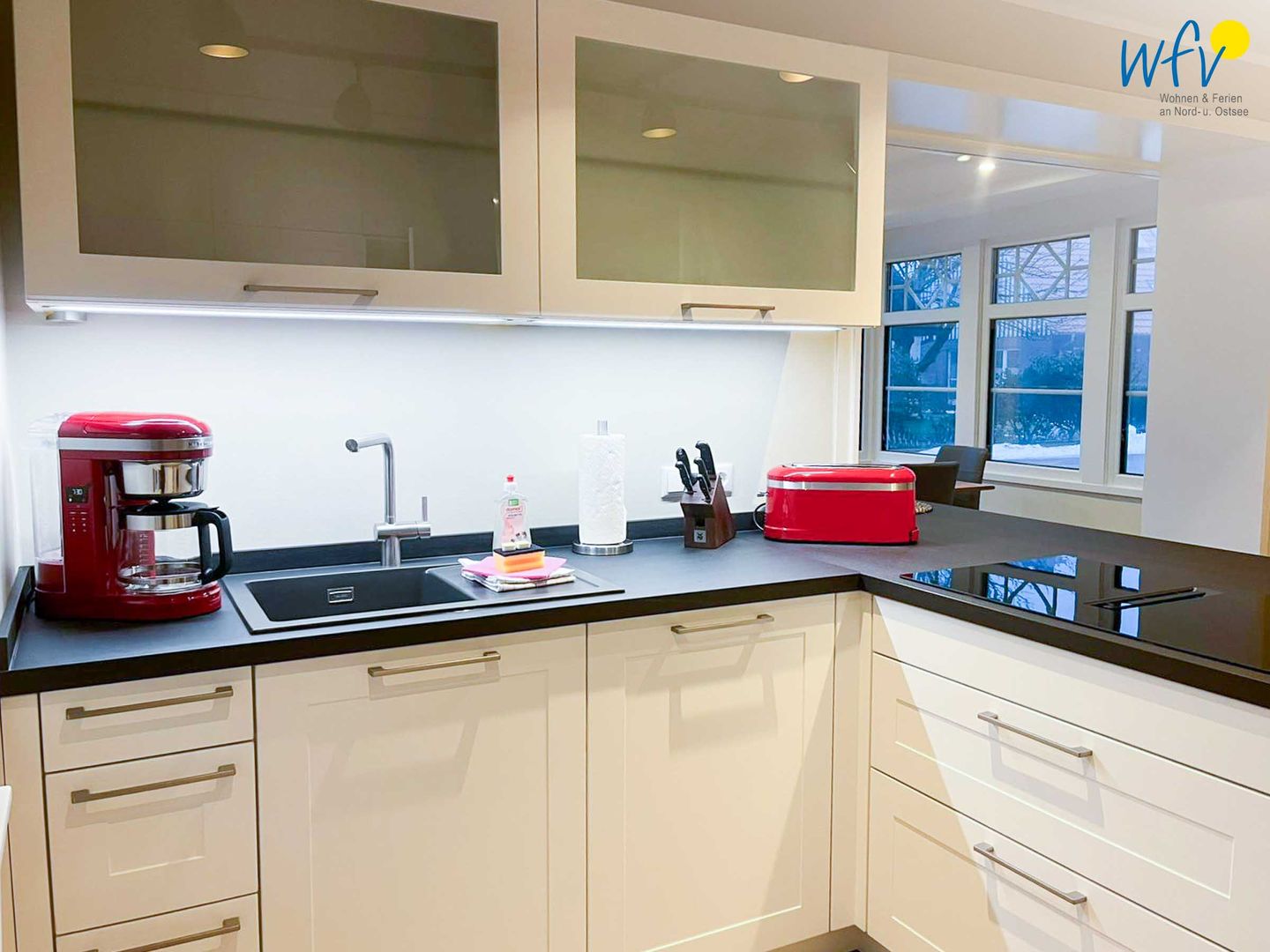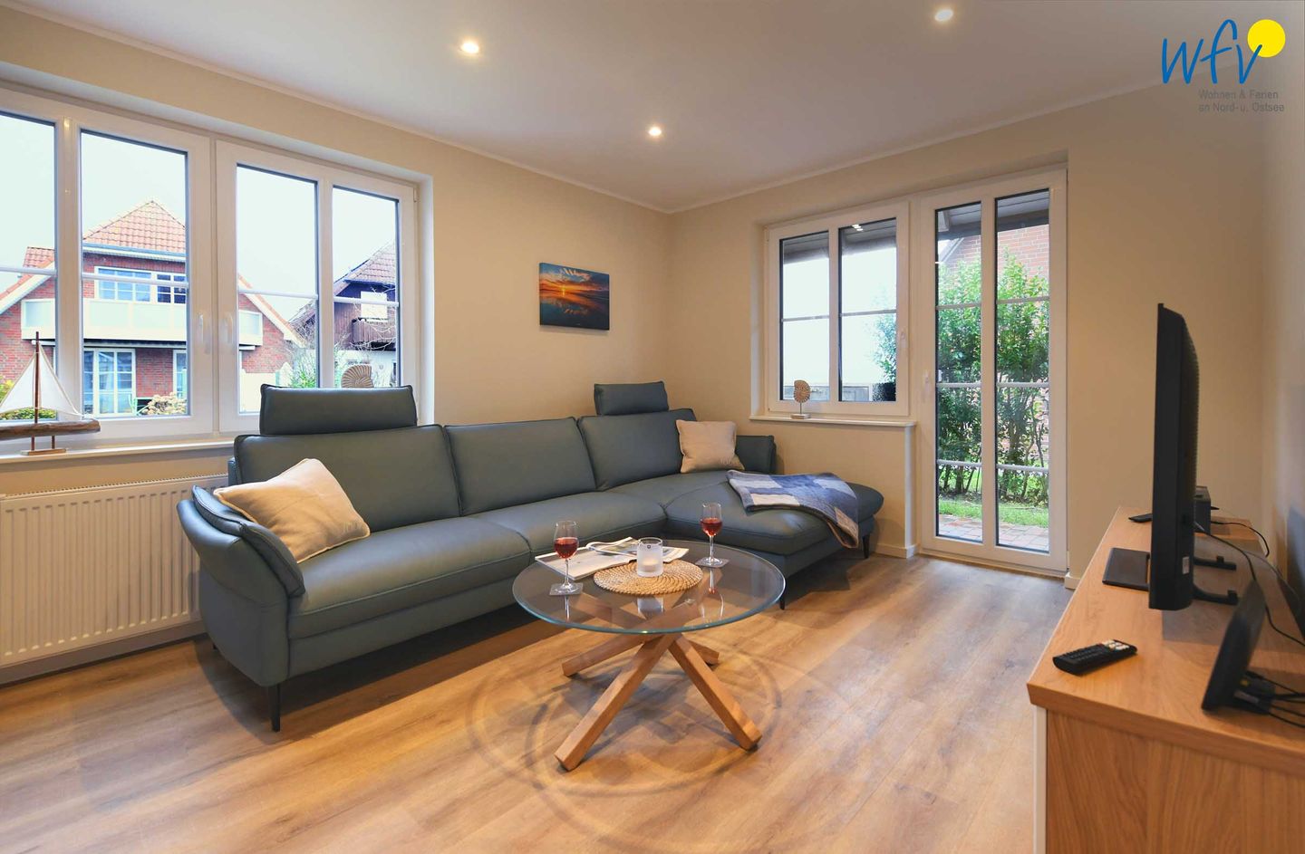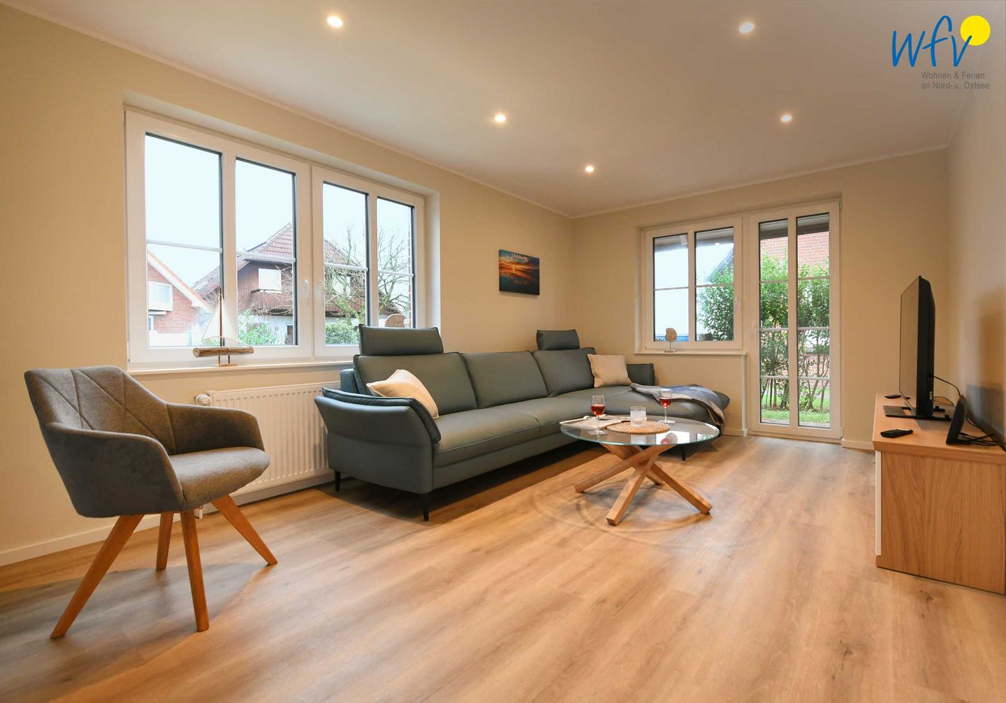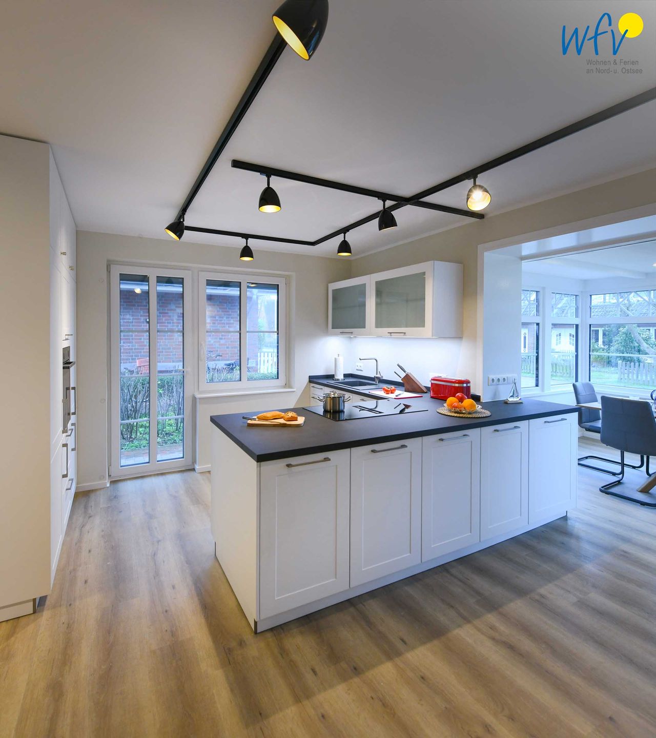 Im Erdgeschoss sind Wohnbereich und Küche harmonisch miteinander verbunden und eine breite Fensterfront mit schönem Lichteinfall sorgt für ein weites Raumgefühl. Hier können Sie nach dem Strandtag oder der Fahrradtour gemütliche Stunden auf dem bequemen Sofa verbringen, fernsehen, lesen oder Musik hören. Für das gemeinsame Frühstück oder gesellige Kochabende ist die moderne Küche wie Zuhause komplett und praktisch eingerichtet - u.a. mit einem 4-Platten-Induktionsherd, einem Backofen, einem Kühlschrank mit Gefrierfach sowie einer Spülmaschine. Die angrenzende Veranda (Wintergarten) mit wunderschönem seitlichen Blick in die Salzwiesen, lädt zum romantischen Dinner ein.