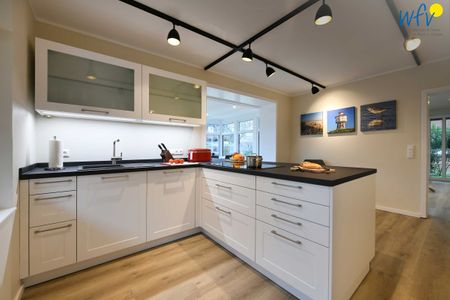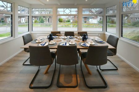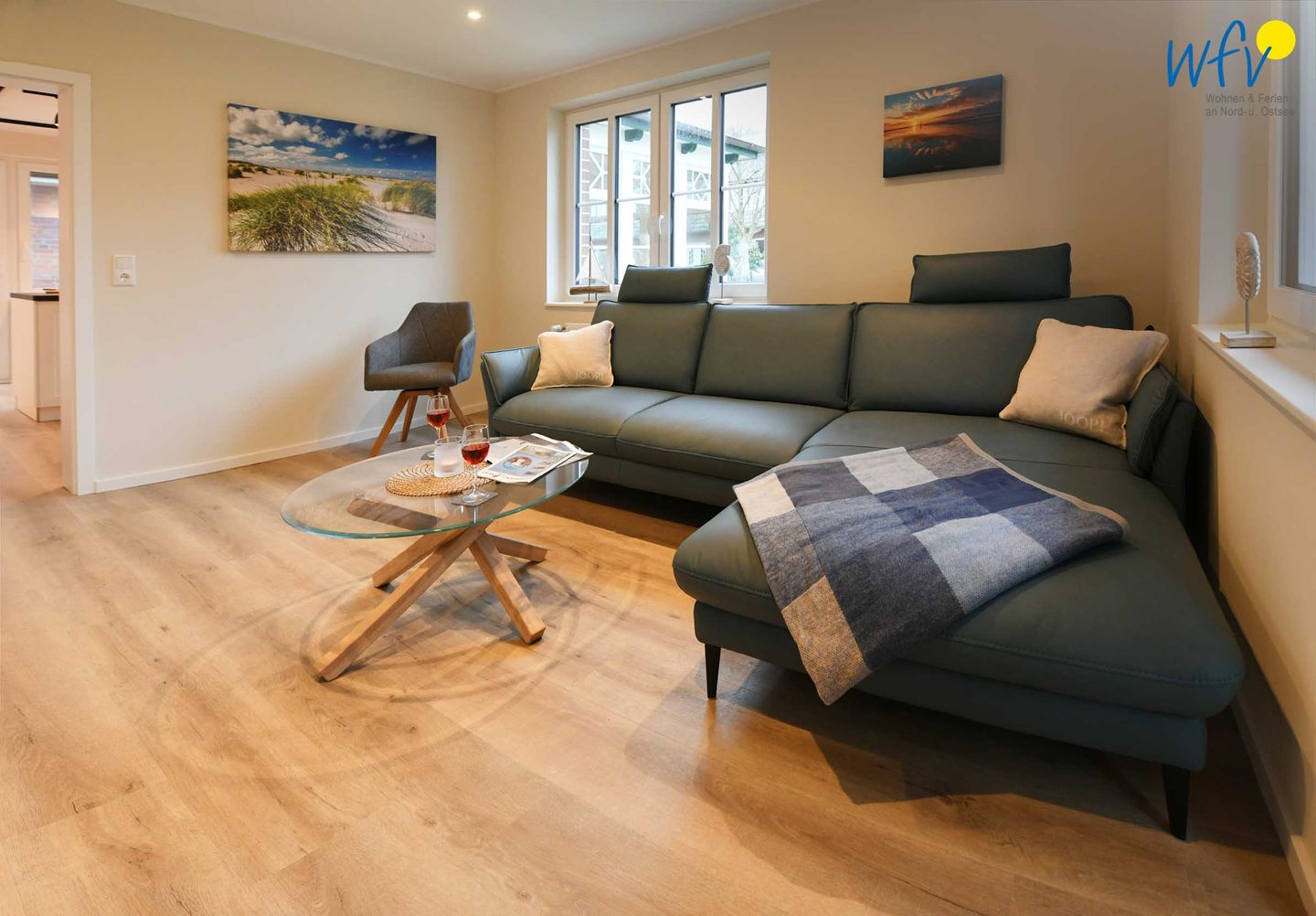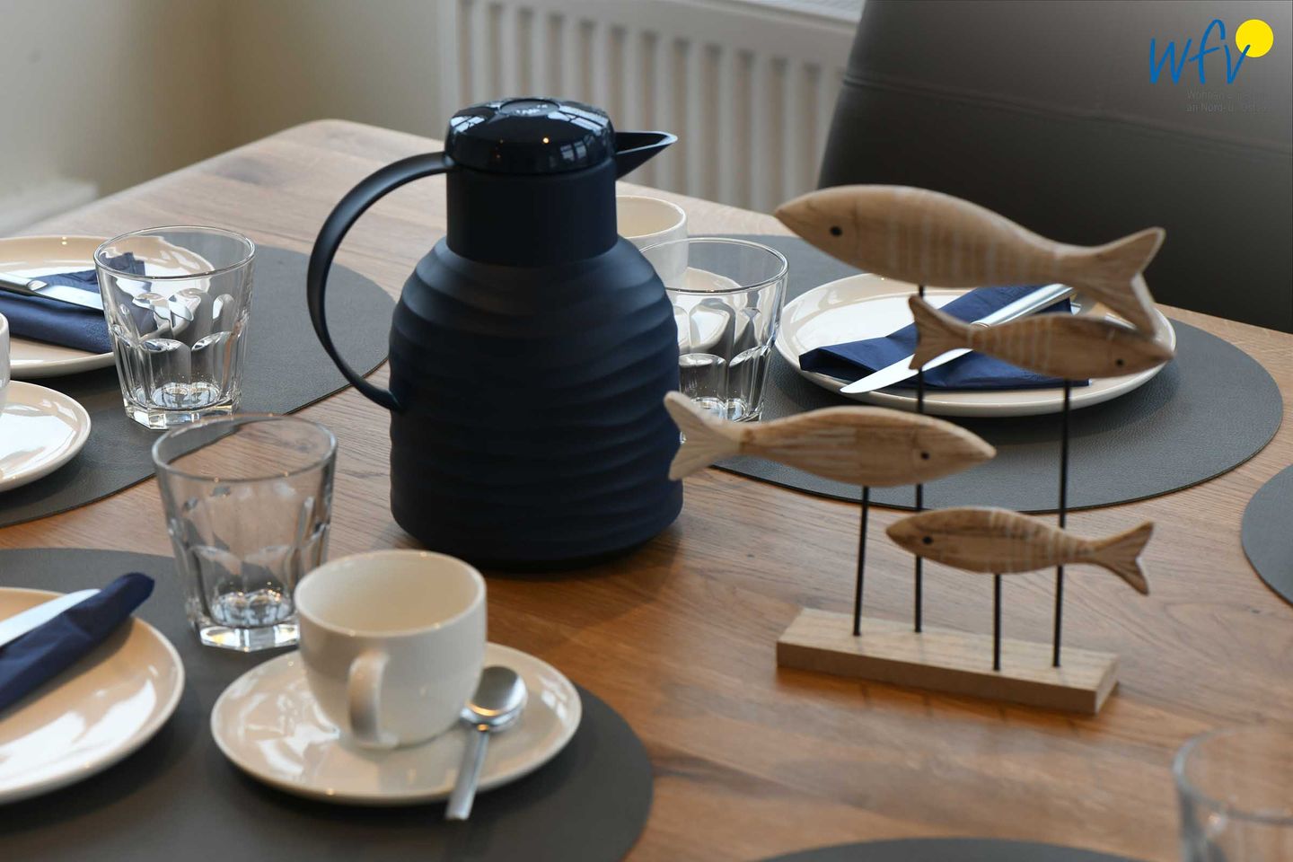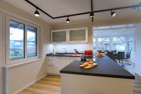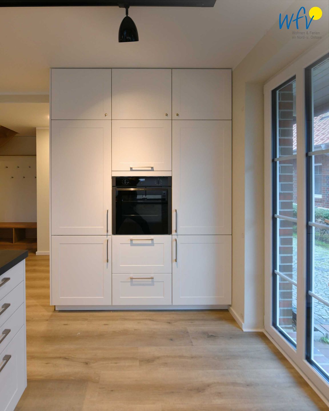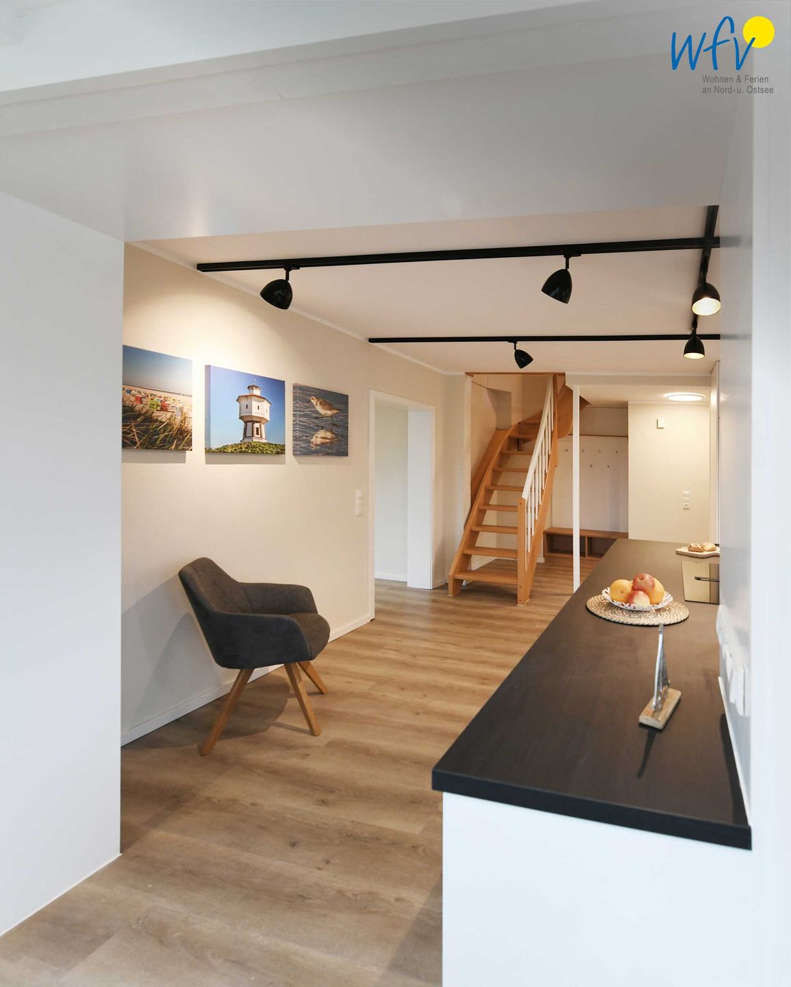Im Erdgeschoss sind Wohnbereich und Küche harmonisch miteinander verbunden und eine breite Fensterfront mit schönem Lichteinfall sorgt für ein weites Raumgefühl. Hier können Sie nach dem Strandtag oder der Fahrradtour gemütliche Stunden auf dem bequemen Sofa verbringen, fernsehen, lesen oder Musik hören. Für das gemeinsame Frühstück oder gesellige Kochabende ist die moderne Küche wie Zuhause komplett und praktisch eingerichtet - u.a. mit einem 4-Platten-Induktionsherd, einem Backofen, einem Kühlschrank mit Gefrierfach sowie einer Spülmaschine. Die angrenzende Veranda (Wintergarten) mit wunderschönem seitlichen Blick in die Salzwiesen, lädt zum romantischen Dinner ein.