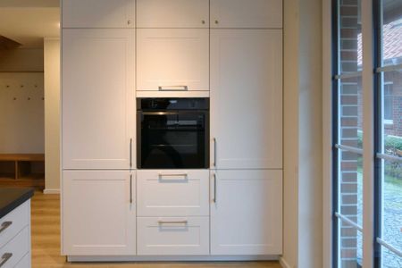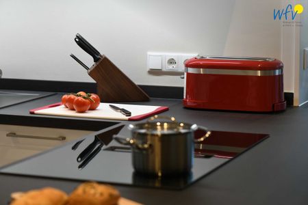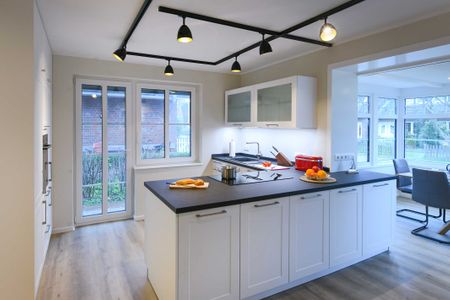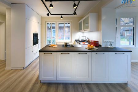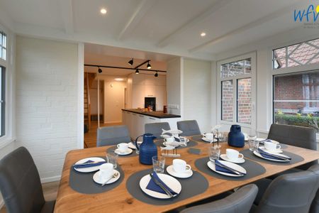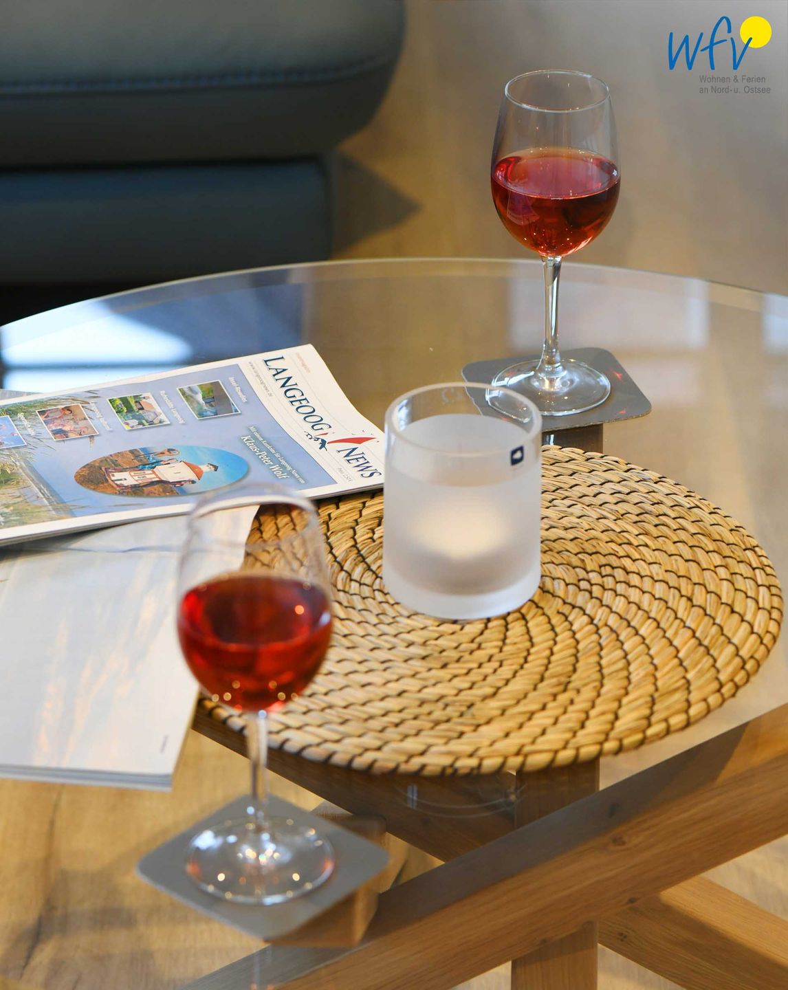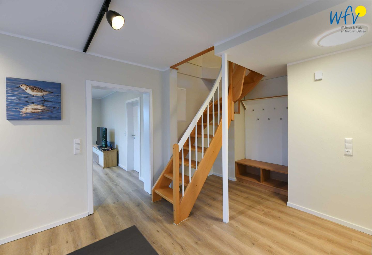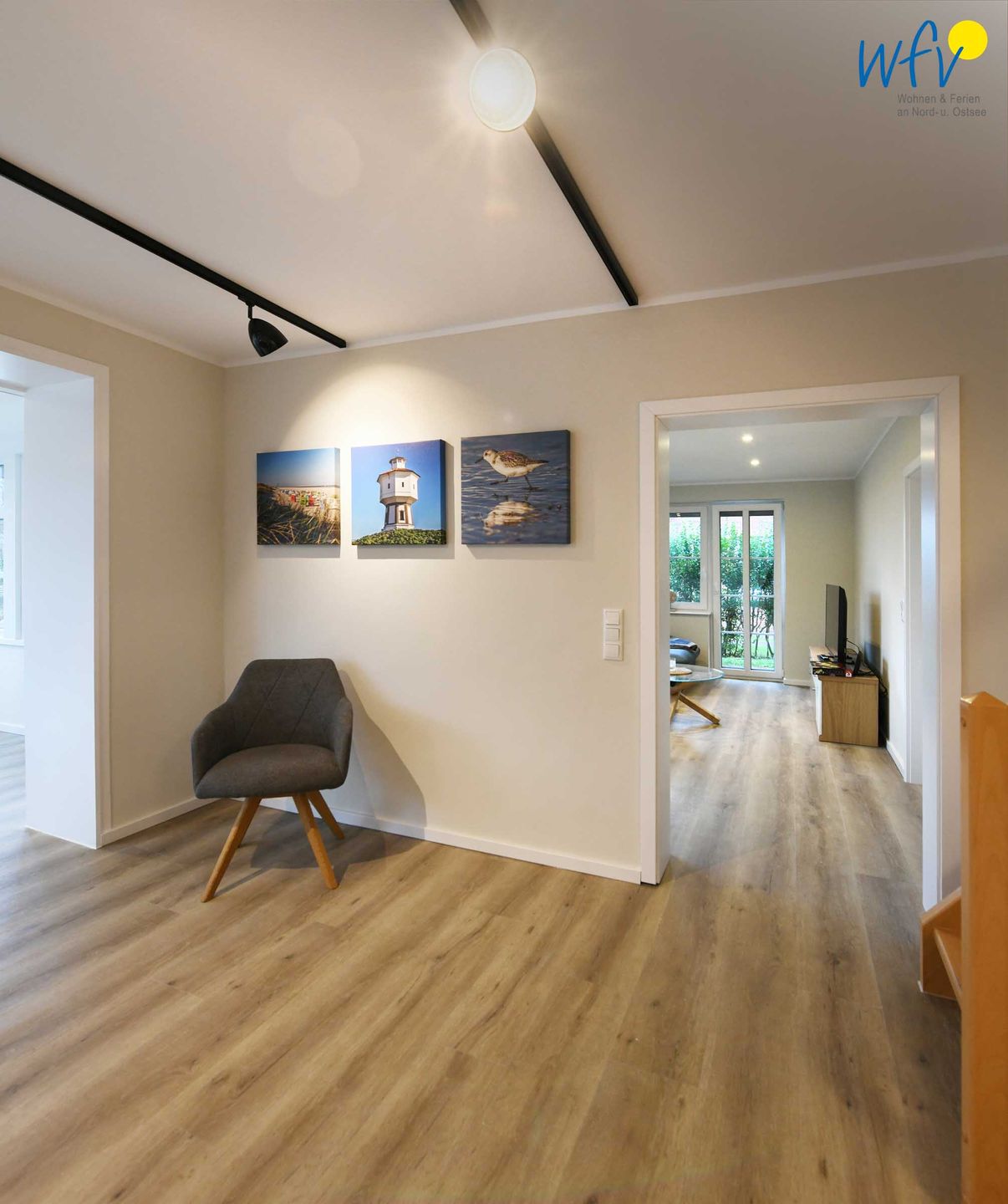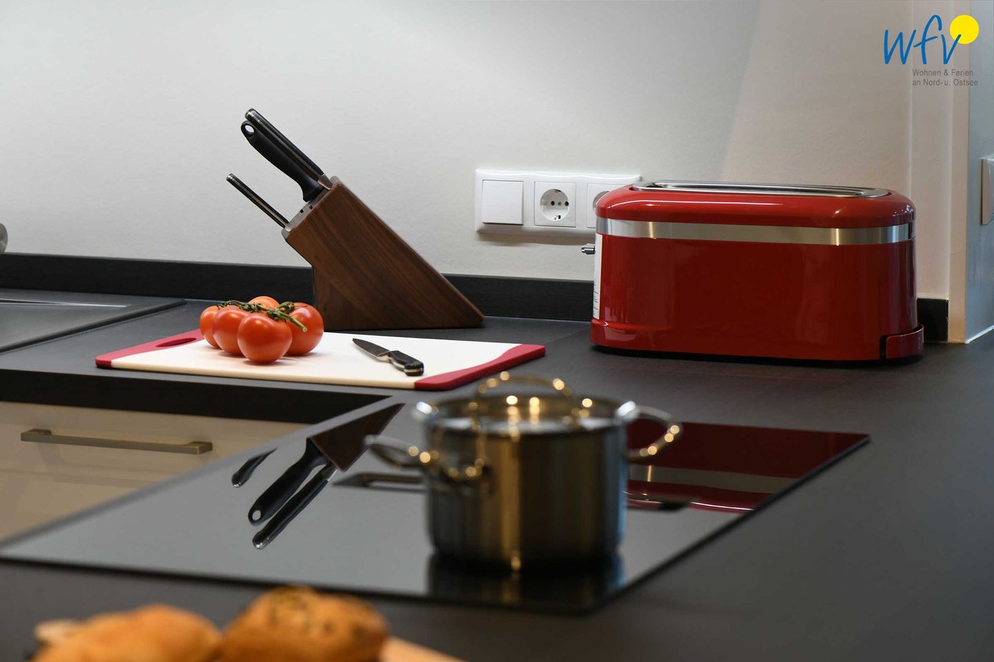 Im Erdgeschoss sind Wohnbereich und Küche harmonisch miteinander verbunden und eine breite Fensterfront mit schönem Lichteinfall sorgt für ein weites Raumgefühl. Hier können Sie nach dem Strandtag oder der Fahrradtour gemütliche Stunden auf dem bequemen Sofa verbringen, fernsehen, lesen oder Musik hören. Für das gemeinsame Frühstück oder gesellige Kochabende ist die moderne Küche wie Zuhause komplett und praktisch eingerichtet - u.a. mit einem 4-Platten-Induktionsherd, einem Backofen, einem Kühlschrank mit Gefrierfach sowie einer Spülmaschine. Die angrenzende Veranda (Wintergarten) mit wunderschönem seitlichen Blick in die Salzwiesen, lädt zum romantischen Dinner ein.