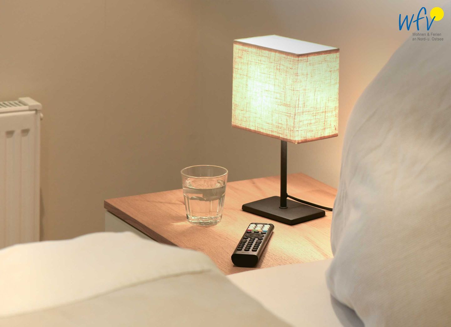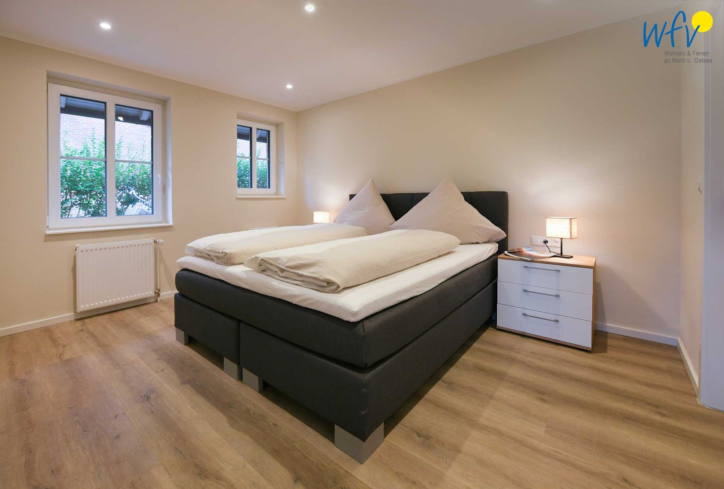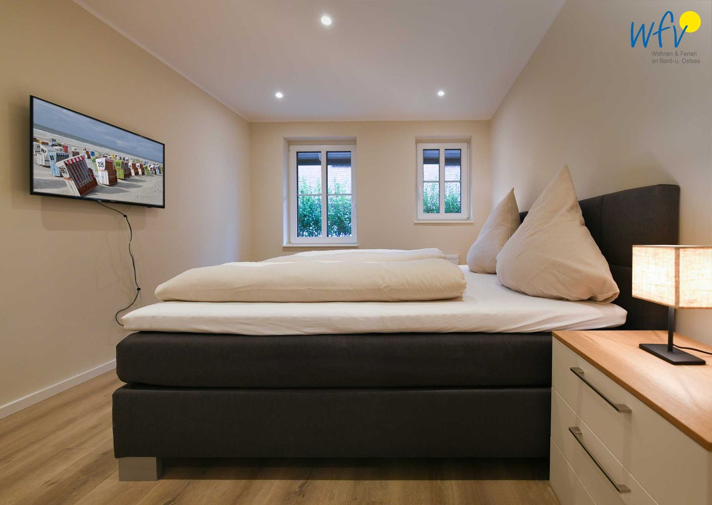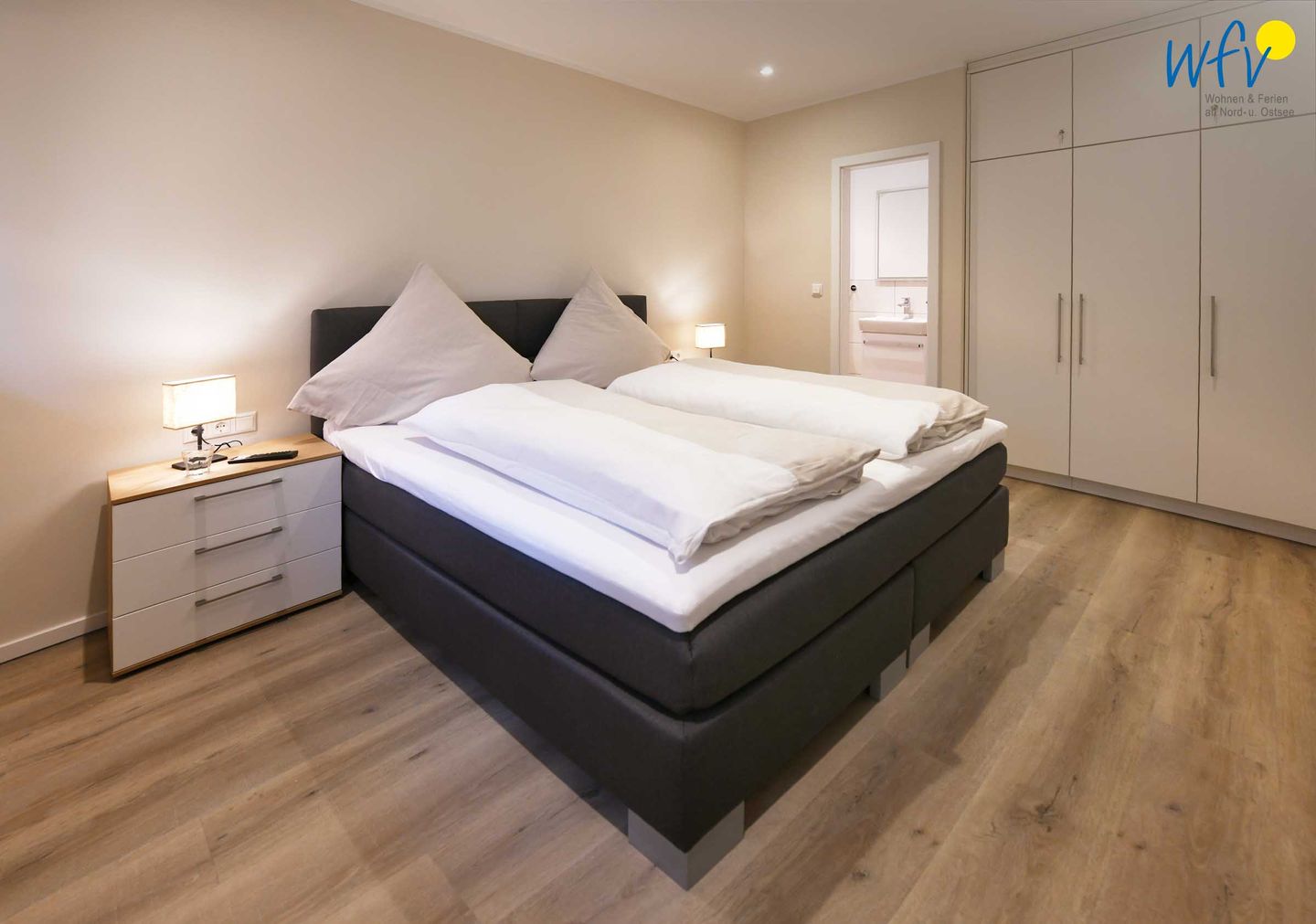 Das separate Schlafzimmer mit komfortablem Doppelbett (180 x 200 cm) ist elegant und harmonisch eingerichtet. Genau richtig, um ausgiebig zu entspannen. Ein Kleiderschrank bietet ausreichend Platz für Ihre Urlaubsgarderobe.