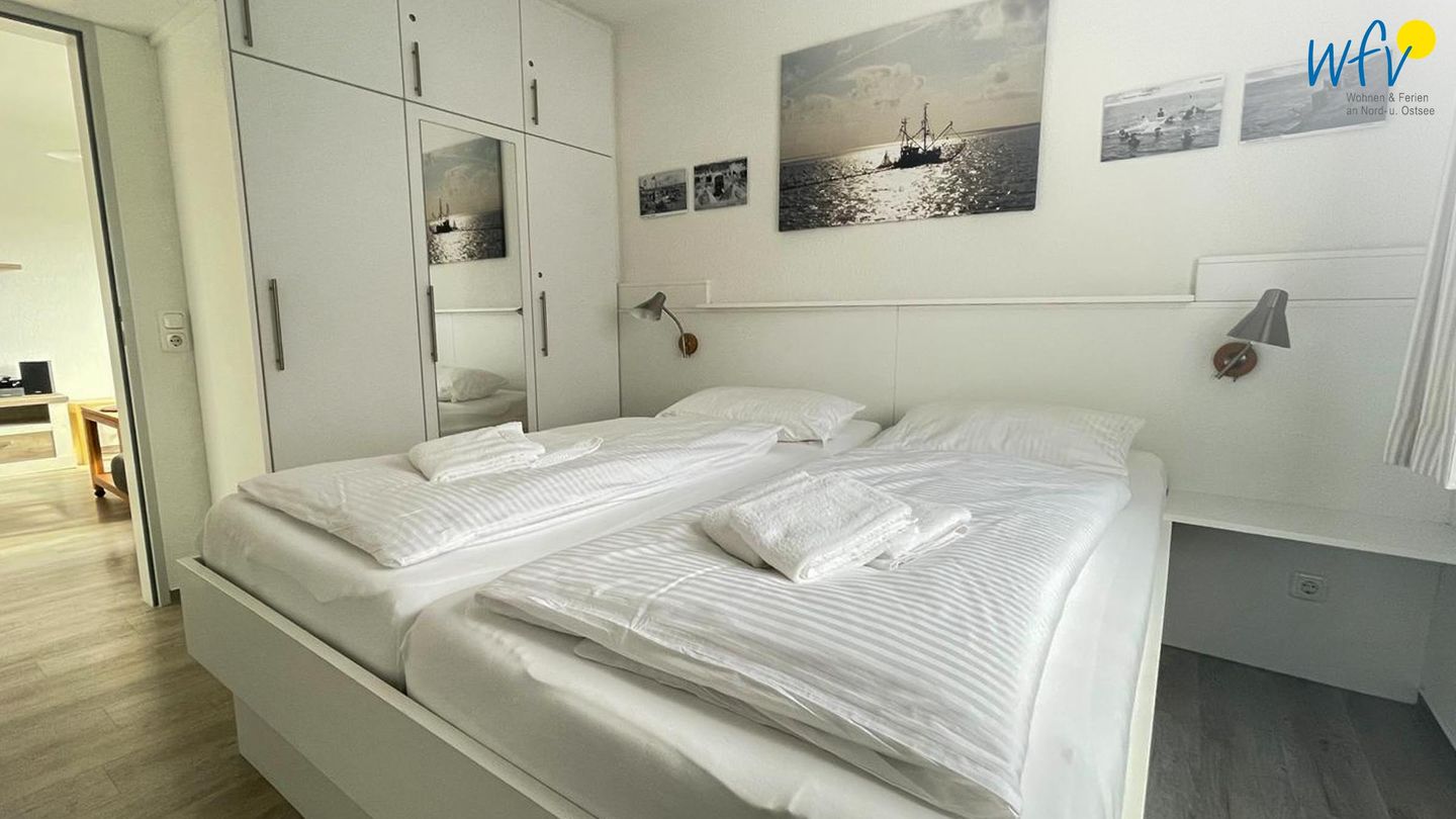 Für eine angenehme Nachtruhe ist das separate Schlafzimmer mit einem Doppelbett (180 x 200 cm) ausgestattet. Im Kleiderschrank lässt sich bequem Ihre Urlaubsgarderobe verstauen. Ein weiterer Schlafplatz besteht durch das Komfort-Schlafsofa im Wohnraum (140 x 200 cm). Leider sind keine Kleinkinder möglich, da es im Schlafzimmer keinen Stellplatz für ein Kinderbett gibt .