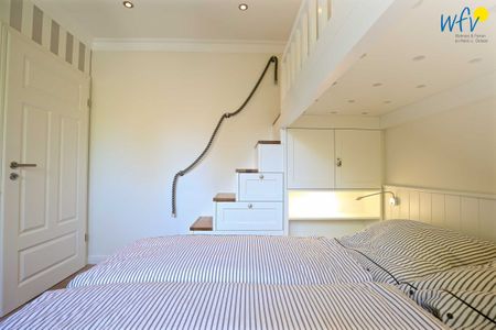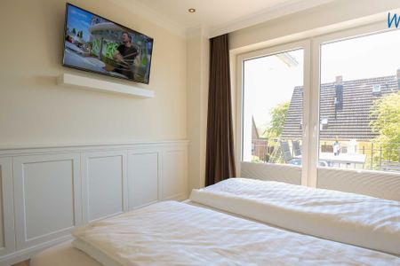 Der helle Lichteinfall, stilvolle Möbel in harmonischer Farbgebung und maritime Accessoires sorgen für schönes Flair und das entsprechende Nordseegefühl. Eine Fußbodenheizung und charmante Holzdielen bieten zusätzlichen Wohnkomfort und an kühleren Tagen wohlige Wärme. Der Essplatz mit schönem Blick ins Grüne lädt zum ausgiebigen Ferienfrühstück ein, die Couchecke mit moderner Unterhaltungstechnik von Sonos und Panasonic zu gemütlichen Stunden zum Entspannen und die komfortablen Betten in den zwei separaten Schlafzimmern zu erholsamer Nachtruhe.