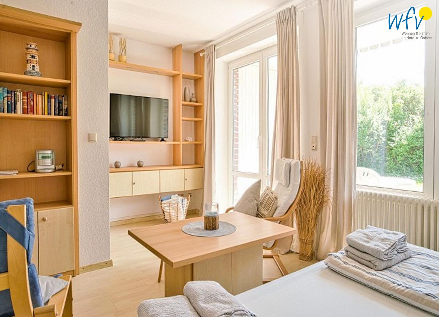 Genießen Sie Ihren morgendlichen Kaffee an dem kleinen Essplatz der offenen Küche, im gemütlichen Wohnbereich oder auf der schönen Südterrasse mit Garten. Nach der Inselerkundung oder dem Strandspaziergang können Sie es sich in der Couchecke mit SmartTV oder auf dem komfortablen Boxspringbett (180 x 200 cm) bequem machen und lesen, fernsehen oder Musik hören. Zum Surfen vom Smartphone aus empfangen Sie freies WLAN. In der offenen Küche lassen sich leckere Snacks und köstliche Gerichte zubereiten. Ausgestattet ist sie u.a. mit Ceranherd, Backofen, Mikrowelle und Spülmaschine.