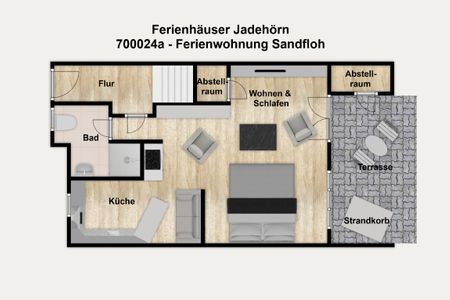Die helle und freundliche Atmosphäre lädt auf Anhieb zum Entspannen und Wohlfühlen ein; maritime Accessoires sorgen für die entsprechende Nordseenote. Das Bonbon der "Ferienwohnung Sandfloh" ist die schöne überdachte Südterrasse, die mit Gartenmöbeln und Strandkorb zur Erholung im Freien einlädt. Hier können Sie bei Sonne (ganztägig) und auch bei Regen ungestört entspannen.