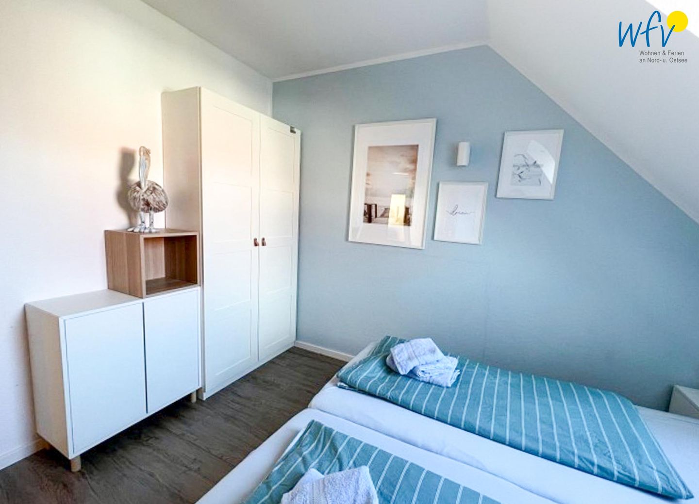 Zwei separate Schlafzimmer bieten Ihnen angenehme Rückzugsmöglichkeiten. Eines befindet sich auf der ersten Etage und verfügt über ein Doppelbett (160 x 200 cm) und ein TV. Das zweite Zimmer liegt im OG und ist mit zwei Einzelbetten eingerichtet (je 100 x 200 cm).