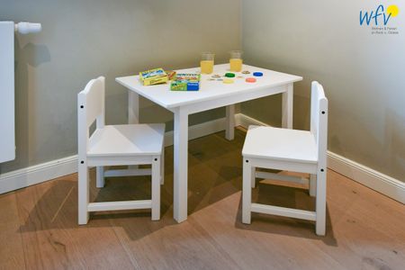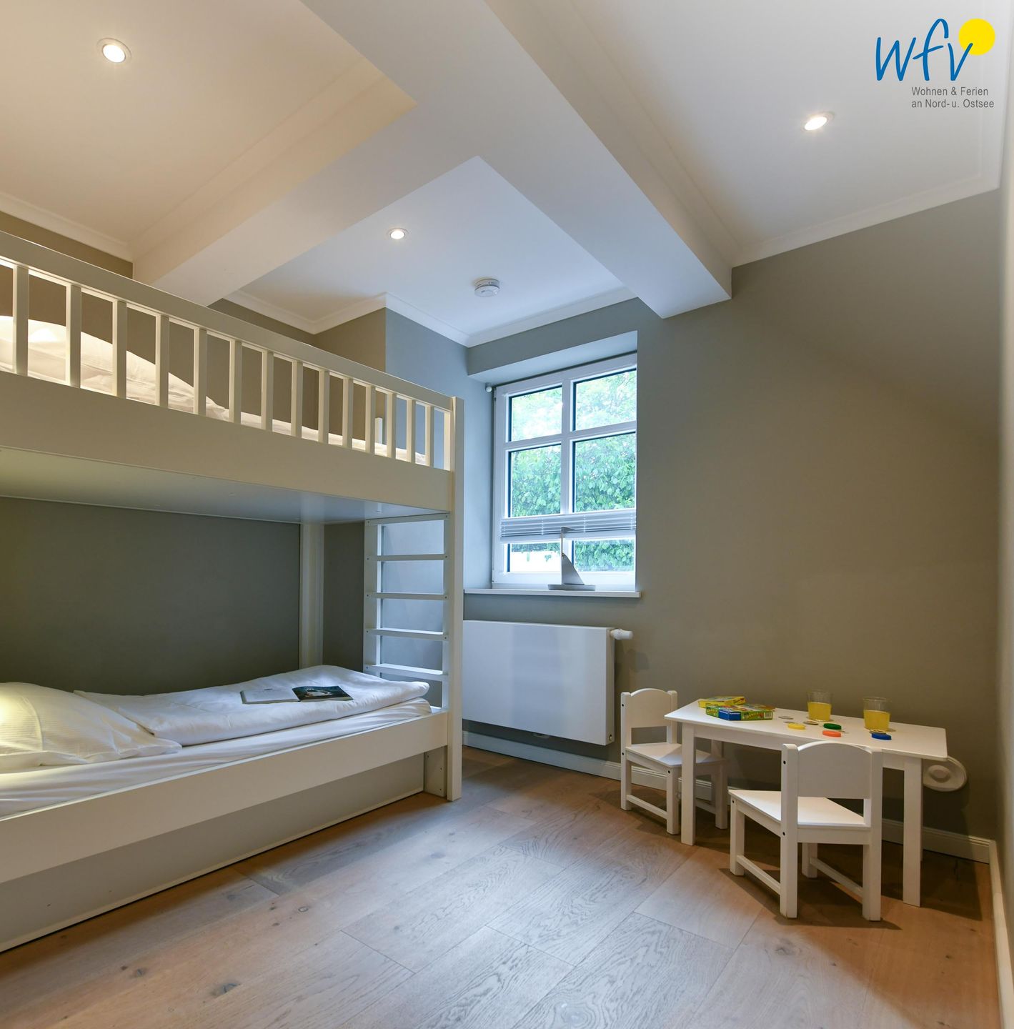Zudem liegen im EG ein Elternschlafzimmer mit komfortablem Boxspringbett (180 x 200 cm) und ein Kinderzimmer für unsere kleinen Gäste mit Etagenbett (je 90 x 200 cm) und einem Kinderspieltisch.