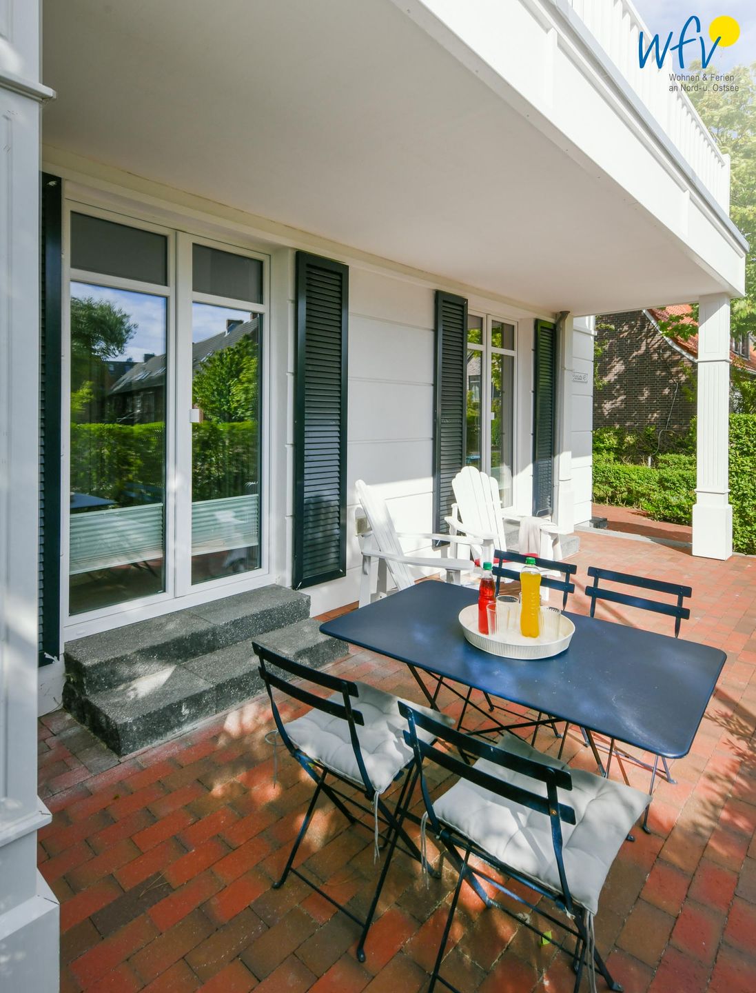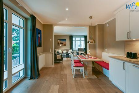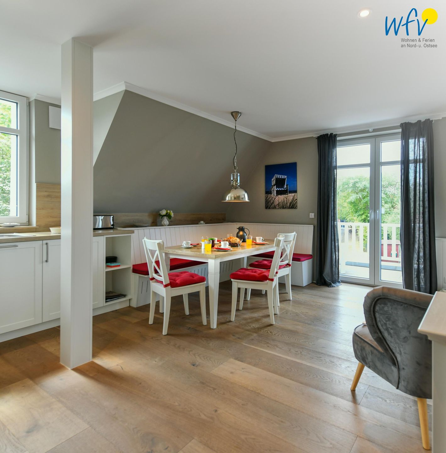 Im Erdgeschoss befindet sich ein gemütlicher Wohn-/Essbereich – u.a. mit Ceran-Kochfeld, Geschirrspüler und Backofen - sodass sich schnell und einfach leckere Gerichte zubereiten lassen. Ein Esstisch lädt zu gemeinsamen Mahlzeiten ein und die angrenzende Couchecke mit TV zu entspannten Stunden nach der Fahrradtour oder dem Strandtag. Vom Wohnraum aus gelangen Sie auf die möblierte Terrasse mit Südausrichtung, auf der Sie ausgiebige Sonnenbäder genießen können.