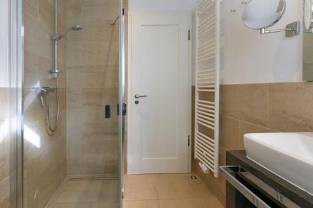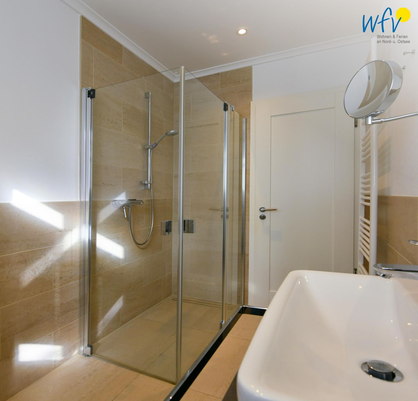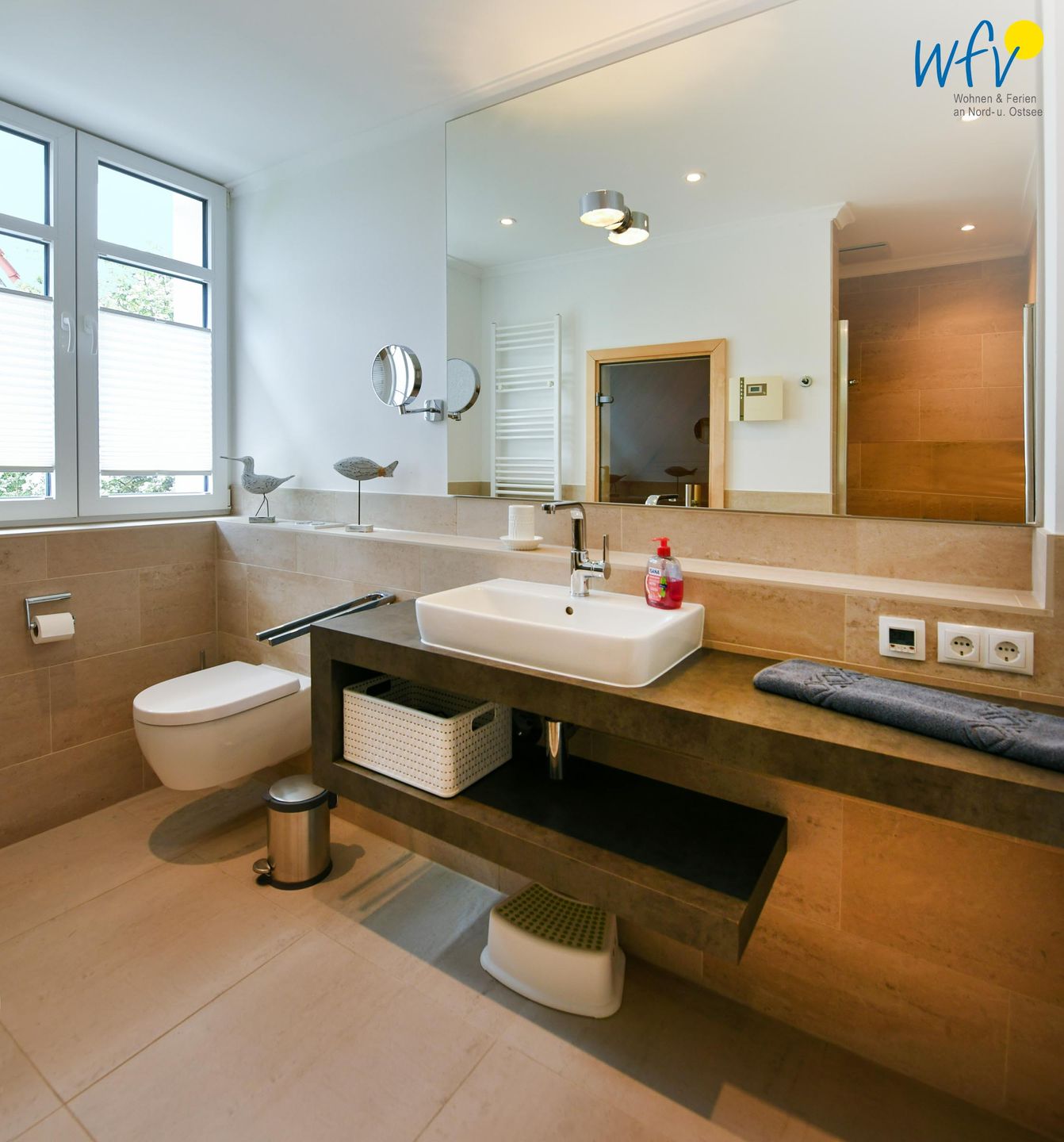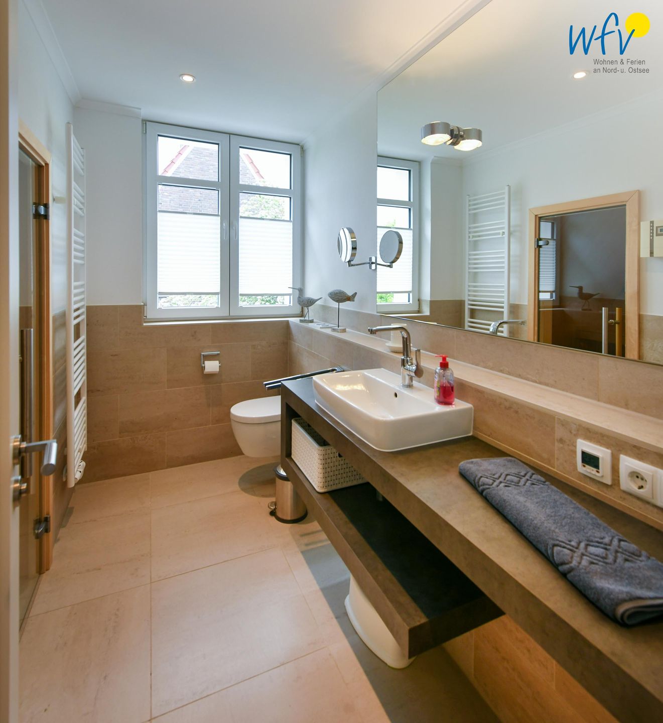 Das Tageslichtbad in elegantem Design verfügt u.a. über eine ebenerdige Dusche, eine Handtuchheizung und einen stilvollen Waschtisch mit Spiegel.